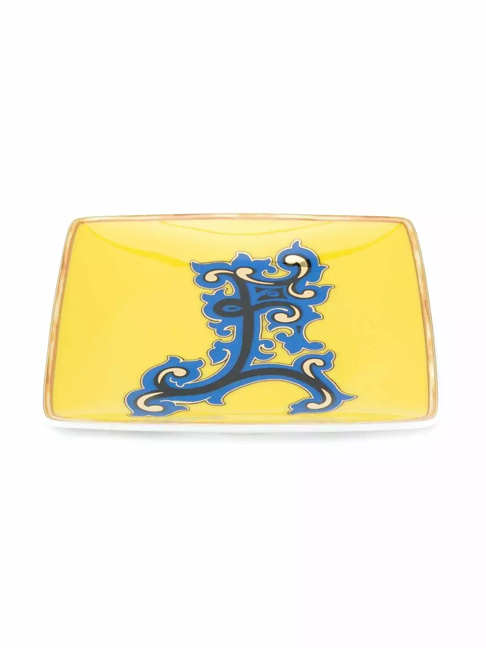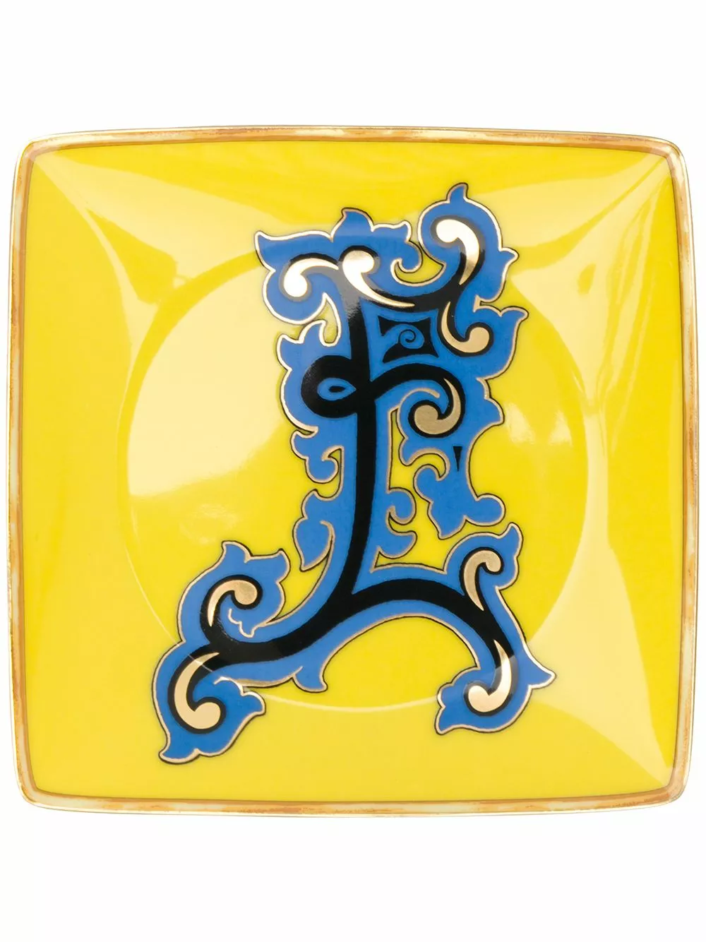 Yellow porcelain Alphabet ‘E’ plate (11cm) from Versace Home featuring a square body, a concave top and a baroque print.