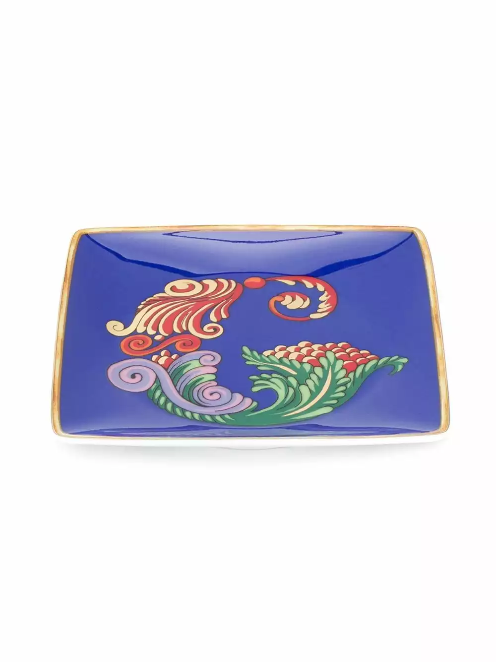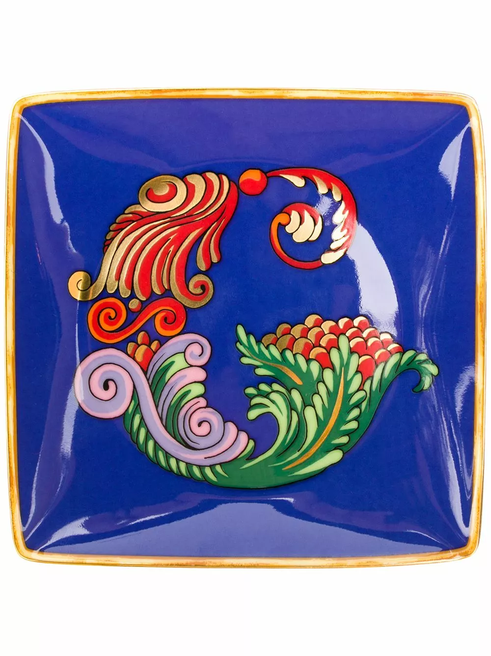 Blue porcelain Alphabet ‘G’ plate (11cm) from Versace Home featuring a square body, a concave top and a baroque print.