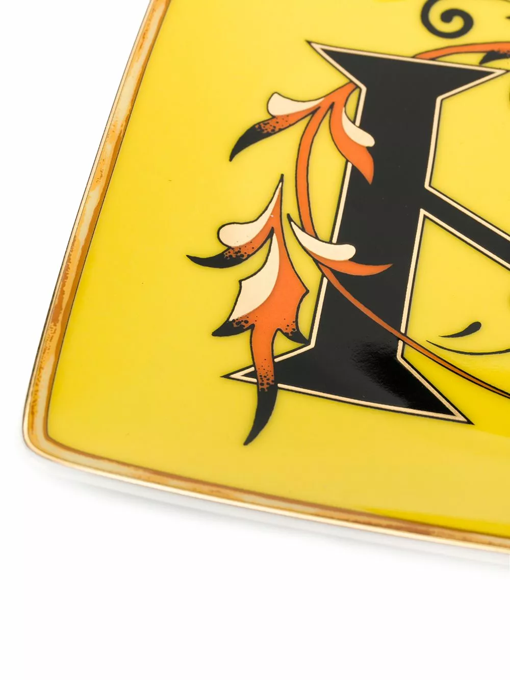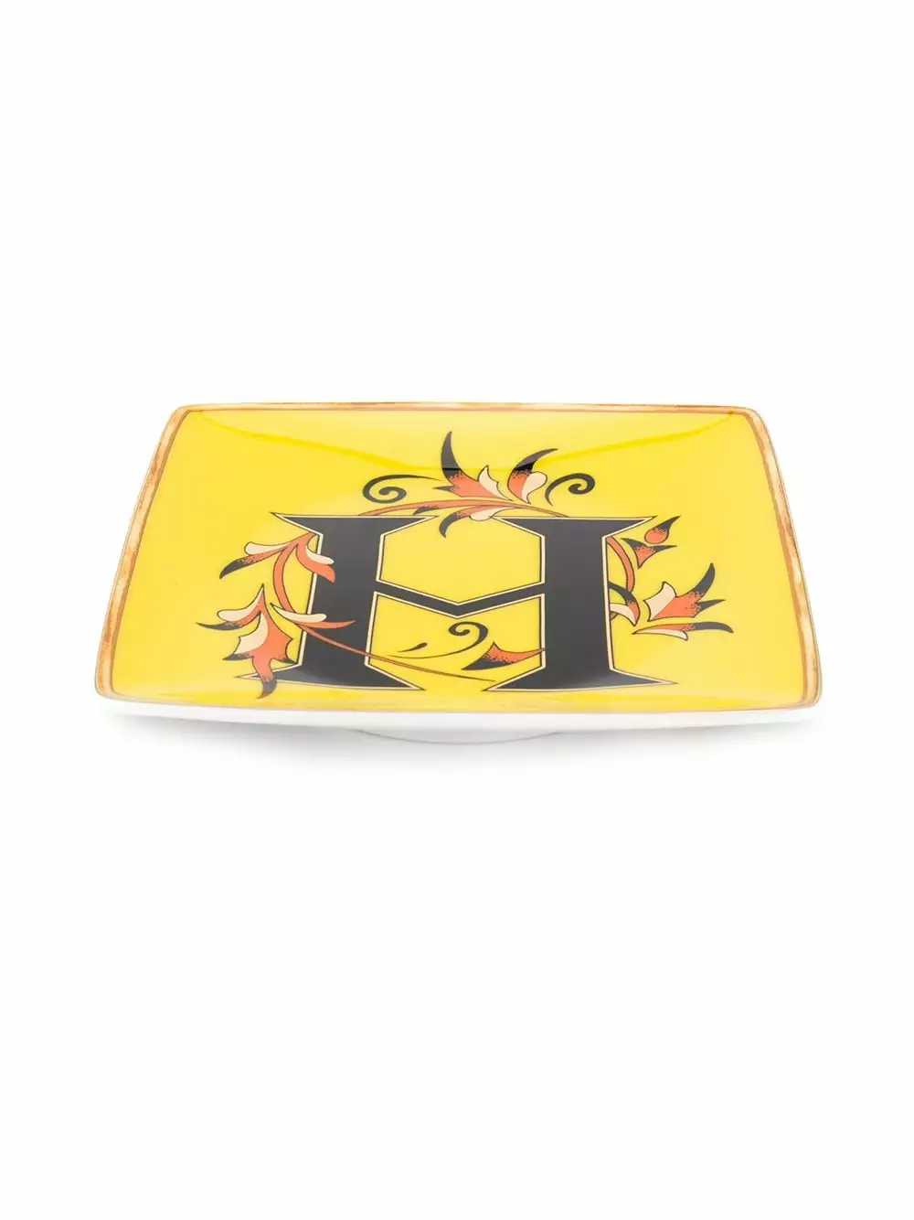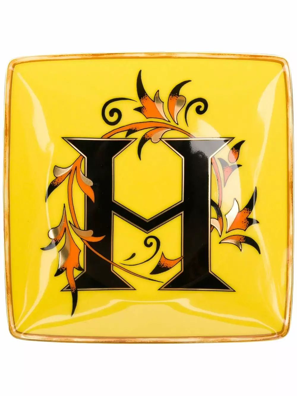 Yellow porcelain Alphabet ‘H’ plate (11cm) from Versace Home featuring a square body, a concave top and a baroque print.