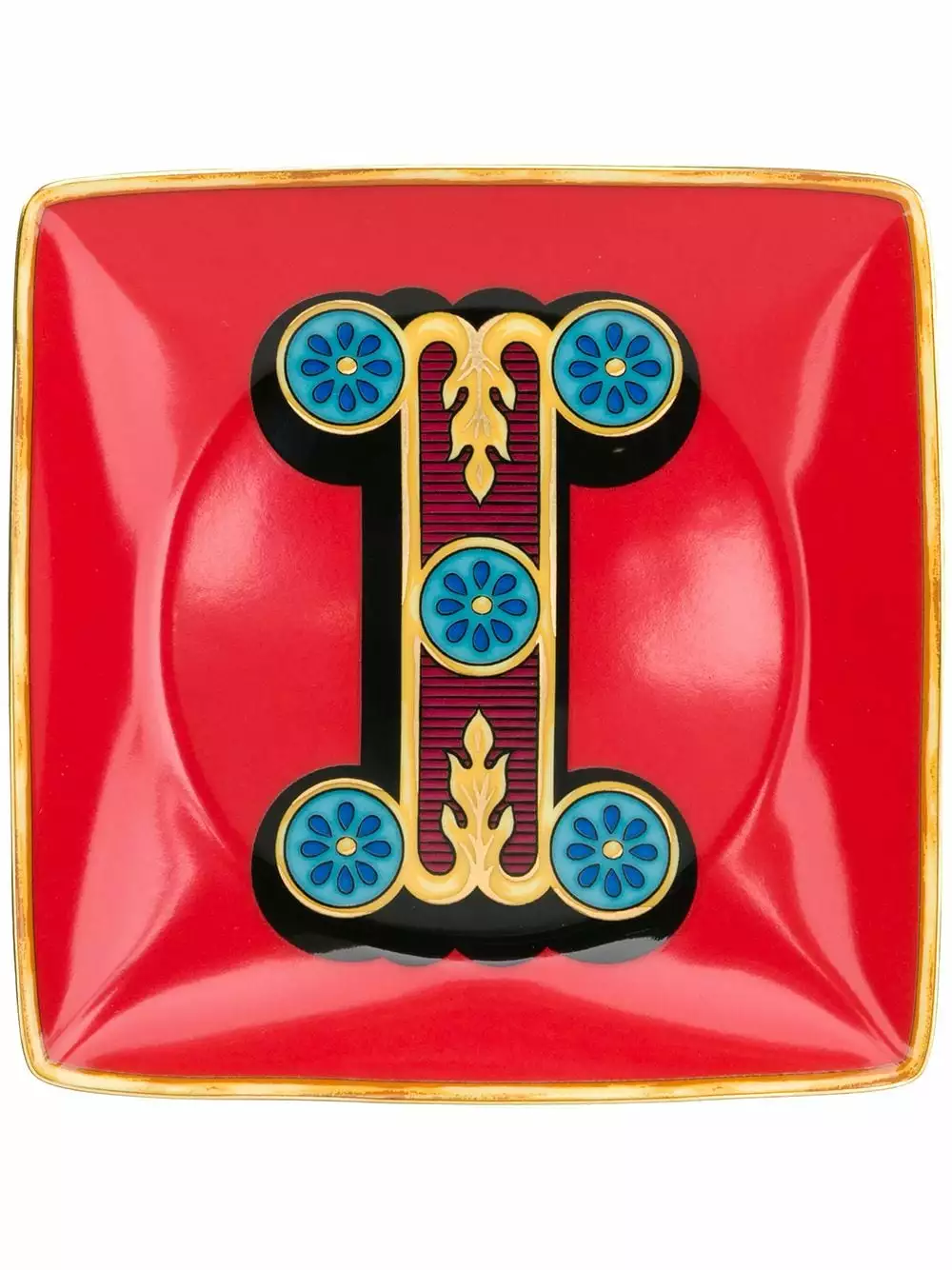 Red porcelain Alphabet ‘I’ plate (11cm) from Versace Home featuring a square body, a baroque print and a concave top.