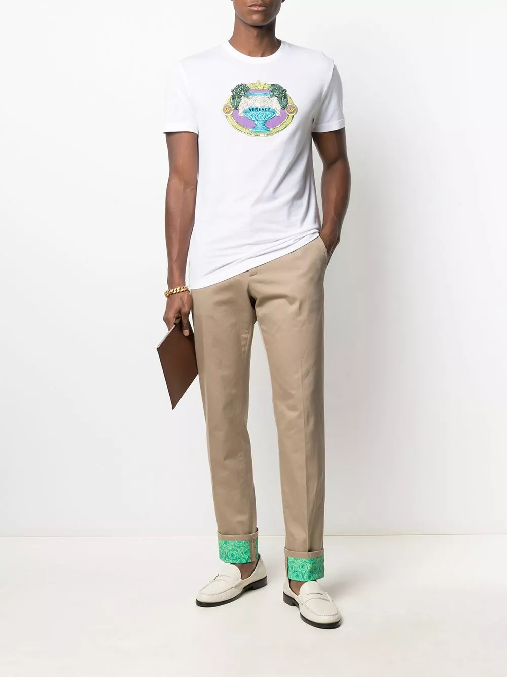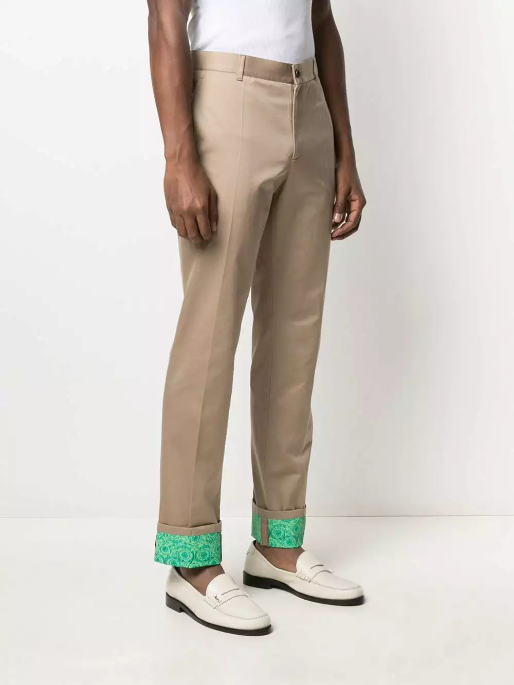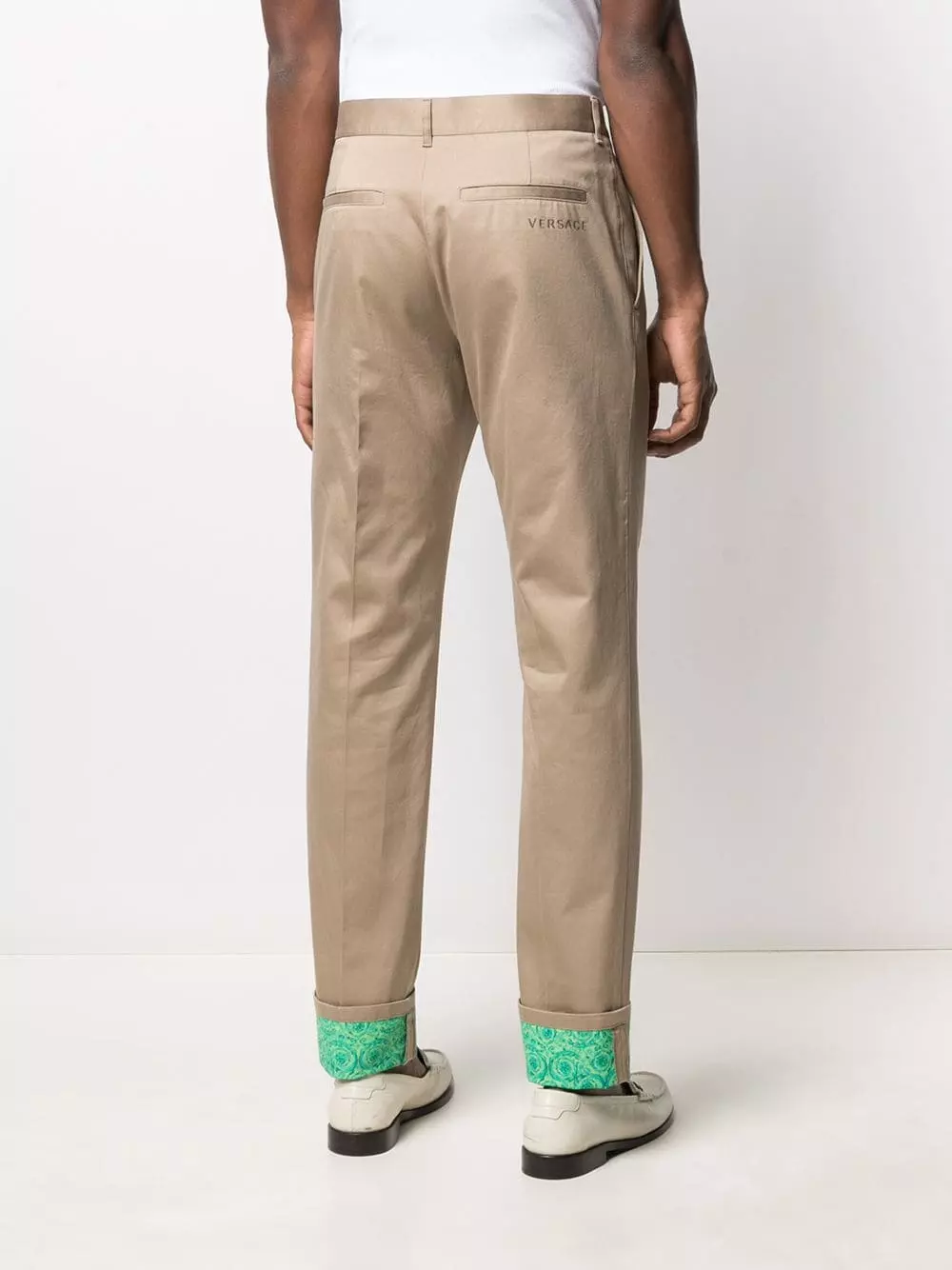A pair of chinos but make it Versace. Featuring a Barocco print at the hem fold, these chinos will add a touch of flamboyance to your outfit. Details matter.