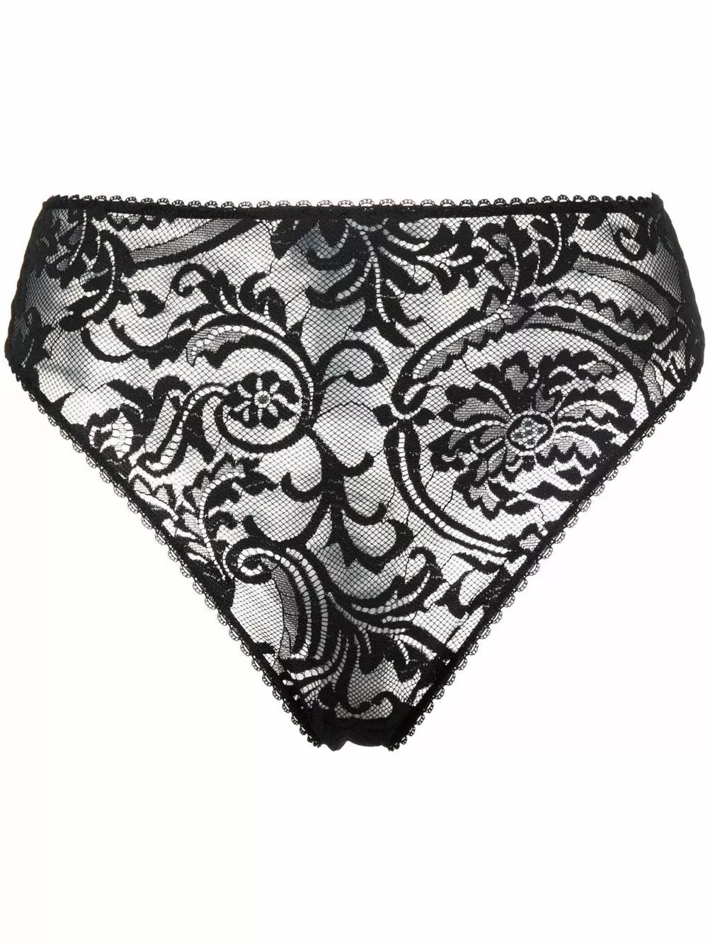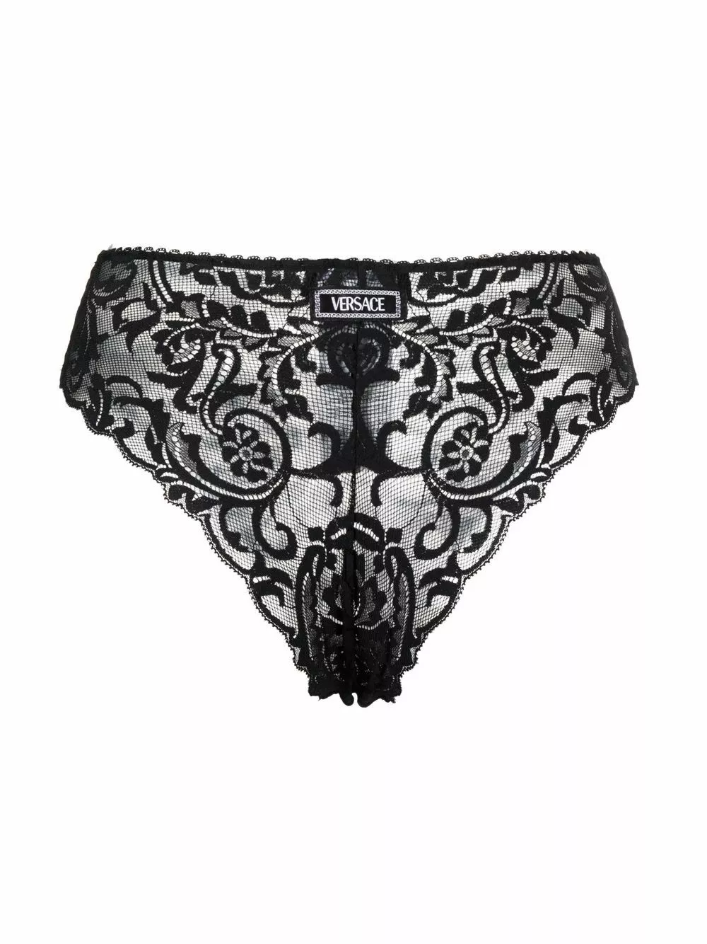 Inspired by the 1700s architecture and art style, Versace’s Barocco print has become a signature identifier for the Italian brand. Seen here in delicate lace, it adorns these high-waist briefs.