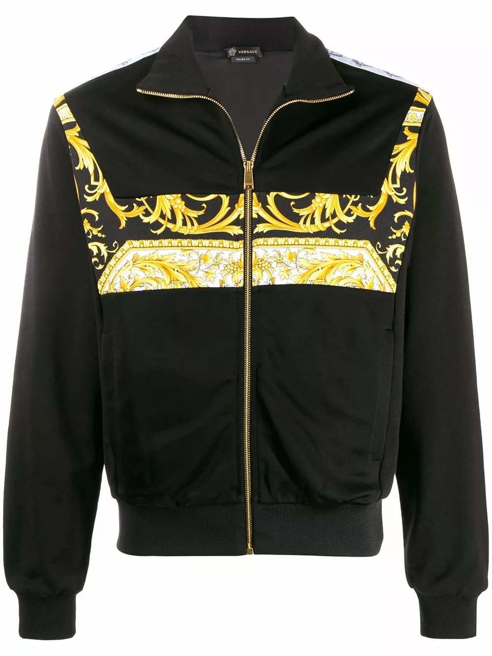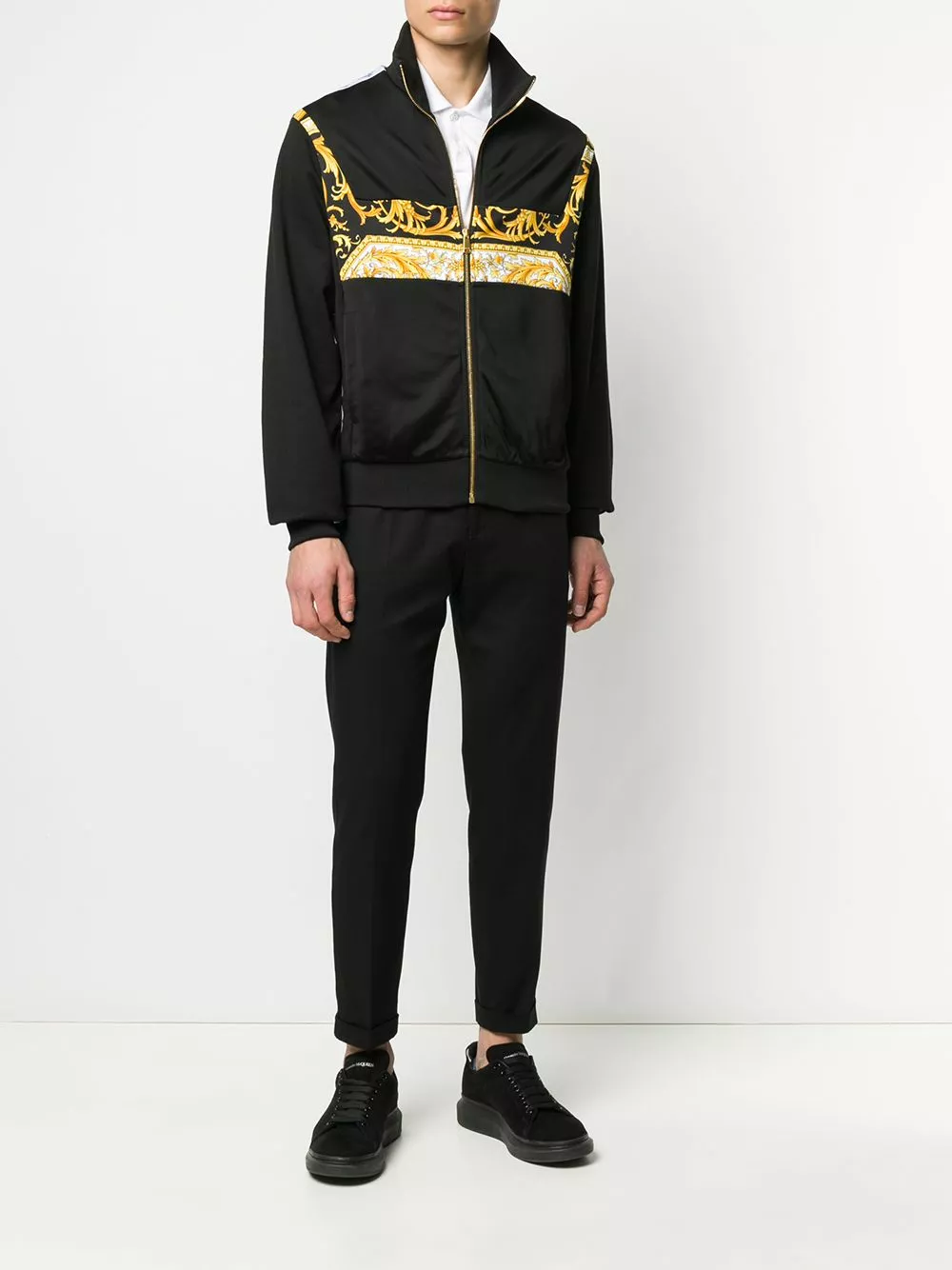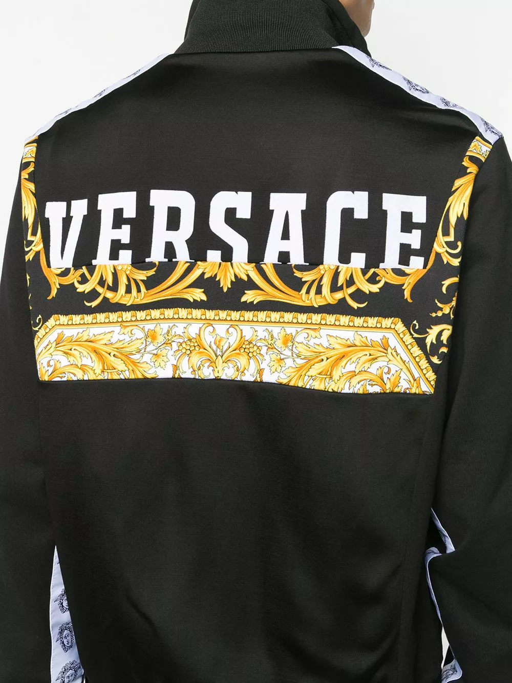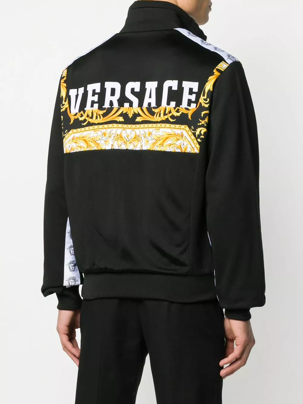 They say the Baroque era ended in the mid-18th century, but Versace is here to prove them all wrong. This black cotton Barocco logo bomber jacket is the living proof that it still leaves – both in our hearts and in our wardrobes. Featuring a front zip fastening, a stand up collar, long sleeves, a ribbed hem and cuffs, side slit pockets, a printed logo to the rear, a gold-tone Barocco motif and contrasting white side tapes with Medusa head pattern.