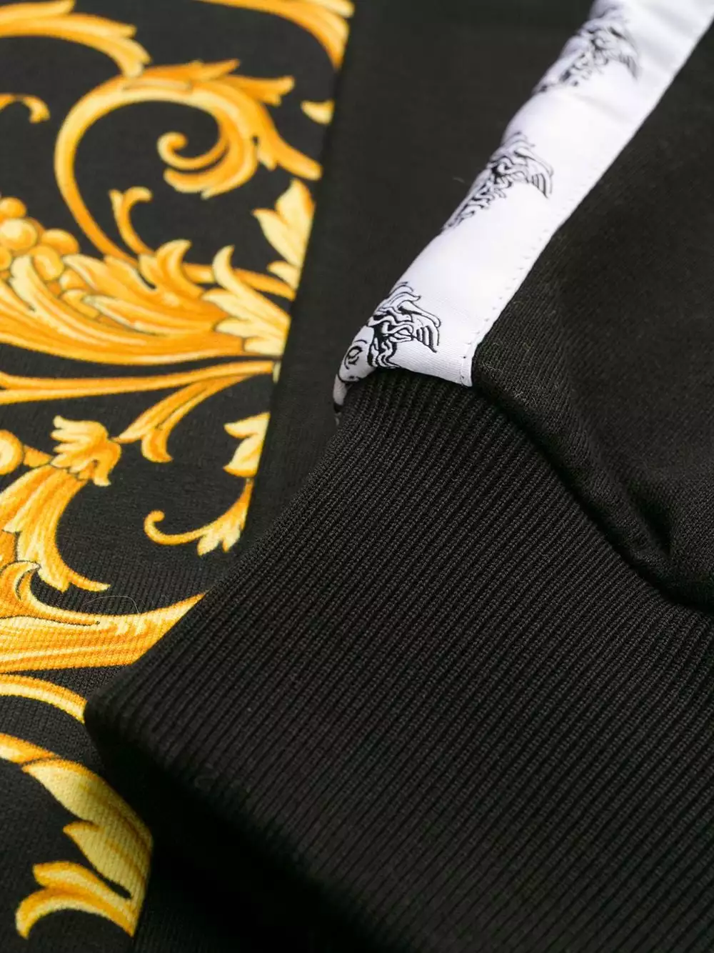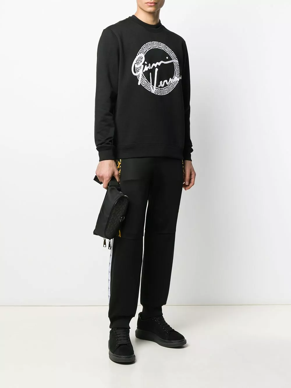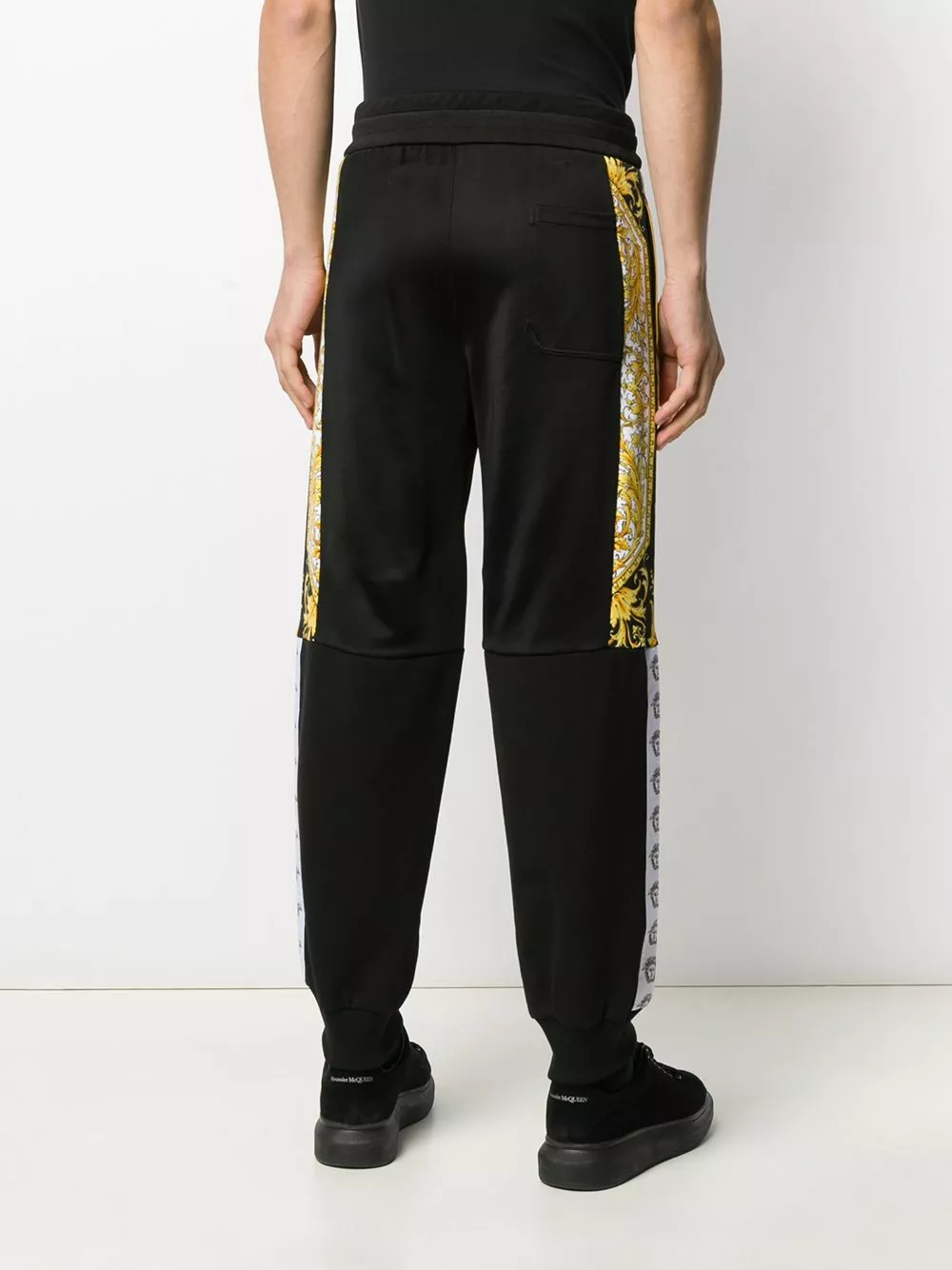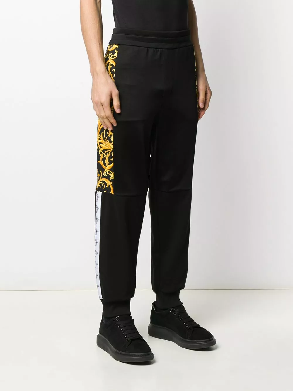 Get back on track with these black cotton Barocco logo track pants from Versace. Gym misses you – and your legs miss the gym. Featuring an elasticated waistband, a tapered leg, a stretch fit, elasticated ankle cuffs and Barocco and Medusa print motifs to the sides.