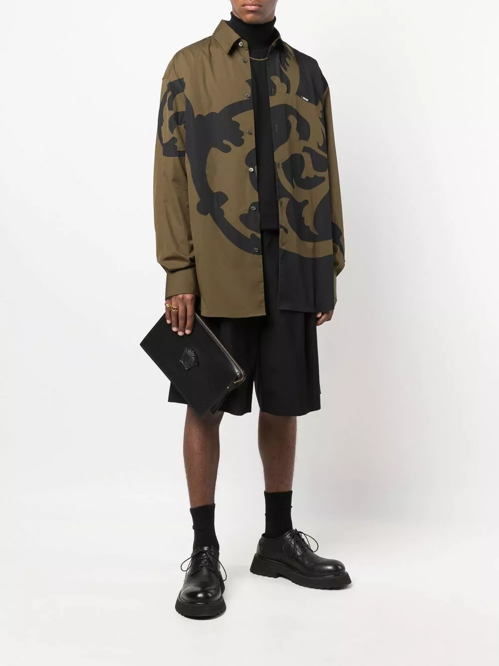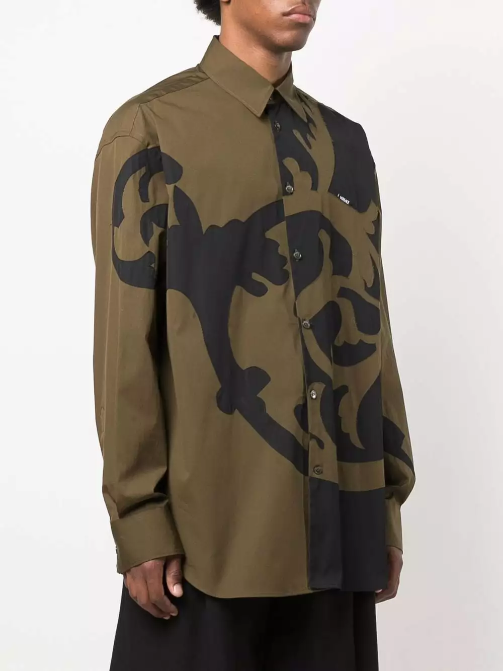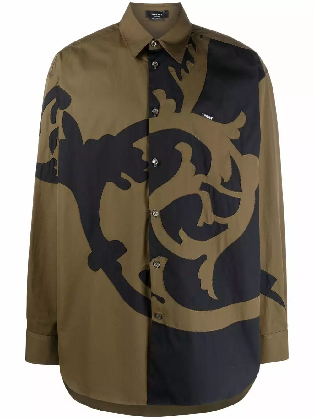 Season after season, Versace is known for delivering eye-catching designs such as this poplin shirt. Cast in hues of green and black, this piece is printed with an outline of the House’s Barocco acanthus leaves.