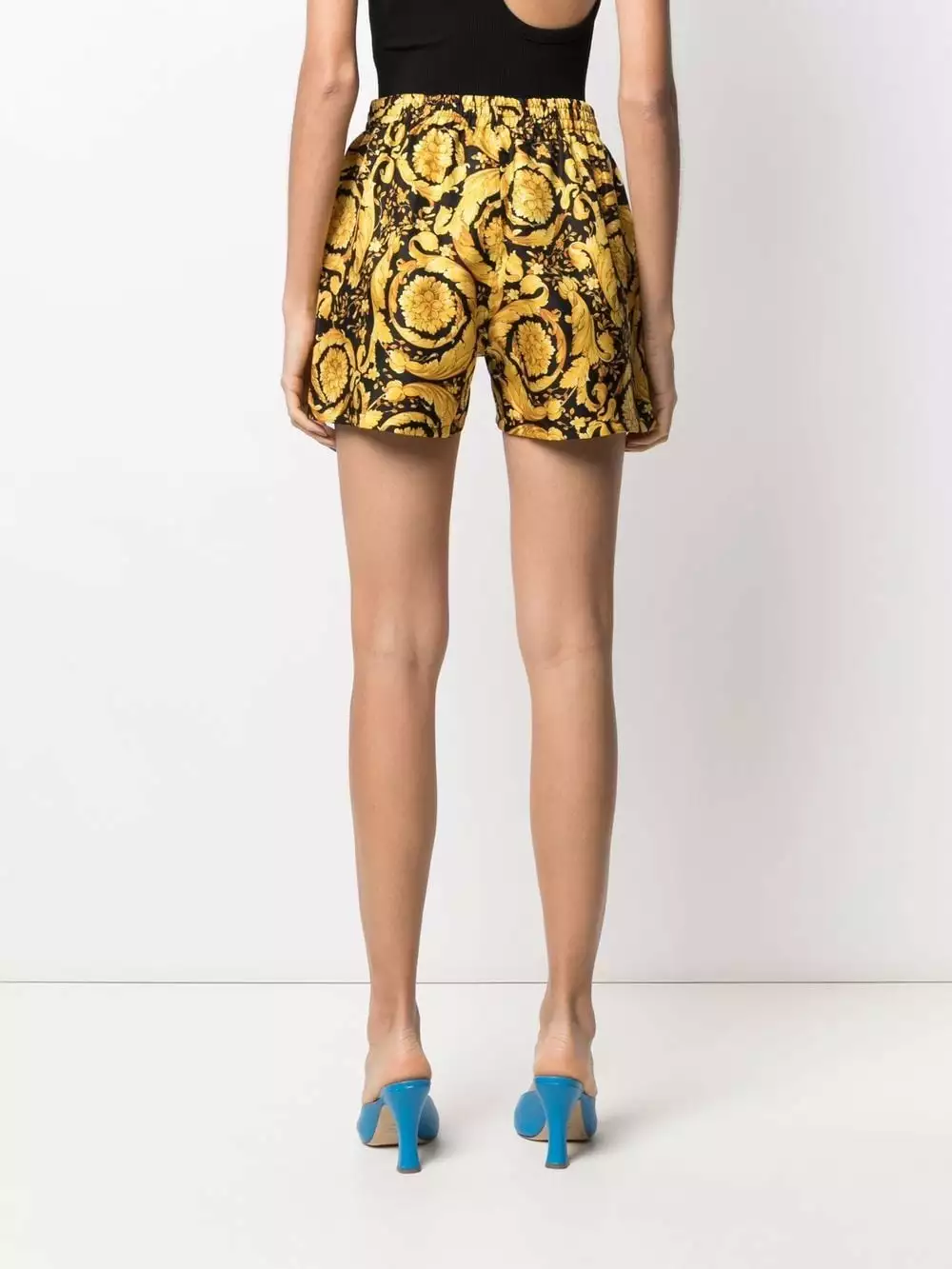 In the late ’80s, Versace made a move towards opulent prints such as the signature Barocco. These silk shorts showcase the pattern in the classic black and gold-tone colourway.
