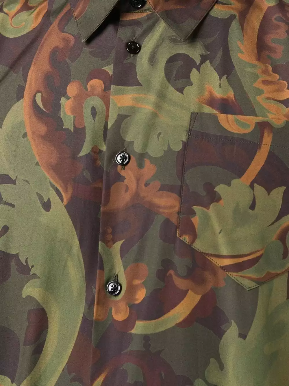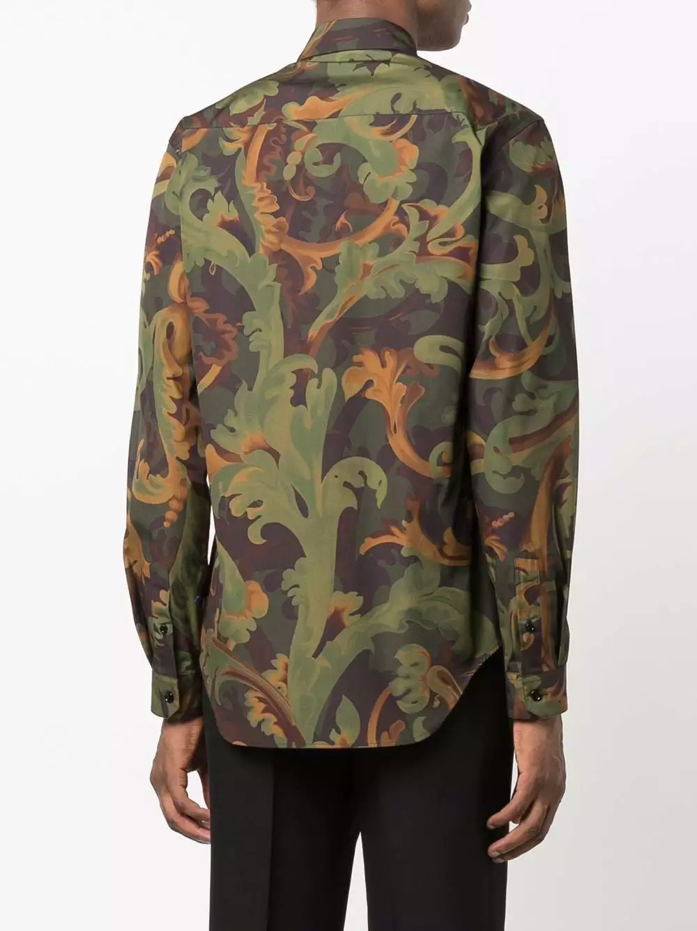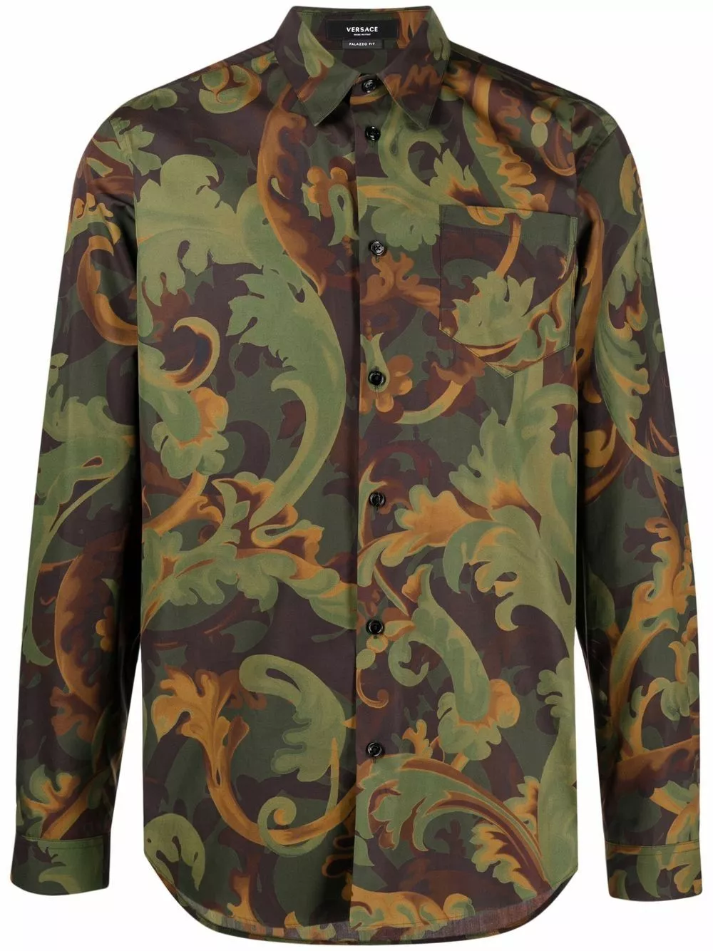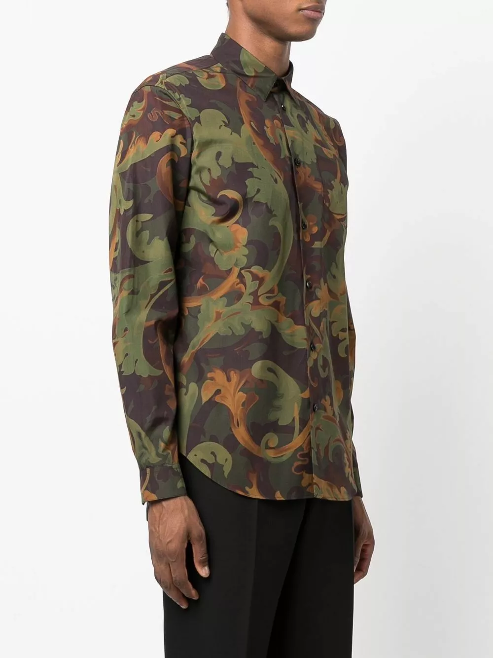 For AW21, Versace reimagines its signature Barocco motif by infusing it with a camouflage design, resulting in a Baroccoflage print. It is presented in green and brown on this long-sleeve cotton shirt, distinguishing it amongst the rest of the collection.