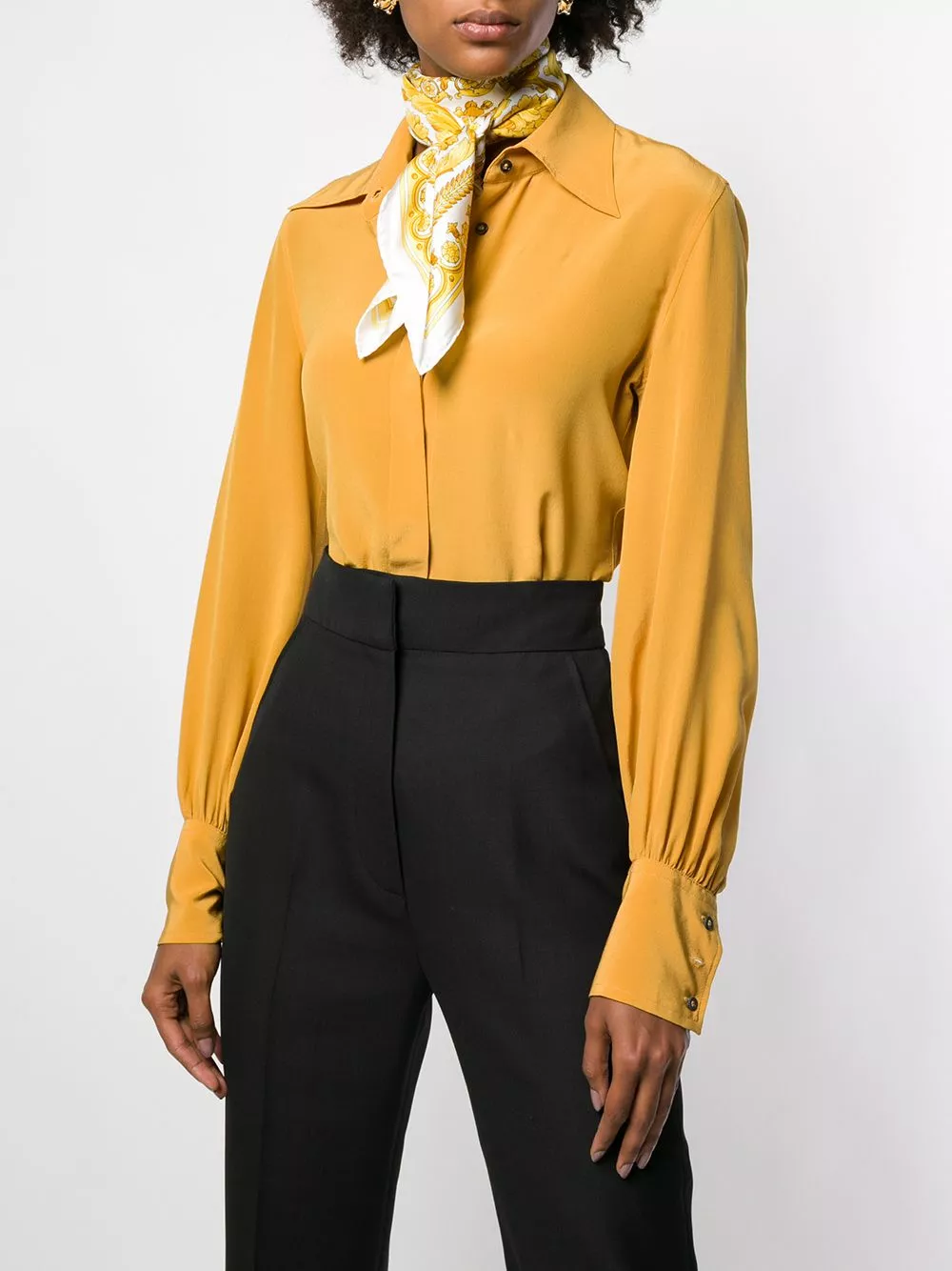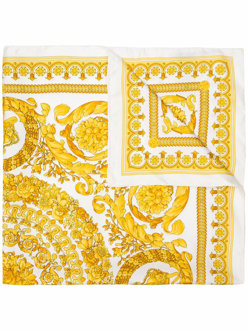 A pillar of luxury Italian fashion since its founding in 1978, Versace is celebrated for their glamorous details and impeccable craftsmanship which carries seamlessly onto their accessory collections. This white and gold-tone Baroque FW’91 silk scarf from Versace featuring a square body and a finely-detailed Baroque FW’91 print.