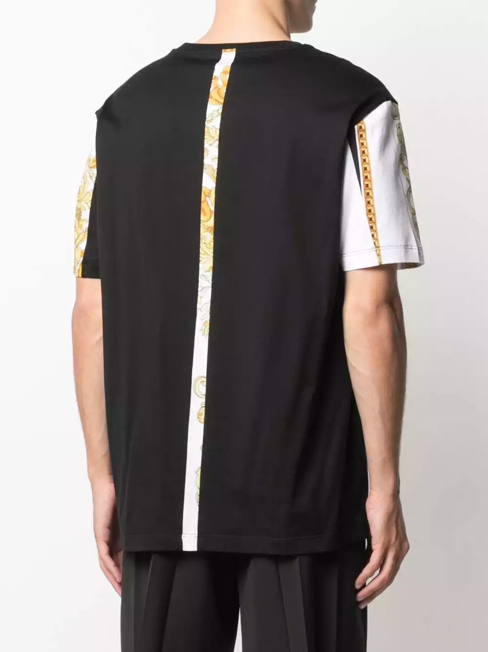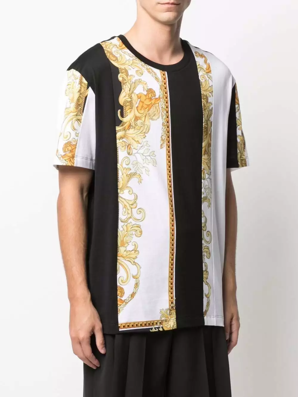 An unmistakable baroque print separates black and white panels on this cotton-made T-shirt. Nodding to Versace’s heritage styles, this motif imbues this casual design with a sense of timeless luxury.
