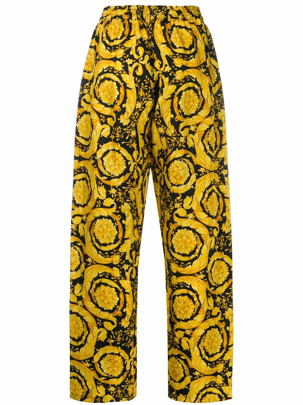 Show off your love off the brand even while you sleep in these black and gold-tone silk signature baroque print pyjama bottoms from Versace. Featuring an elasticated waistband and a wide leg.