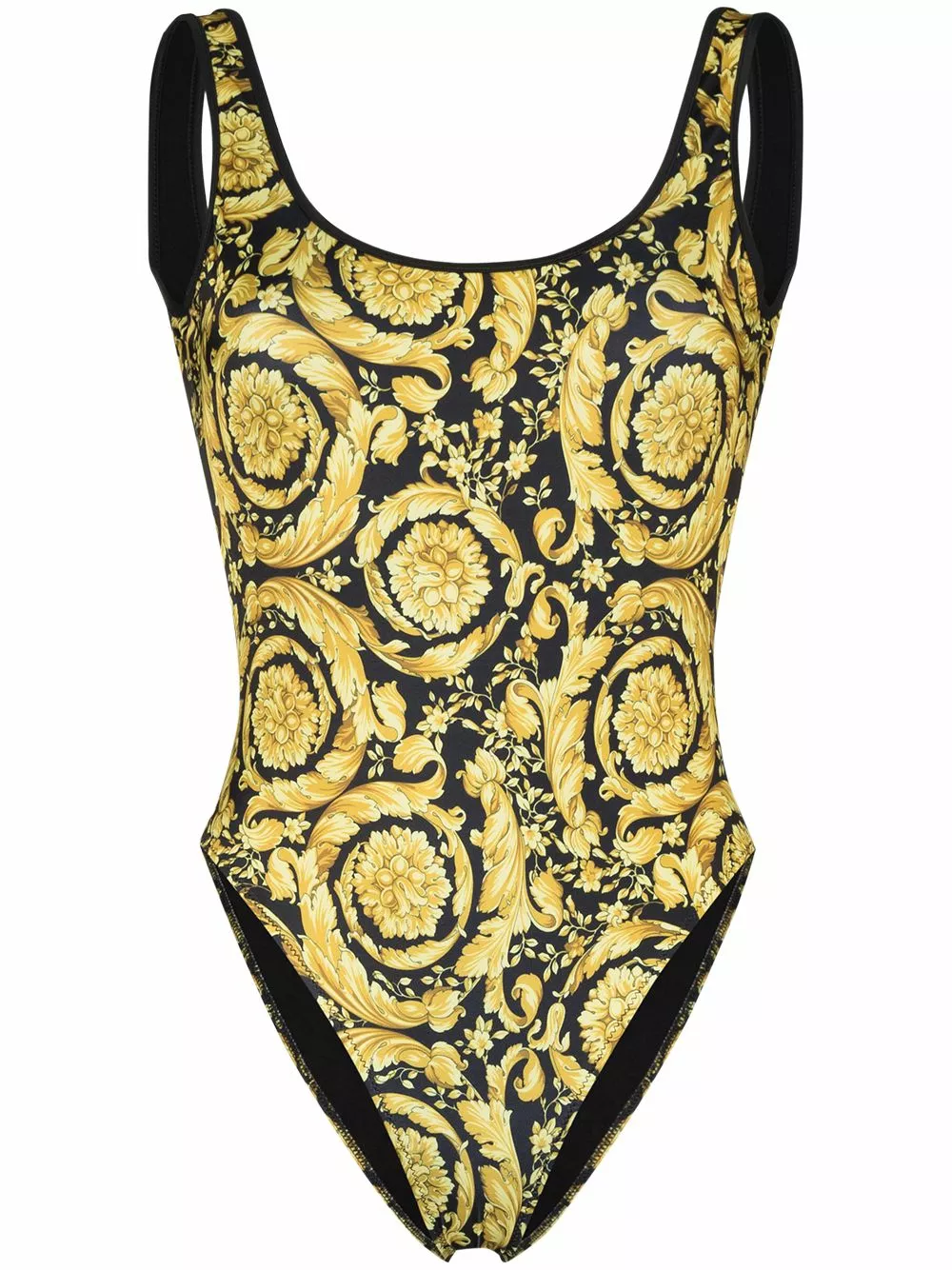 That’s one way to make a statement. Nodding to the ’90s, Versace’s striking swimsuit is emblazoned with the brand’s signature baroque print. Be bold.