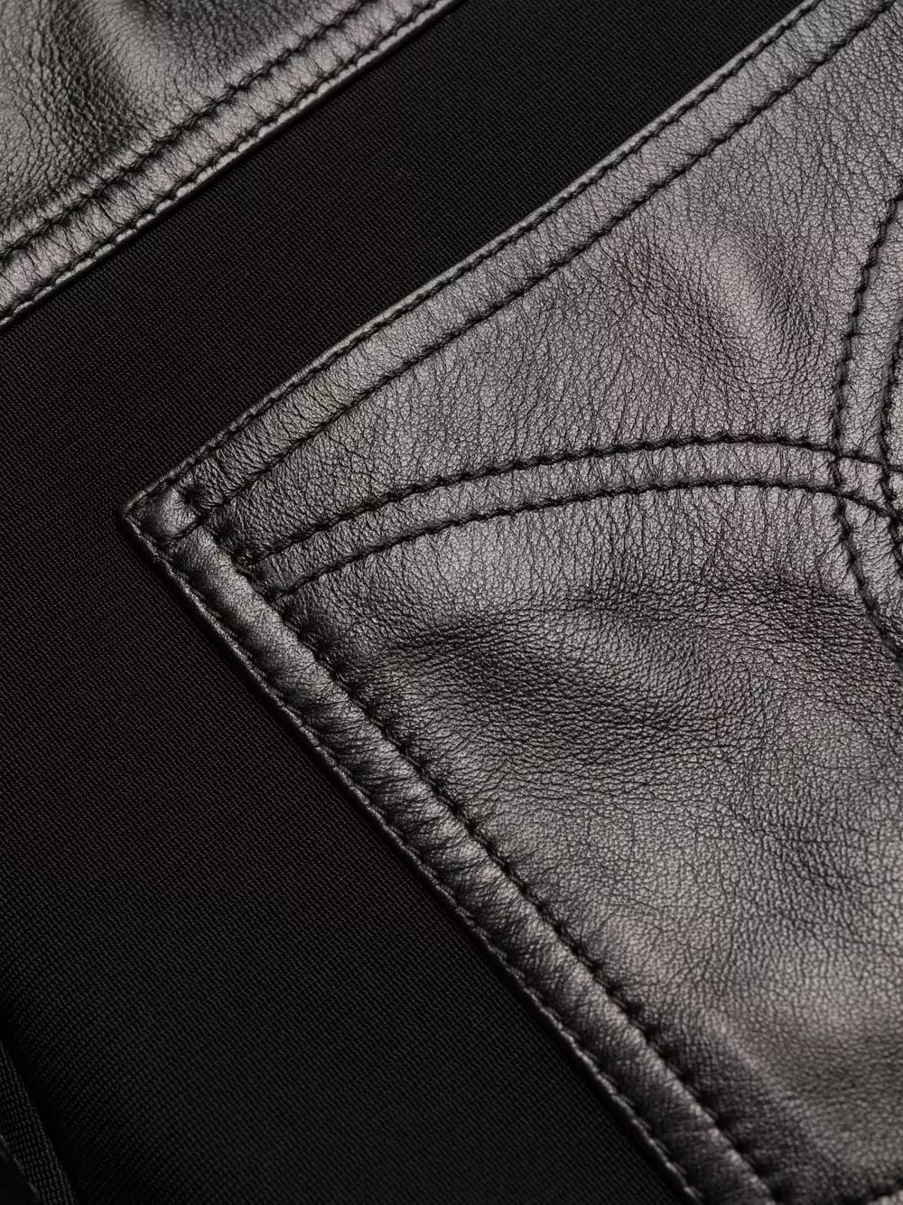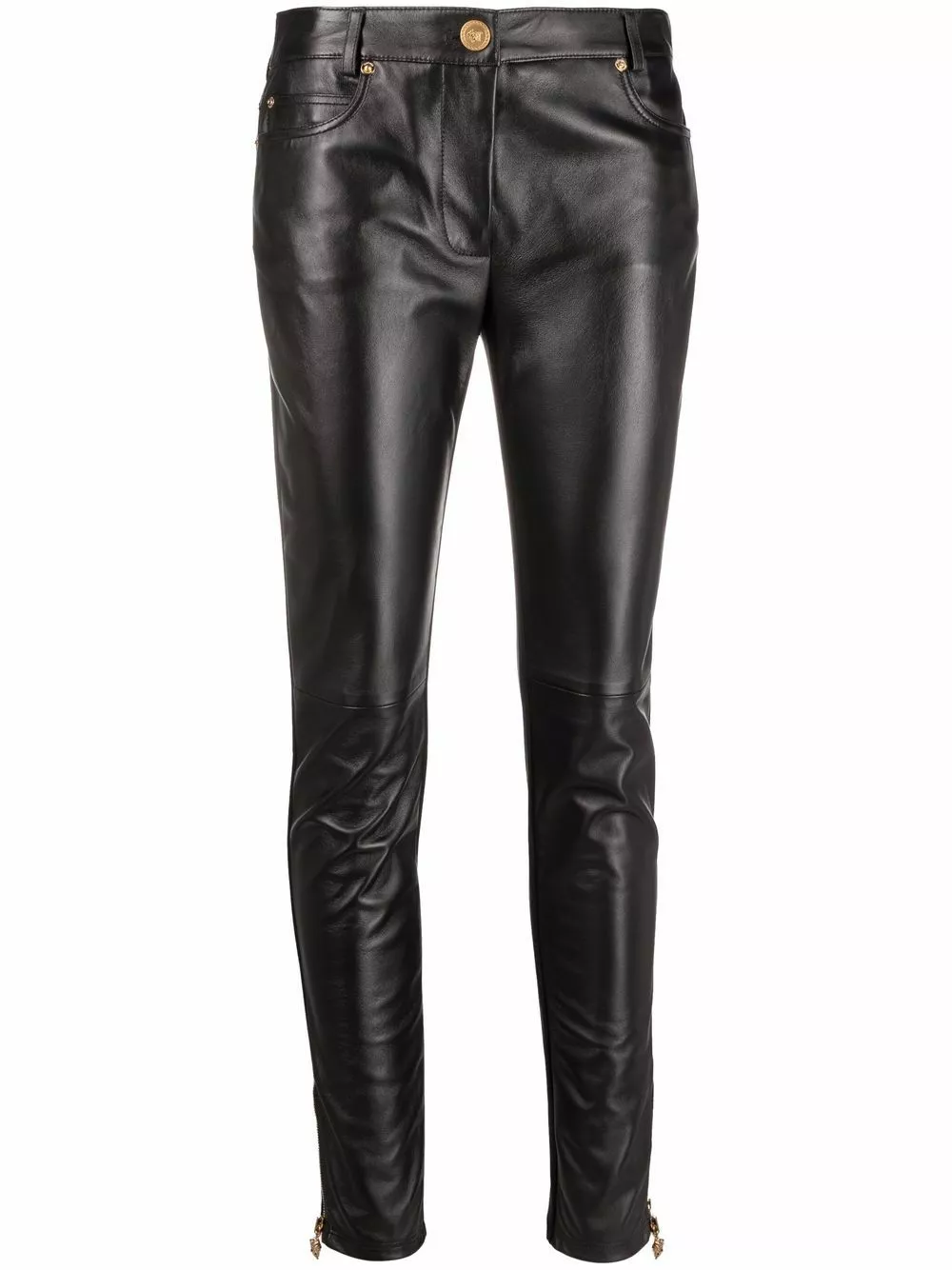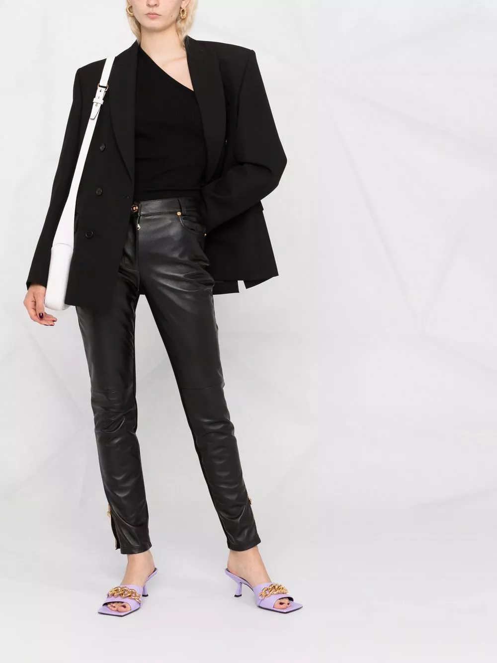 Versace’s panelled skinny trousers have been constructed with jersey and lambskin leather. Produced in Italy, the bi-material silhouette boasts a classic five-pocket construction and signature gold-tone branded hardware.