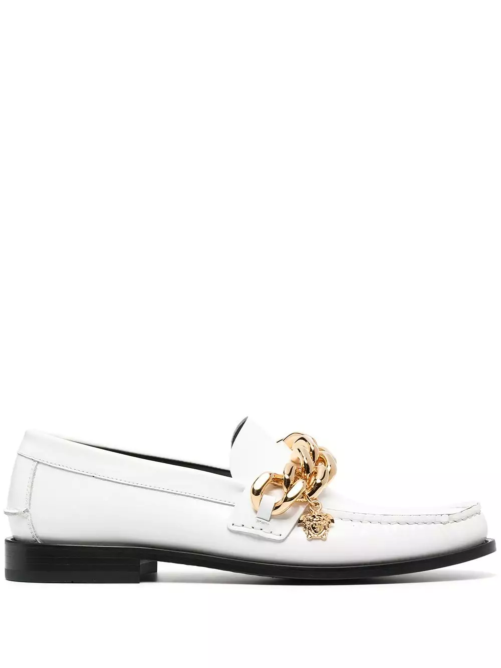 Step towards your new favourite pair of shoes. With gold-tone chain-link detailing to the front, Versace adds the fierce finishing touches. Now you can walk on in confident style.