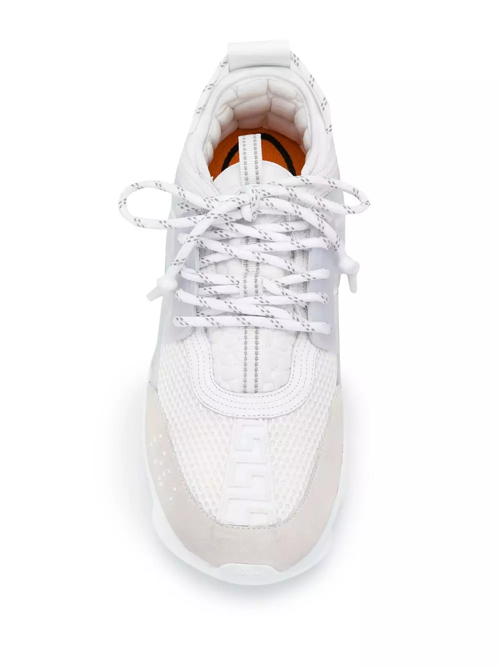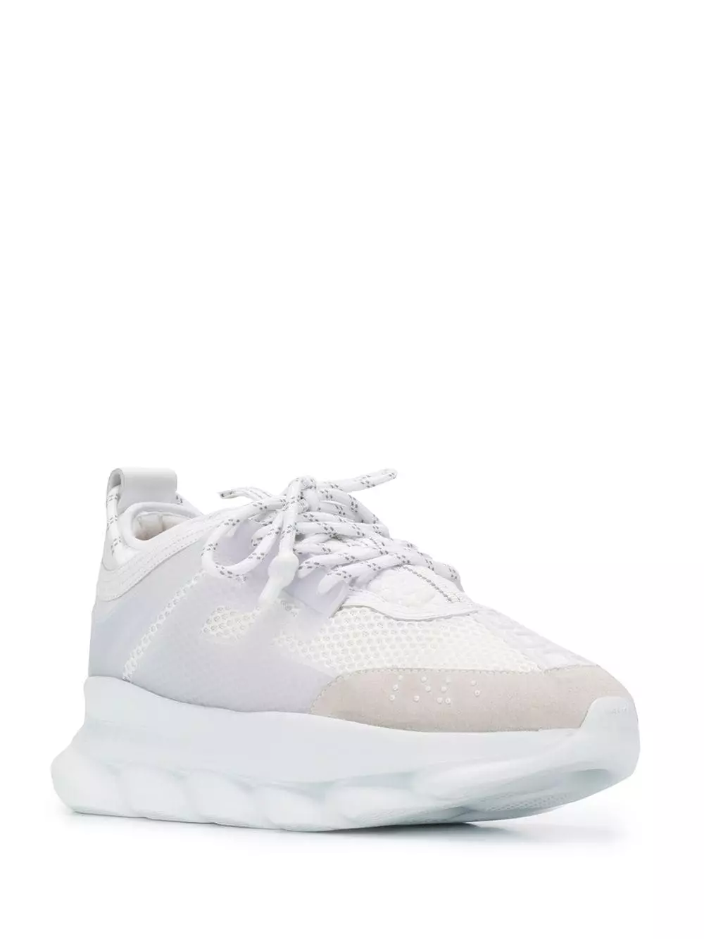 Since its founding in 1978, Versace has been synonymous with luxury fashion. Iconic prints and characteristically glamorous designs sit alongside sleek, modern ideas. These white Chain Reaction sneakers from Versace are a signature. Featuring a round toe, a lace-up front fastening, a logo patch at the tongue, a pull tab at the rear, the Greek Key pattern to the toe, ‘love’ written in braille at the toe in an expression that love is blind, a Greca print cut-out detail to the sidewalls, a rubberized Medusa head motif to the heel counter and a platform chain-link effect rubber sole made to mimic Versace’s chain-link jewellery.