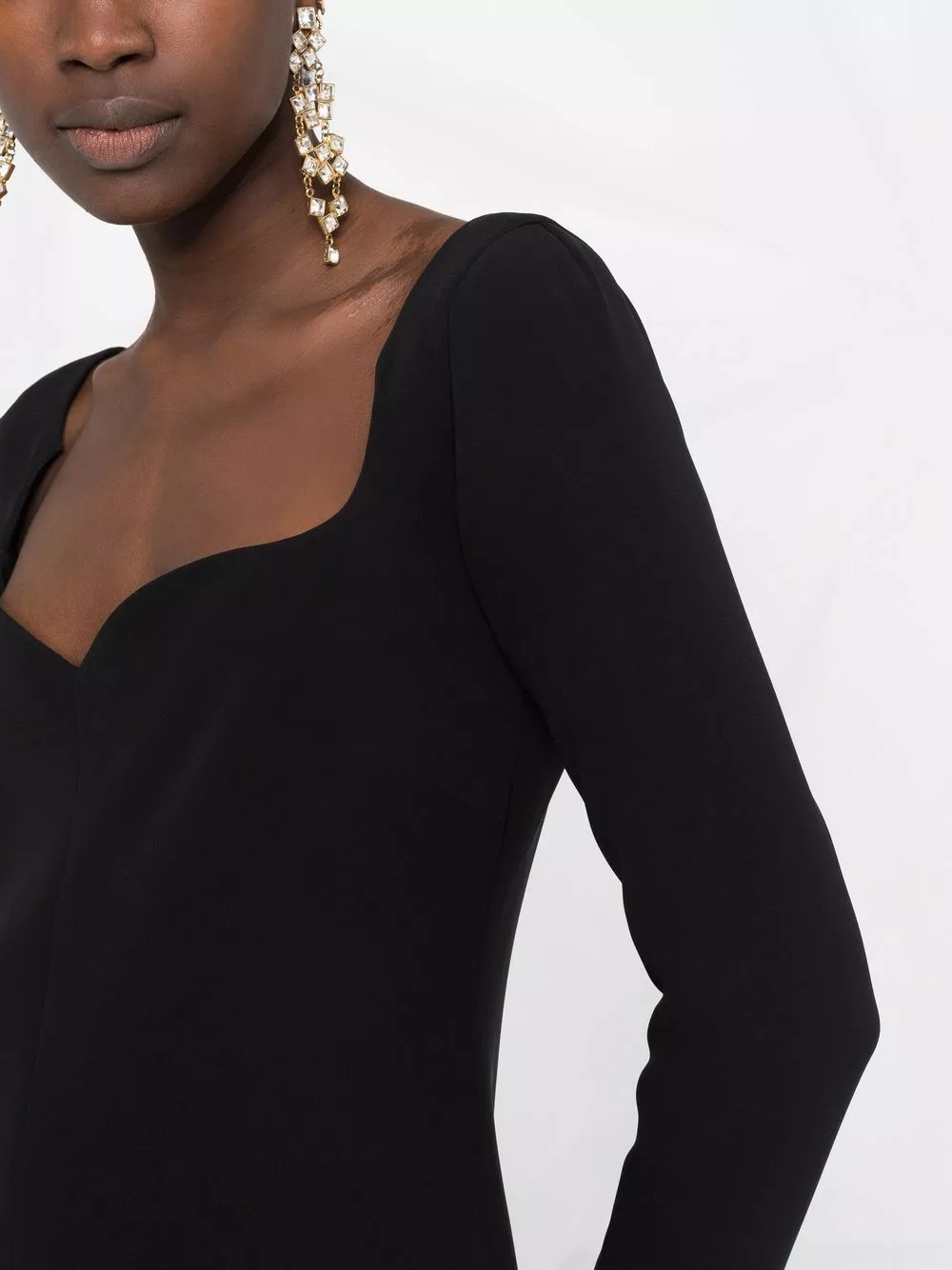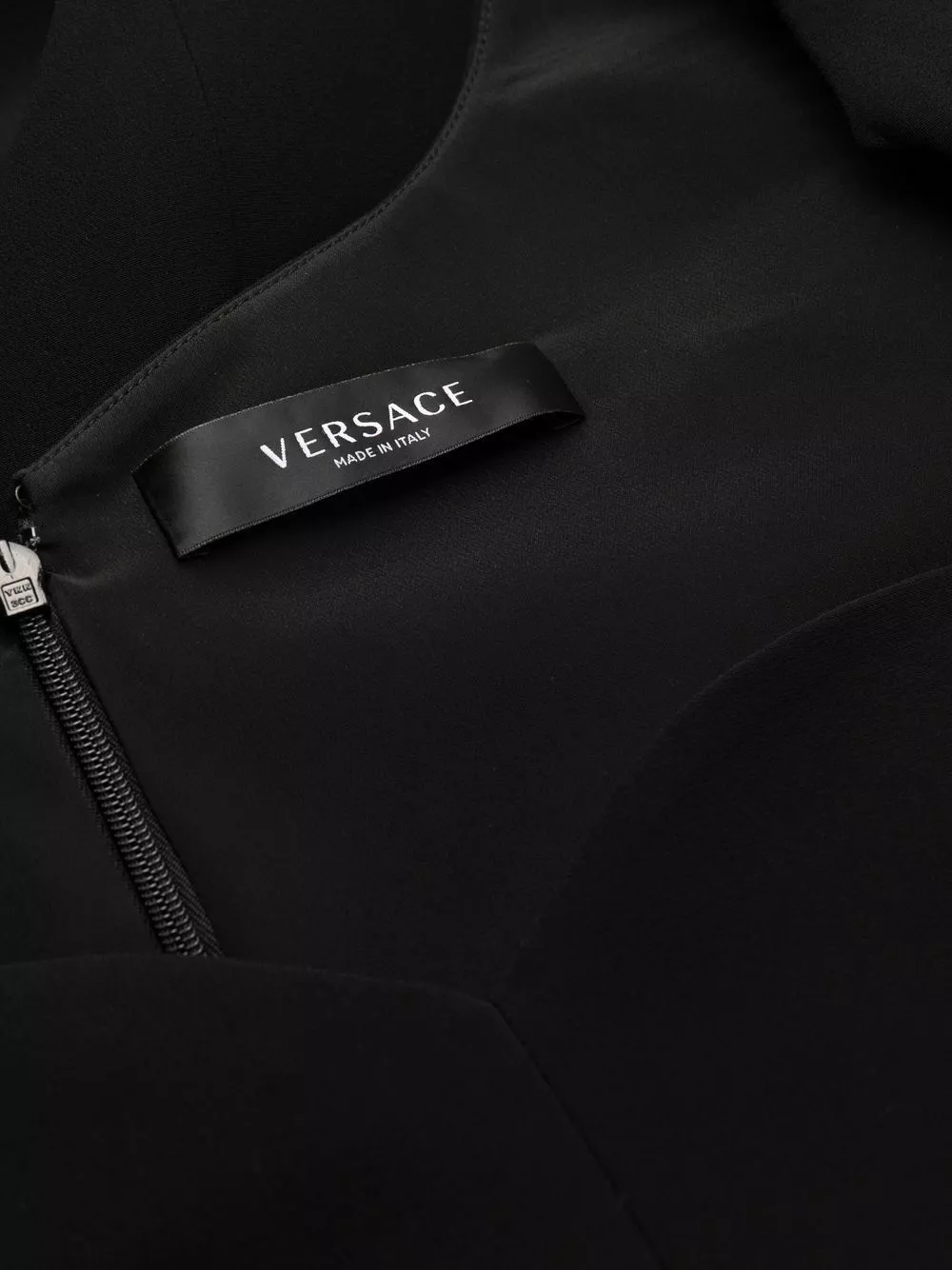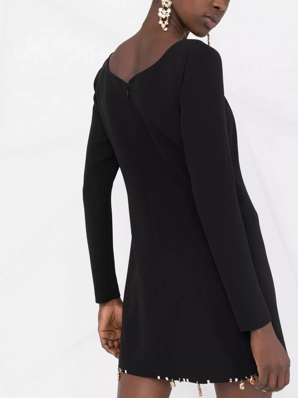 Versace’s minidress is a departure from the Italian brand’s maximalist aesthetic. This all-black iteration is accented with contrasting gold-tone charms at the hem depicting its house signatures – notice the safety pin and Greca motifs.