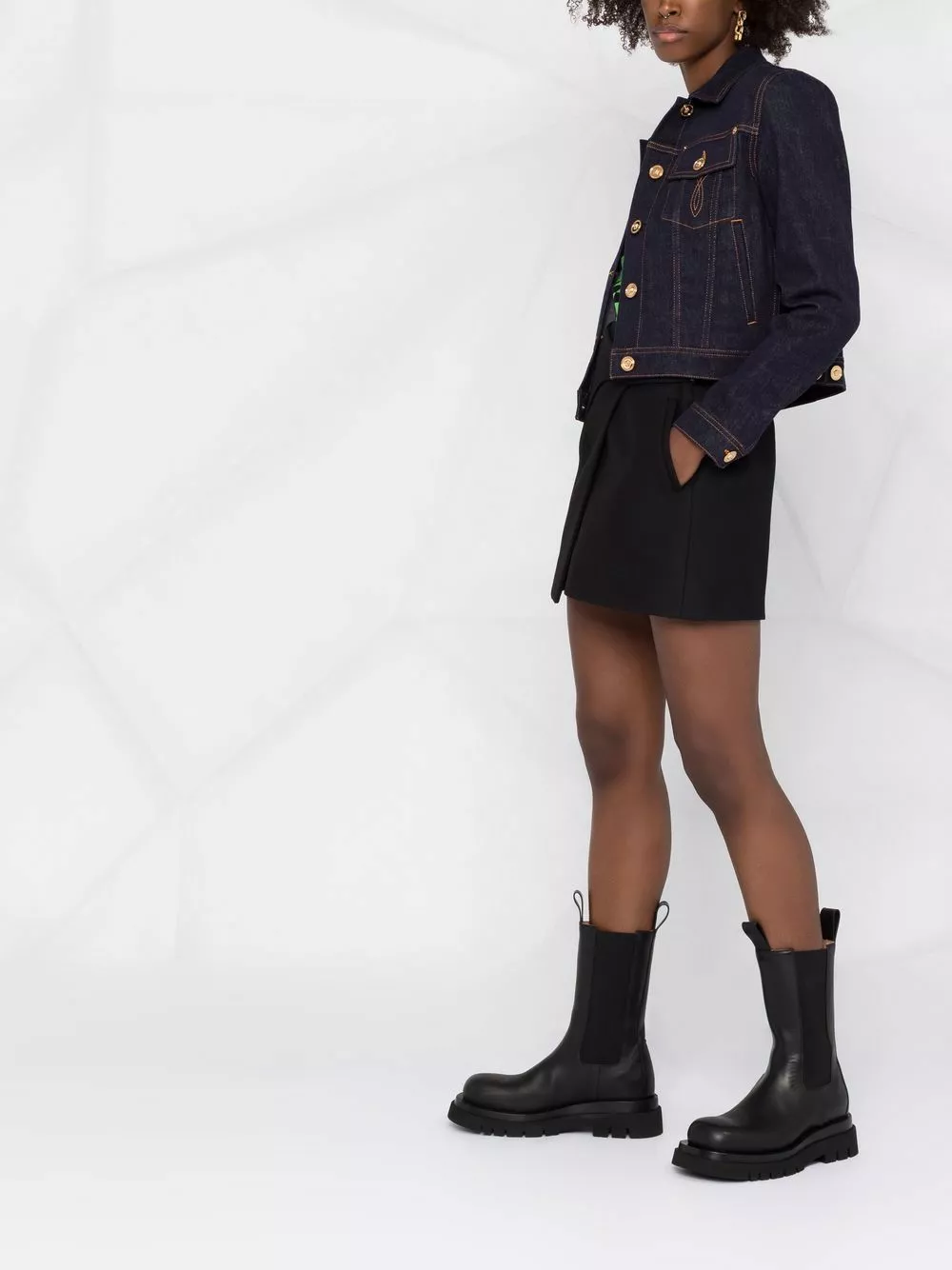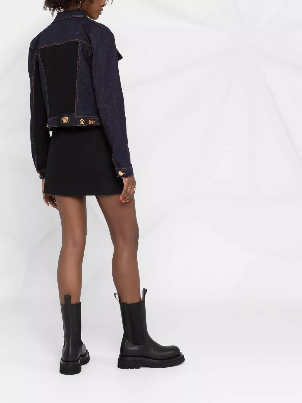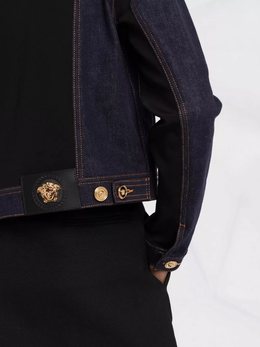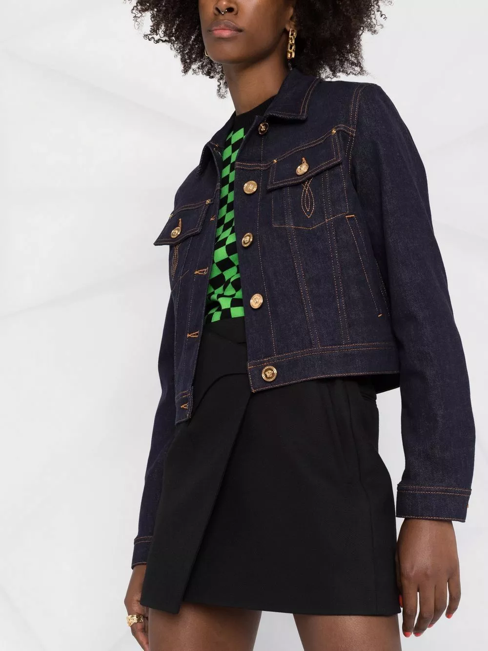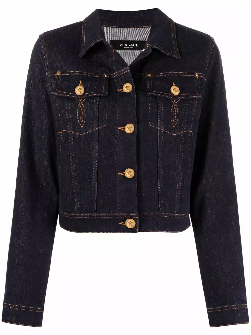 Italian-made, this cropped denim jacket from Versace is detailed with a contrasting rear panel and contrast stitching. It is detailed with the brand’s signature Medusa-embellished gold-tone hardware.