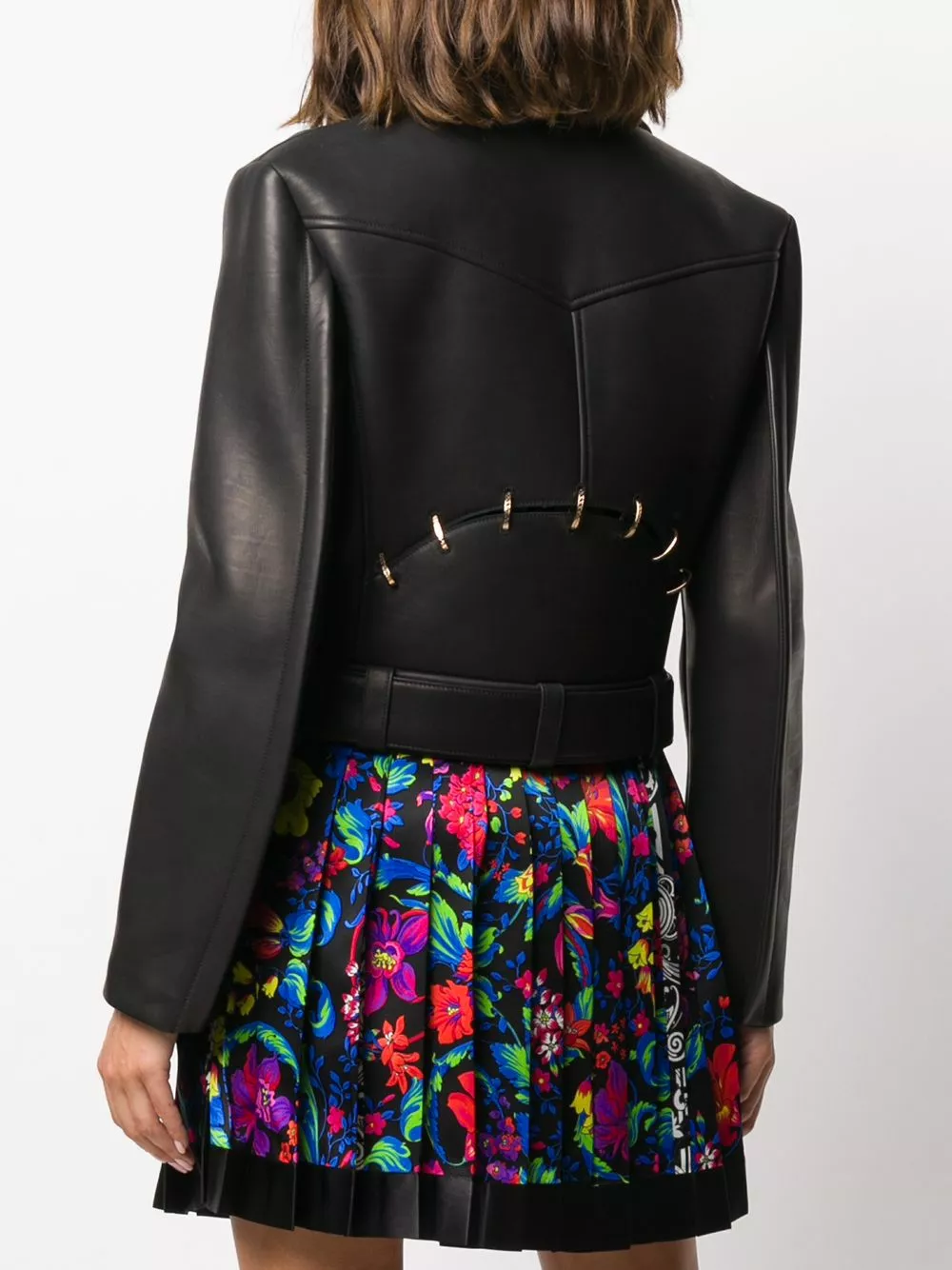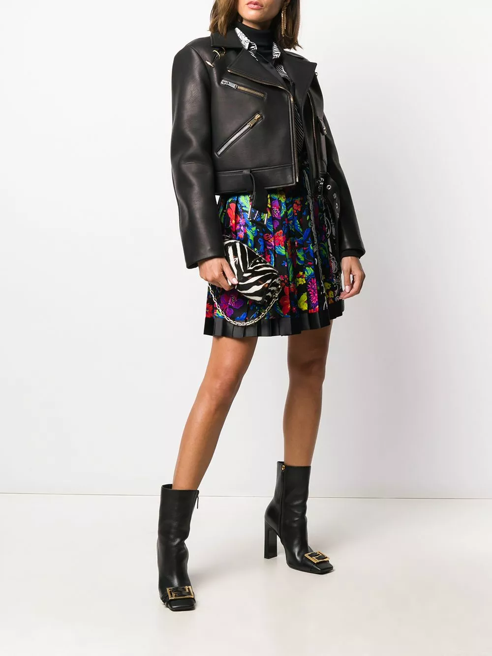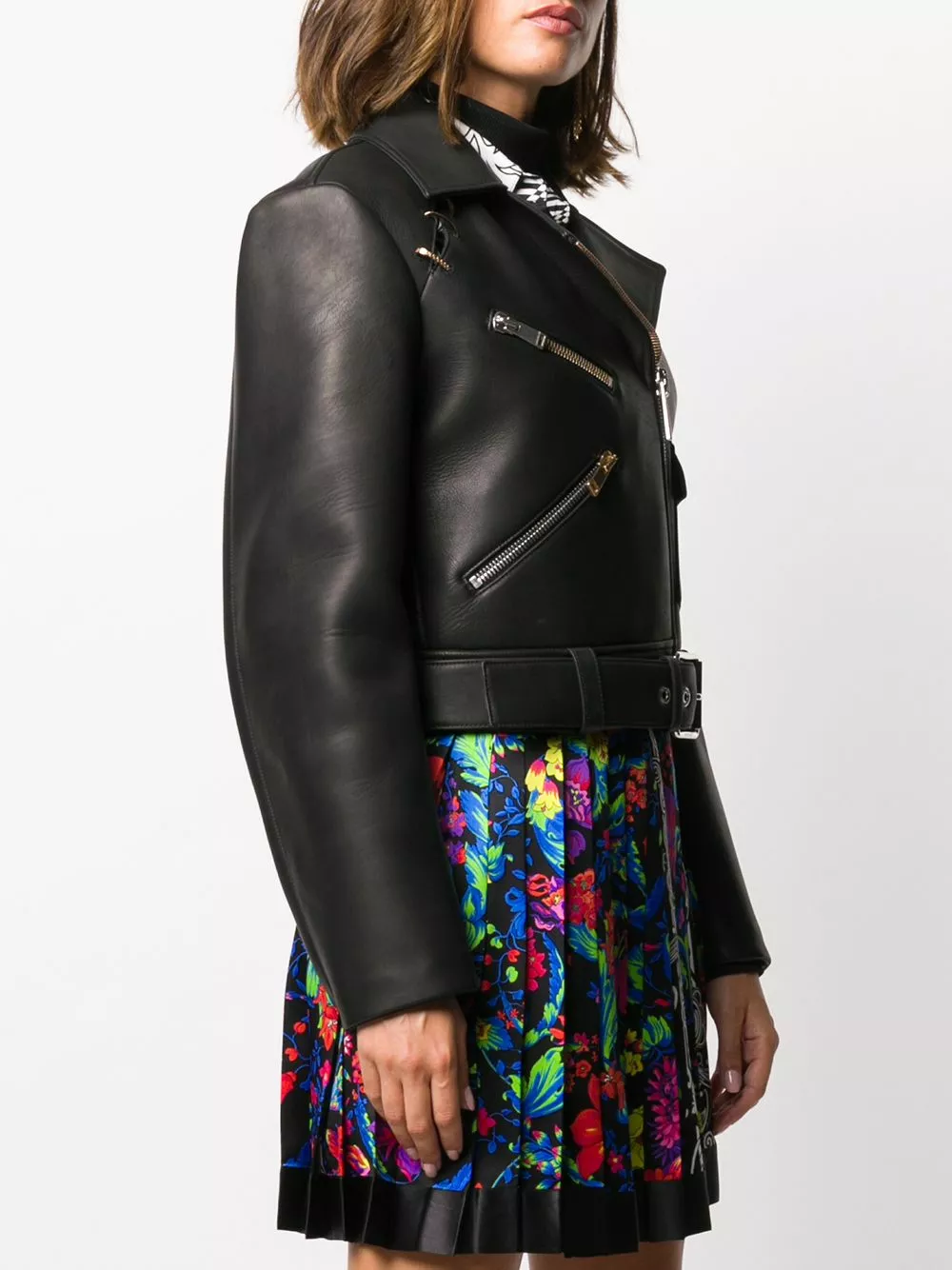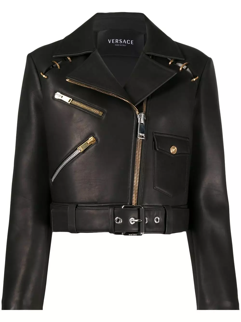 Are you ready for the ride of your life? With this black calf leather cropped biker jacket from Versace you can go anywhere. Vroom vroom.