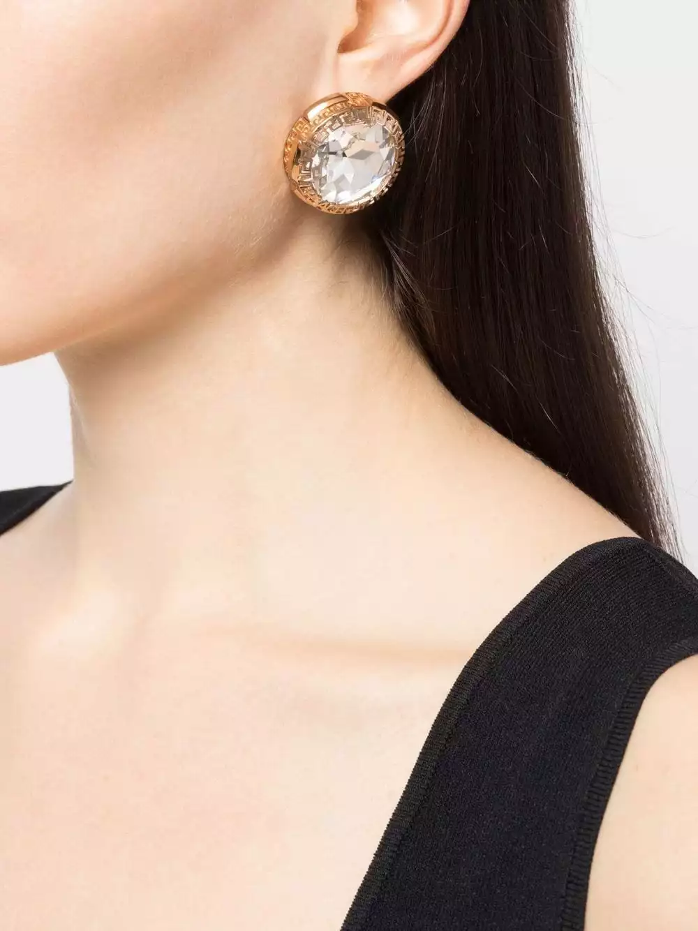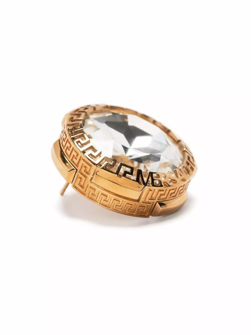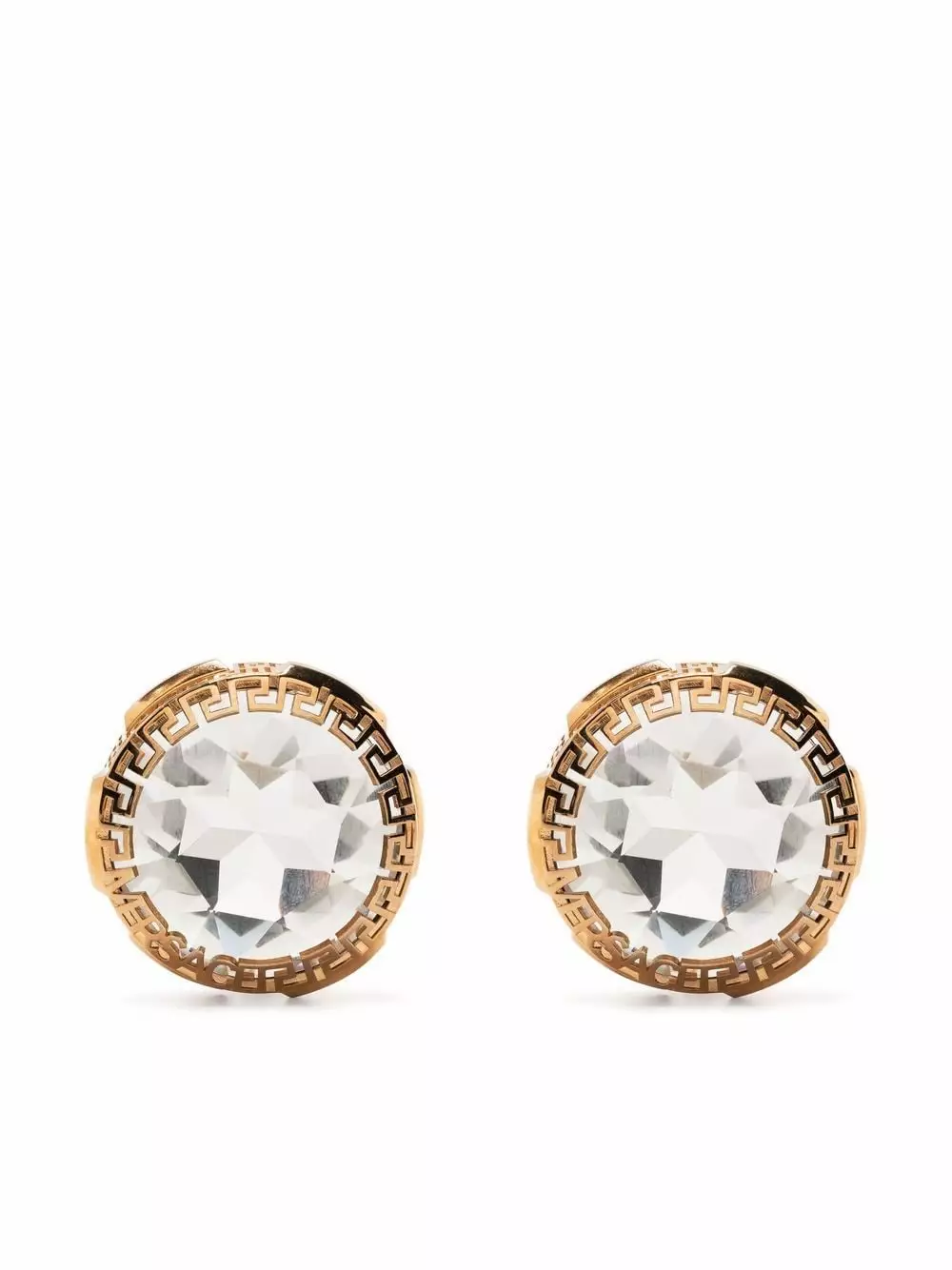 Dressed in Versace gold, this pair of crystal stud earrings is detailed with the label’s Greca trim detail. Circular in shape, they fasten with a butterfly closure.