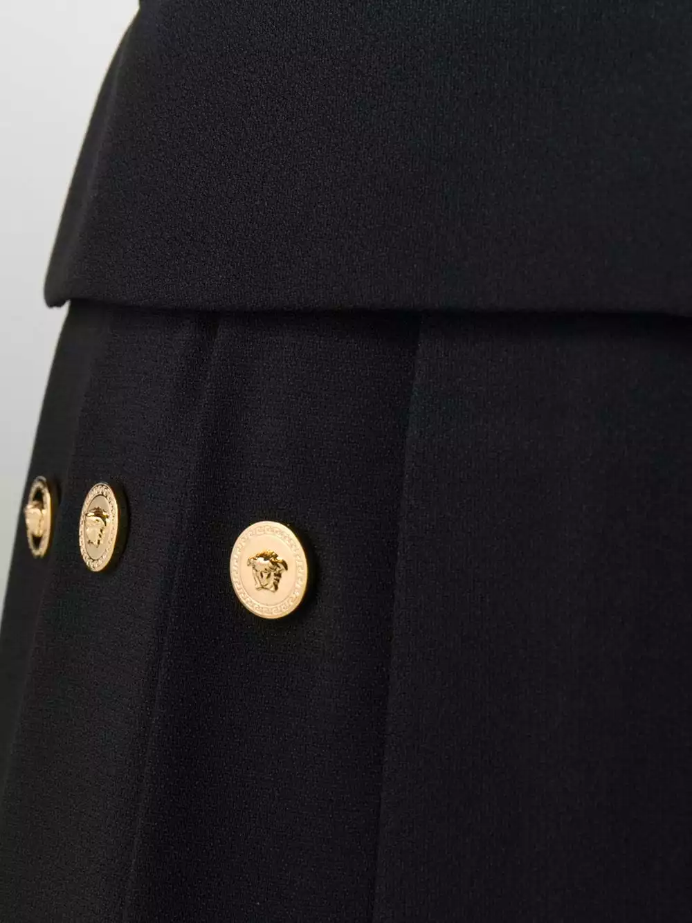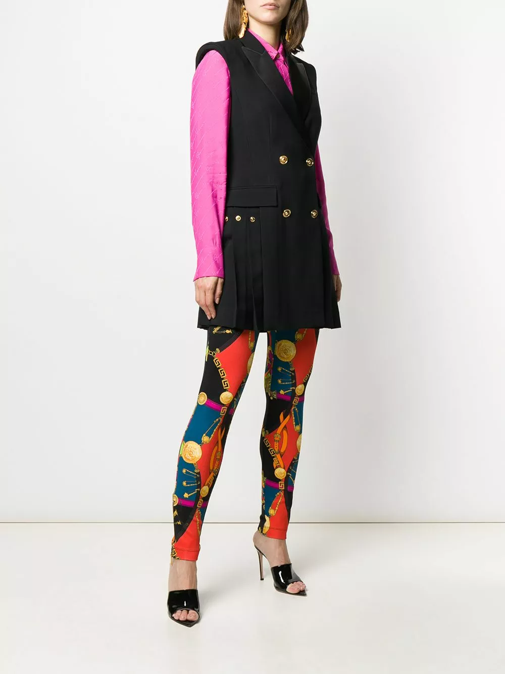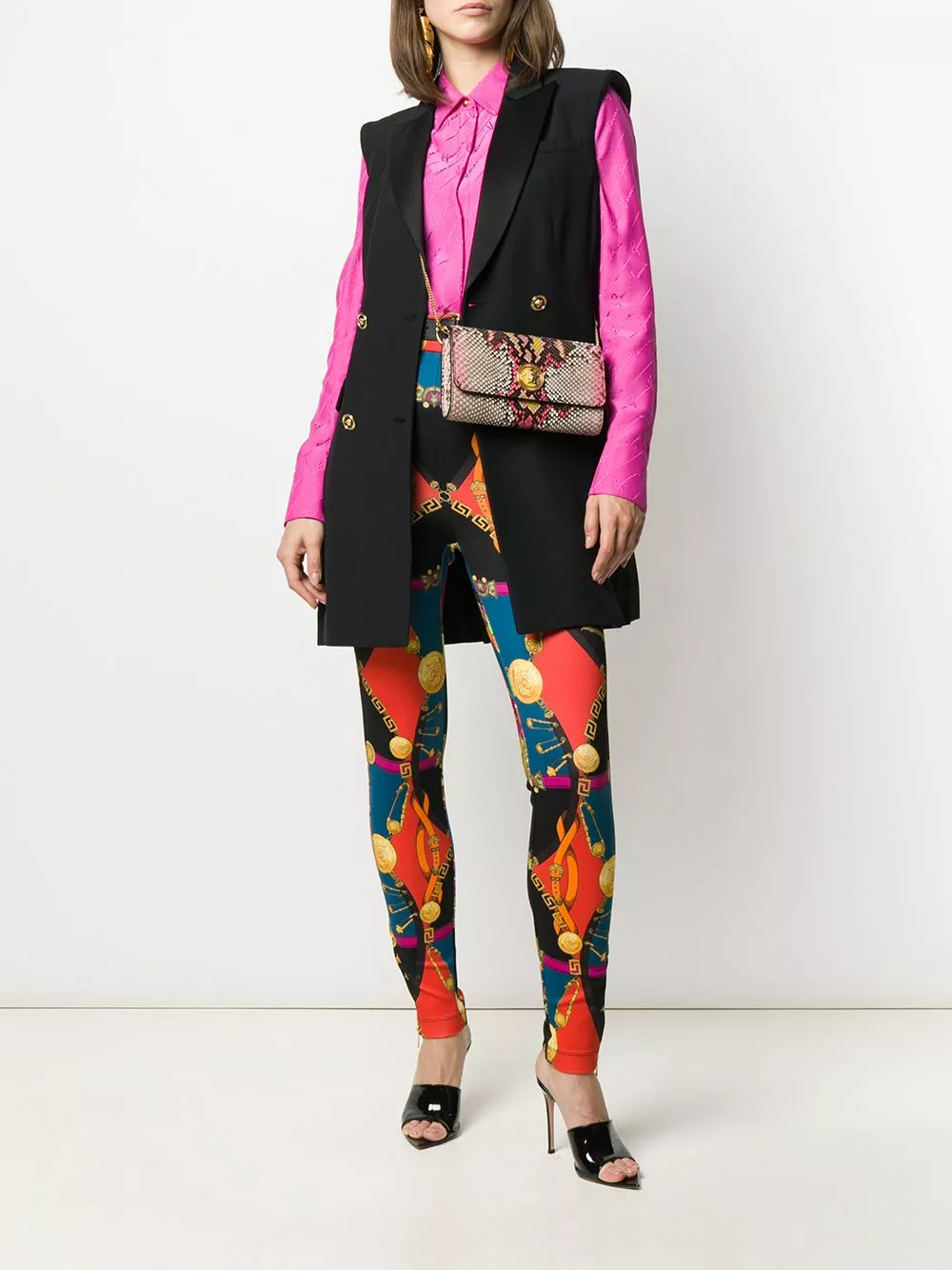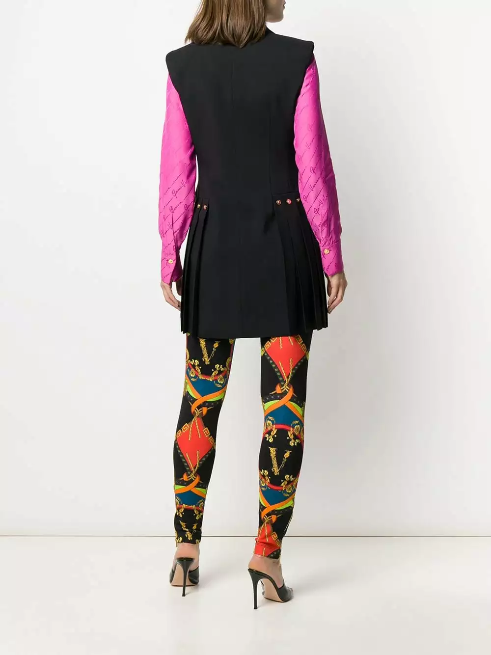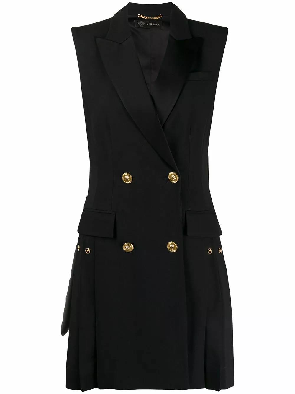 We’ll be wearing this black double-breasted pleated waistcoat from Versace to a Jazz club in Soho next Saturday night and pairing it with a glass of red wine. We’ve booked a table for two, will you join us? Featuring a sleeveless design, a double breasted front fastening, peaked lapels, a chest pocket, front flap pockets, gold-tone embossed buttons, gold-tone Medusa head logo embellishments and pleated details to the sides.