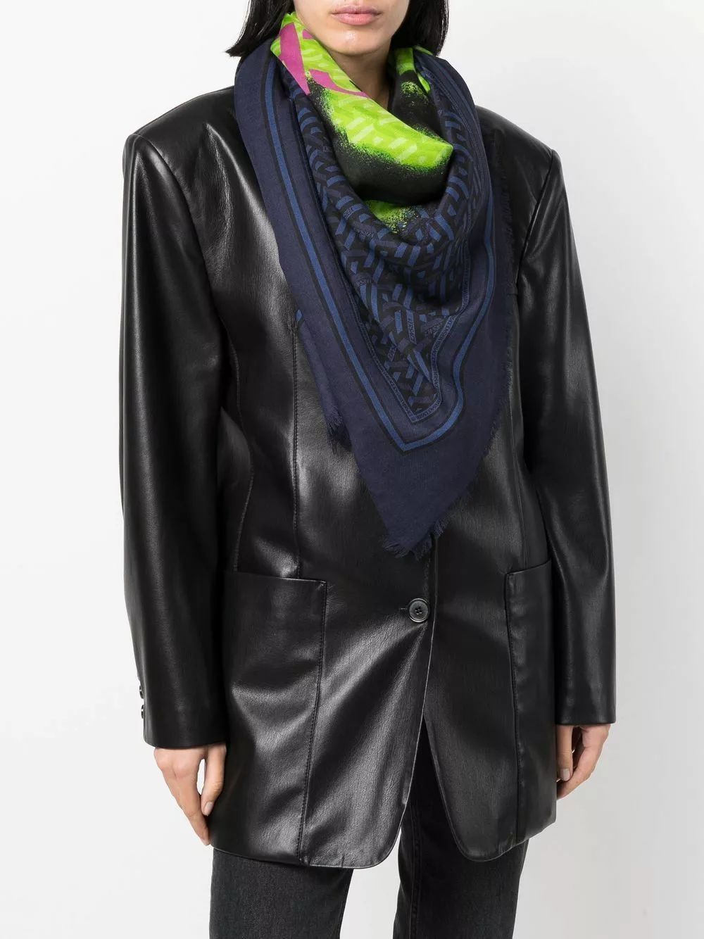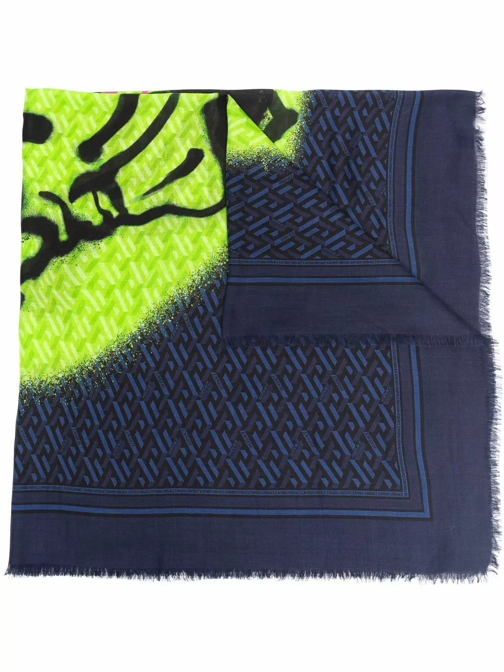 Crafted from a silk blend, this multicolour scarf showcases Versace’s extravagant style. Having the signature Greca print as a background, the design also features a graffiti Medusa smile motif that speaks to the brand’s sense humorous approach to fashion.