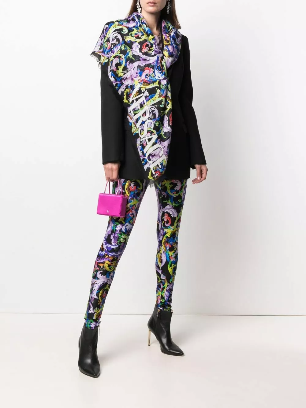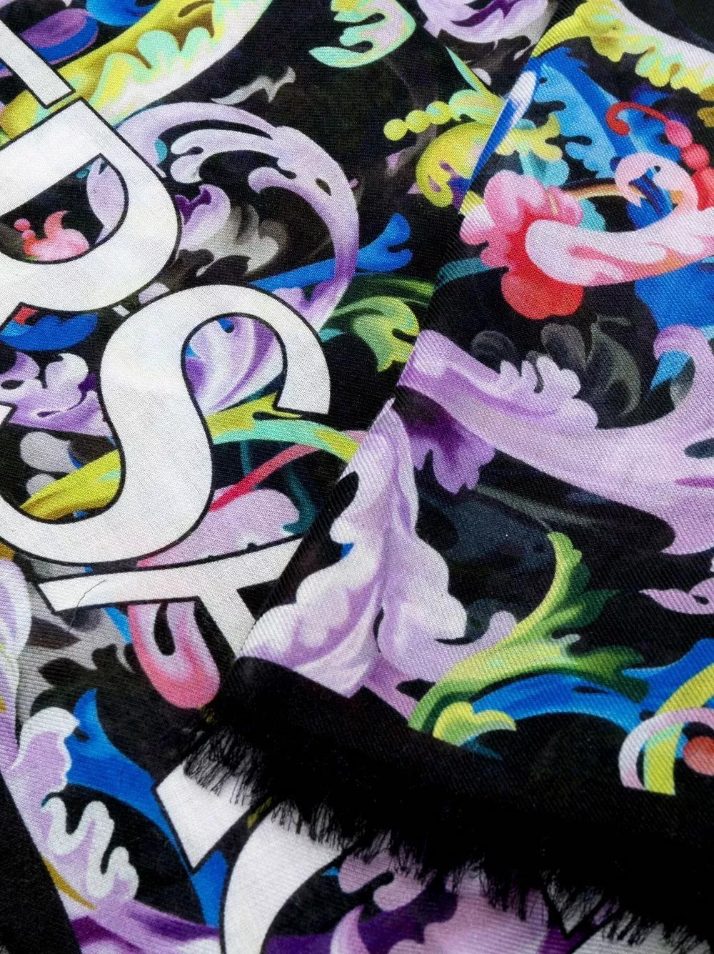 Described as using ‘bright, almost jarring colours’ Versace’s modern design style continues the fearlessness of it’s origin. It’s displayed confidently in this baroque-style graphic print scarf, with a logo print to the side and fringed edge adding a sense of extravagance through the use of fine details.