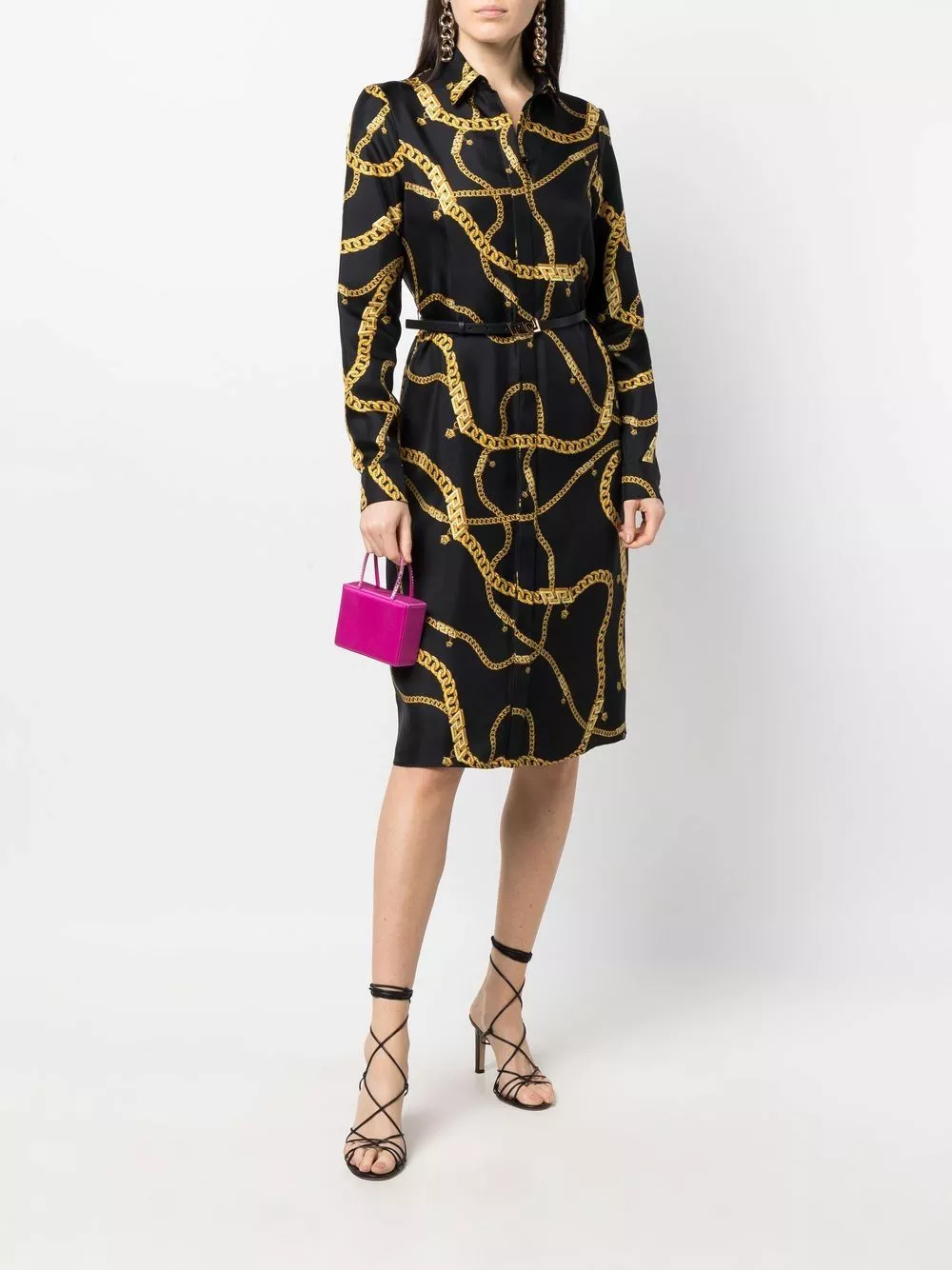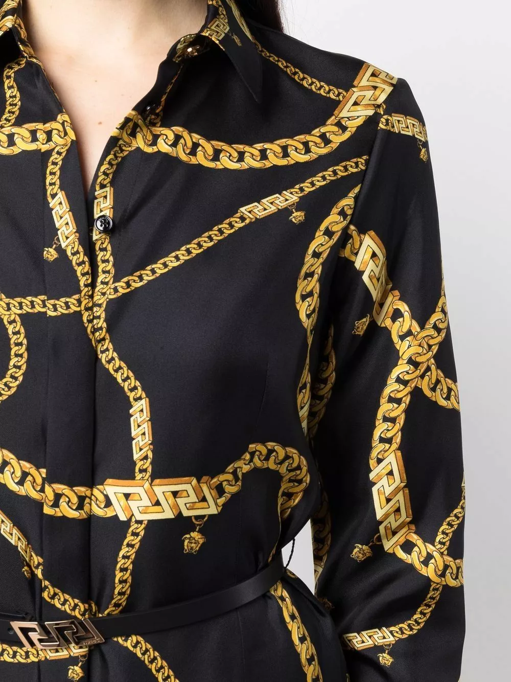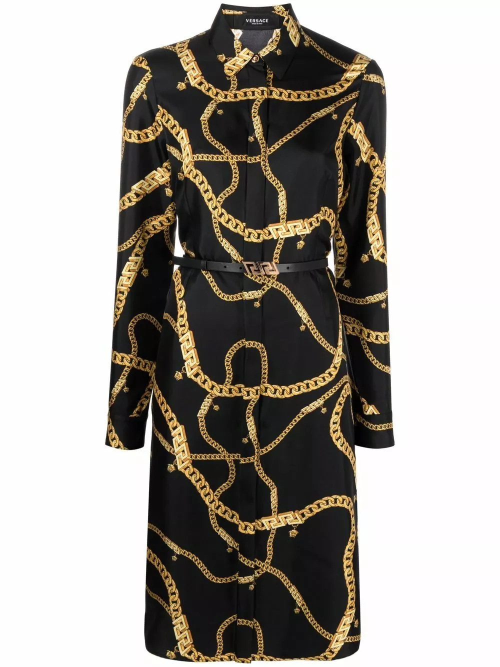 Versace’s shirtdress showcases the Italian house’s bold design aesthetic. Cut from black silk, this belted style is decorated with the brand’s signature gold Greca and chain-link motifs all over.