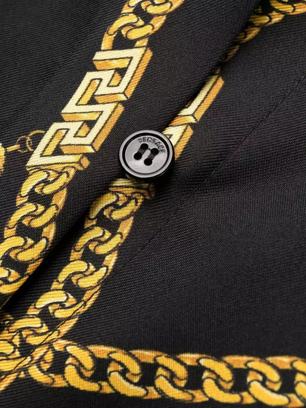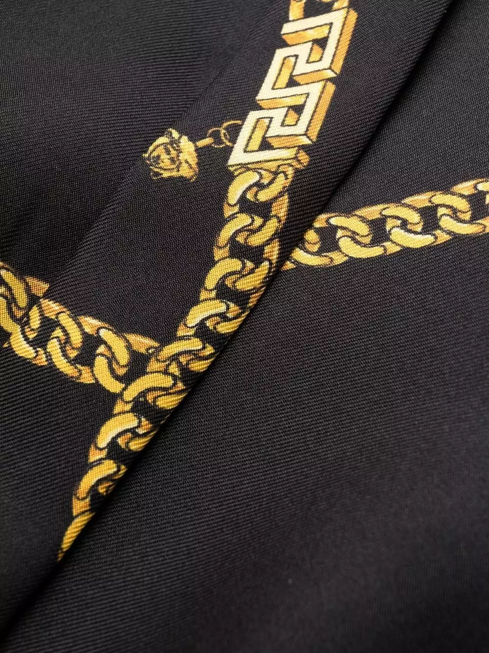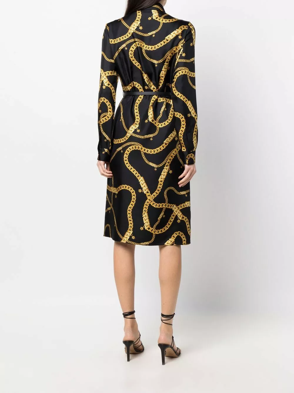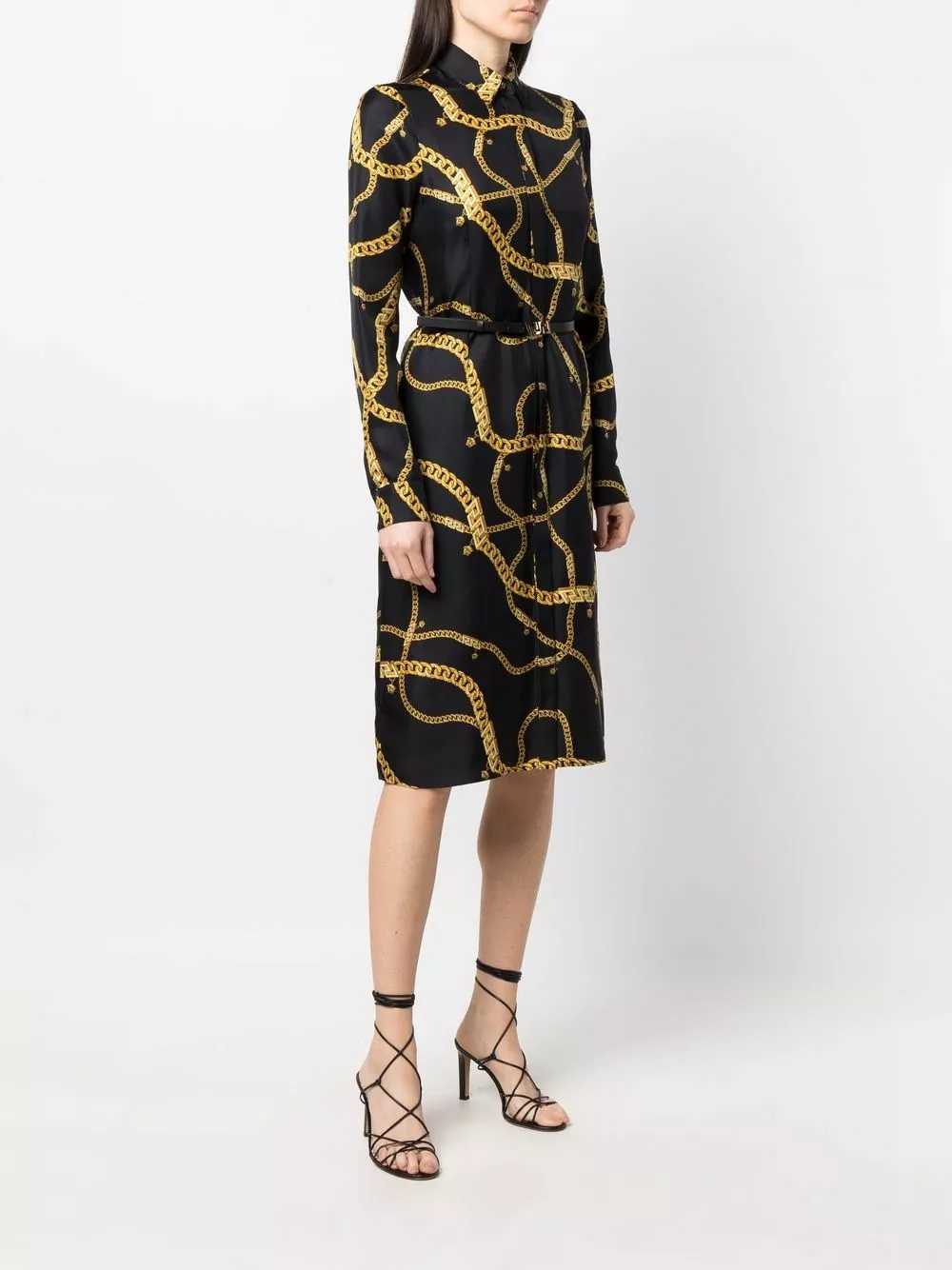 Versace’s shirtdress showcases the Italian house’s bold design aesthetic. Cut from black silk, this belted style is decorated with the brand’s signature gold Greca and chain-link motifs all over.