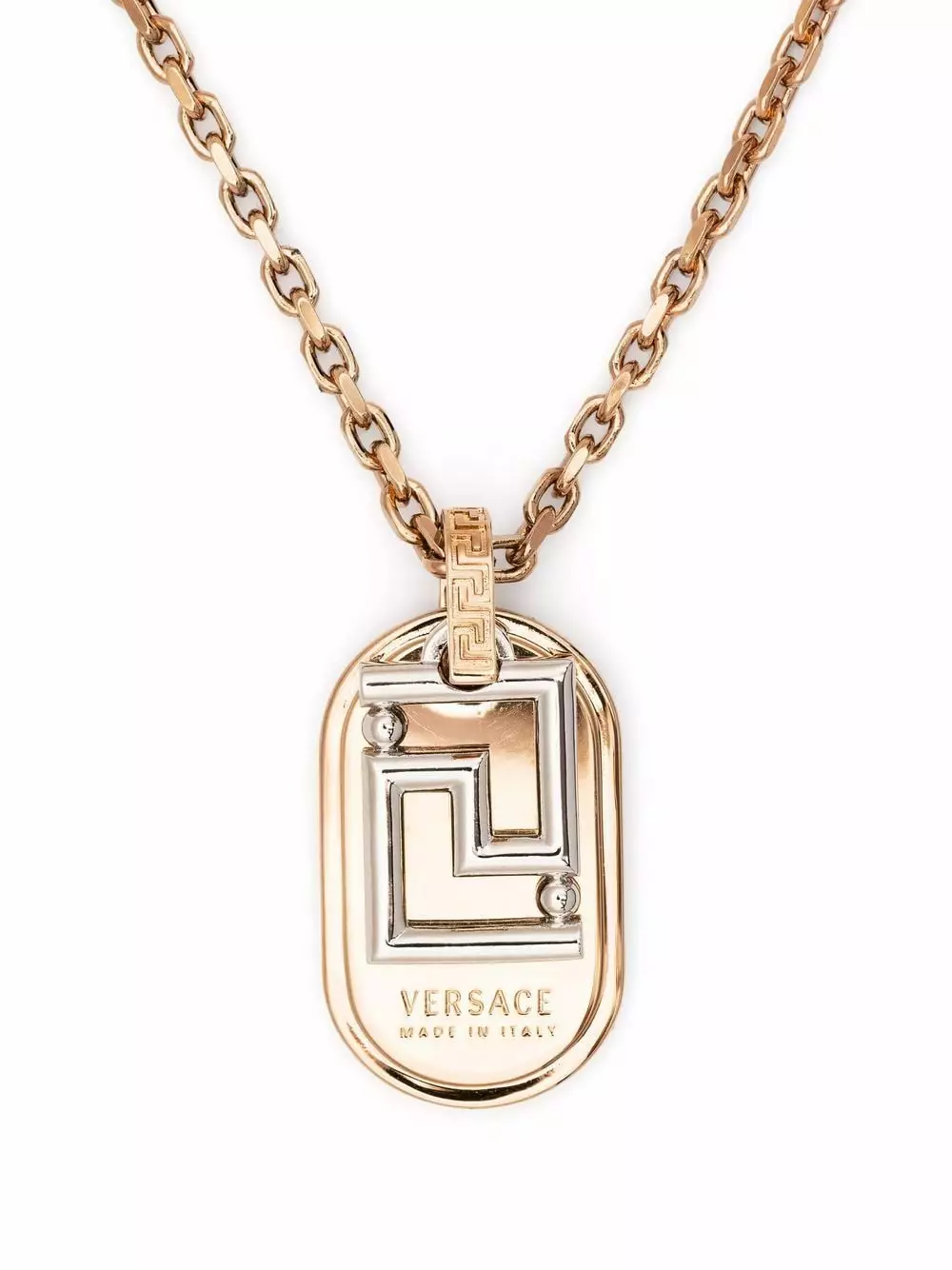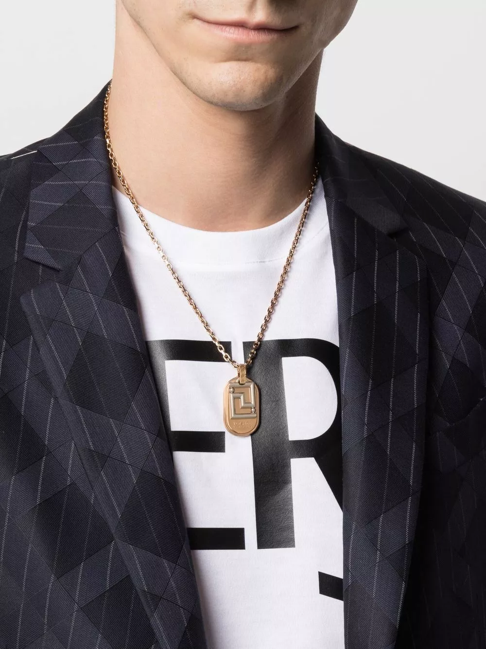 Logo T-shirts are a thing of the past. You show where your fashion loyalties lie by sporting this sleek Greca monogram detail necklace. With Versace, of course.