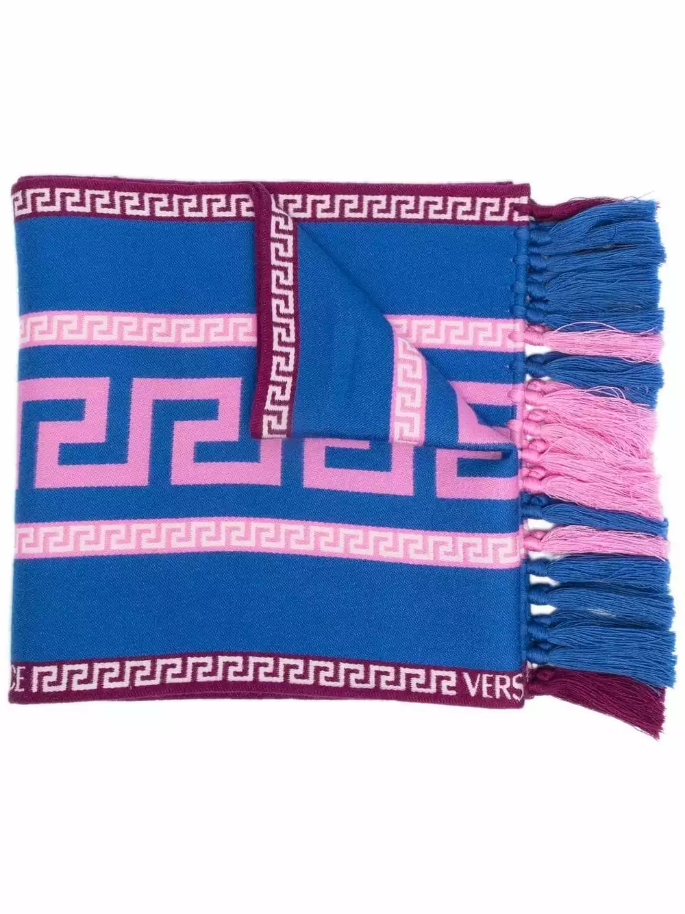 Inspired by Greek design, this Versace scarf features the signature Greca pattern as an intarsia knit. Known for creating bold designs, the brand’s use of bright blue and pink is signaturely eye-catching.
