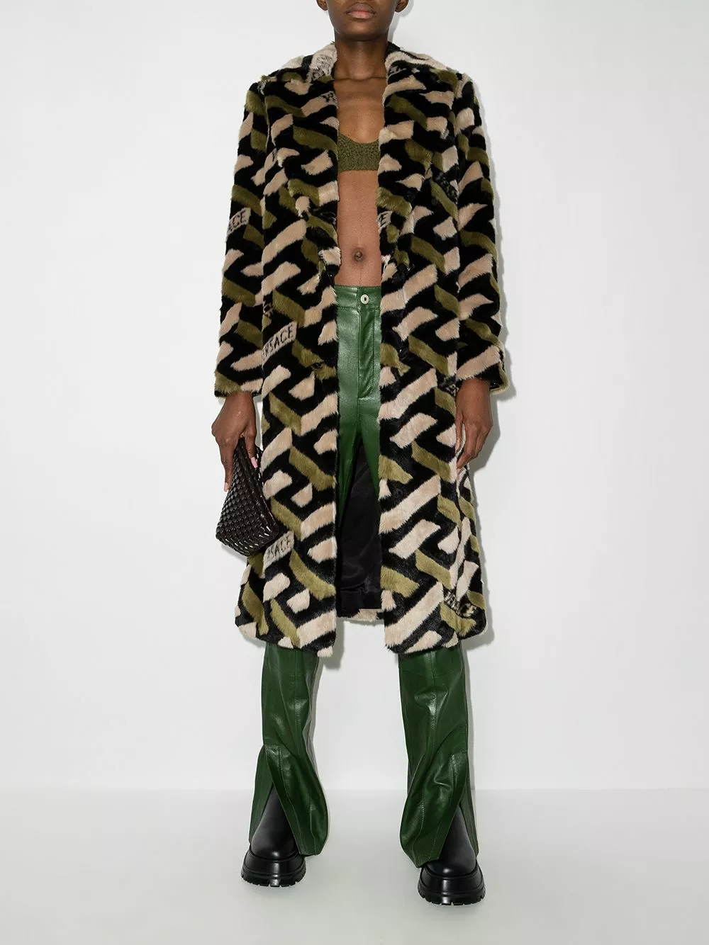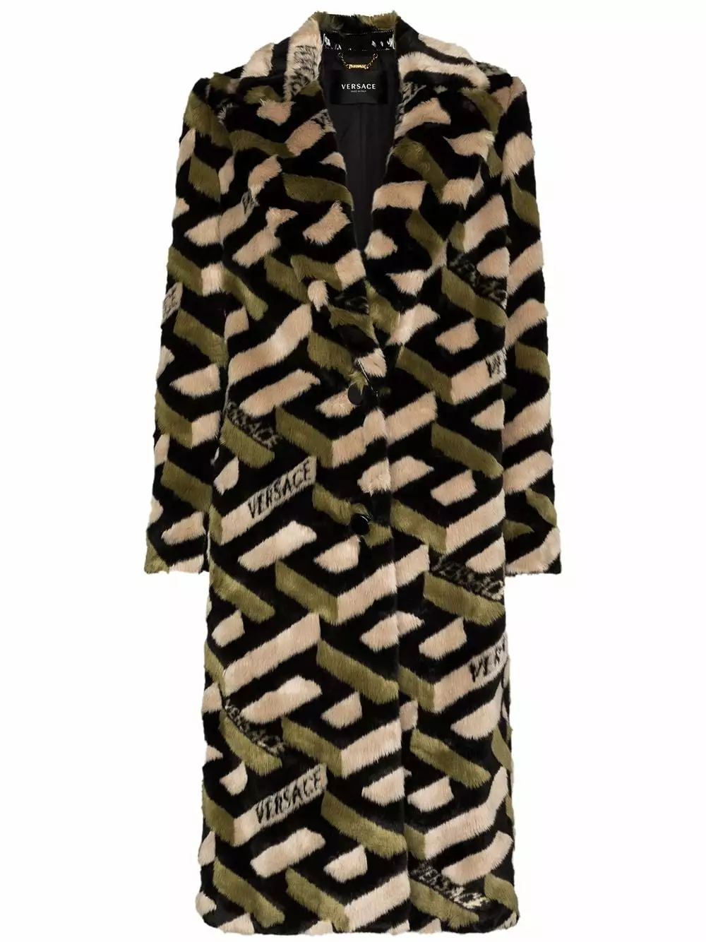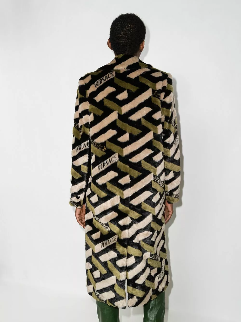 For AW21, Versace reworks one of their most iconic motifs into a contemporary iteration. Reimagined into a 3D-effect version, the Greca theme appears all over this midi coat, adding a signature look to its faux fur design.