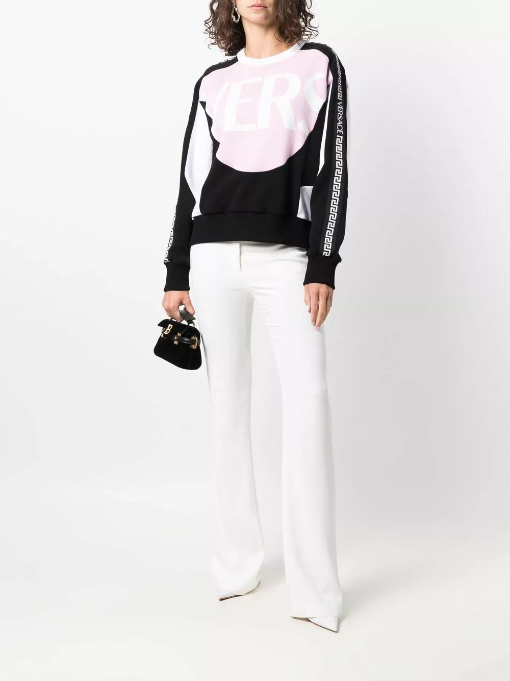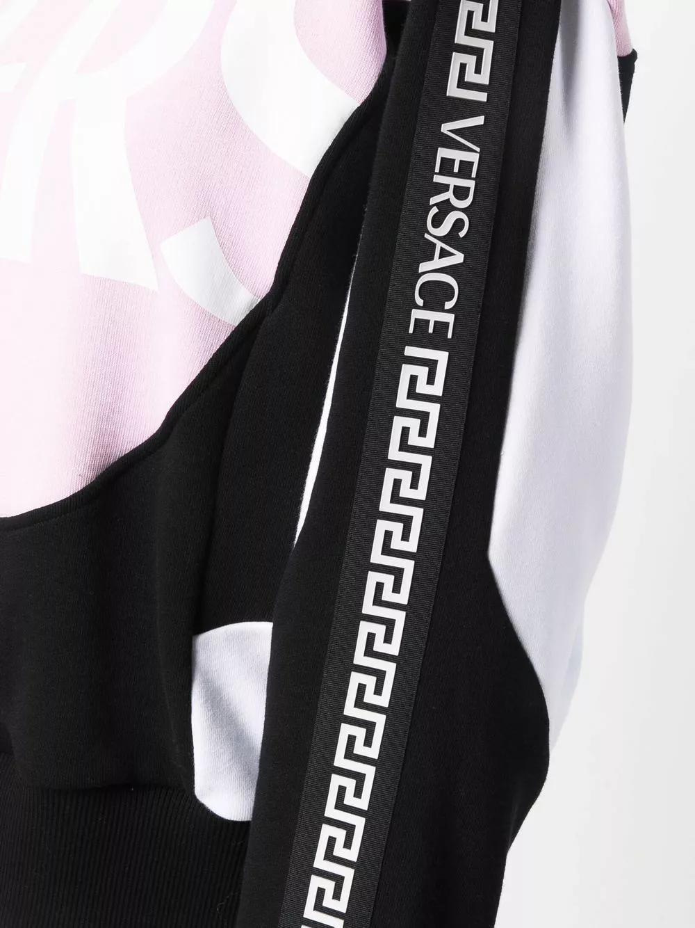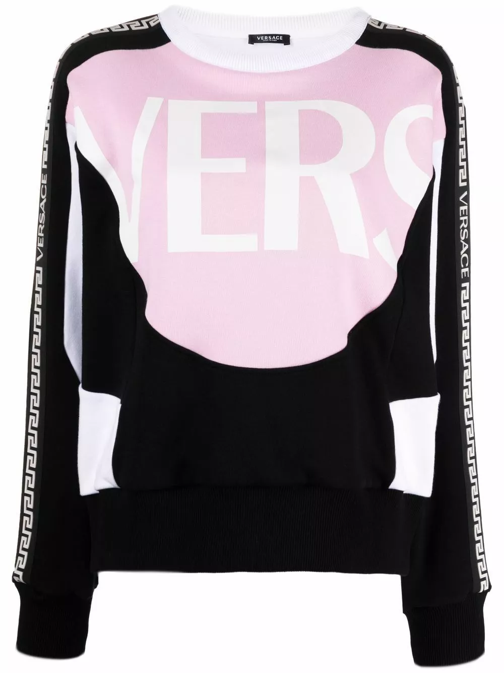 A brand staple, Versace’s Greca Key motif appears on a multitude of items season after season. Here, the iconic pattern is presented in distinct sizes all over this panelled jumper. The style is finished with a logo print to the front.