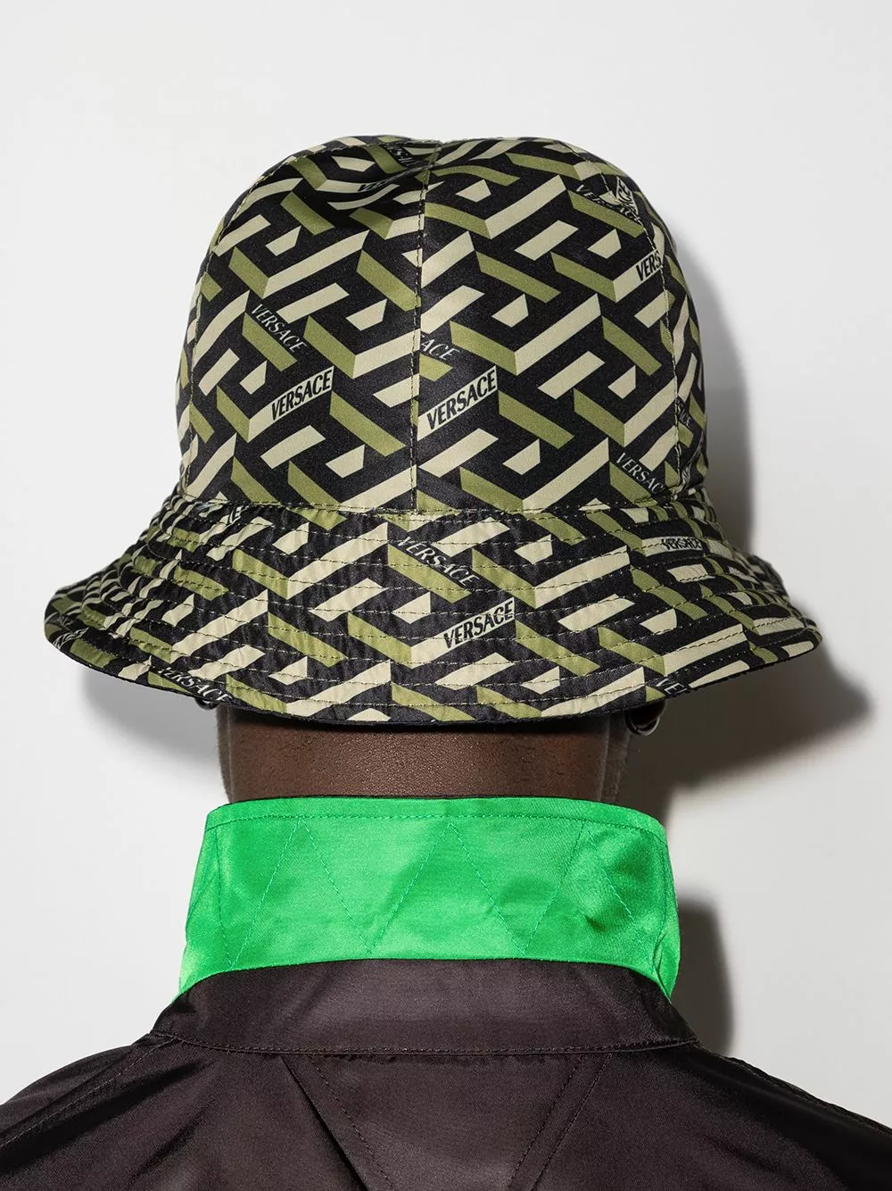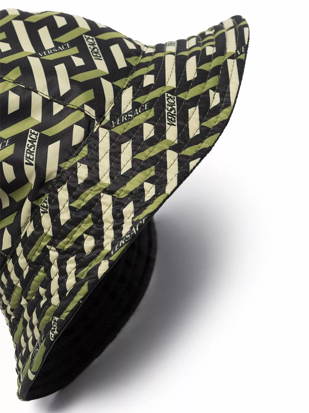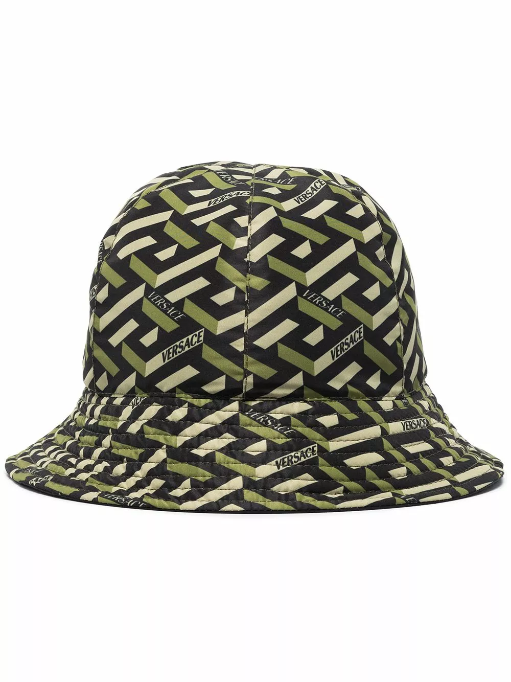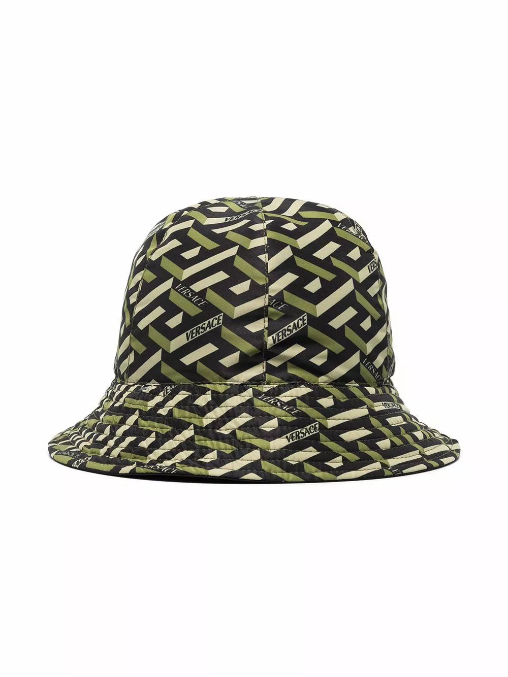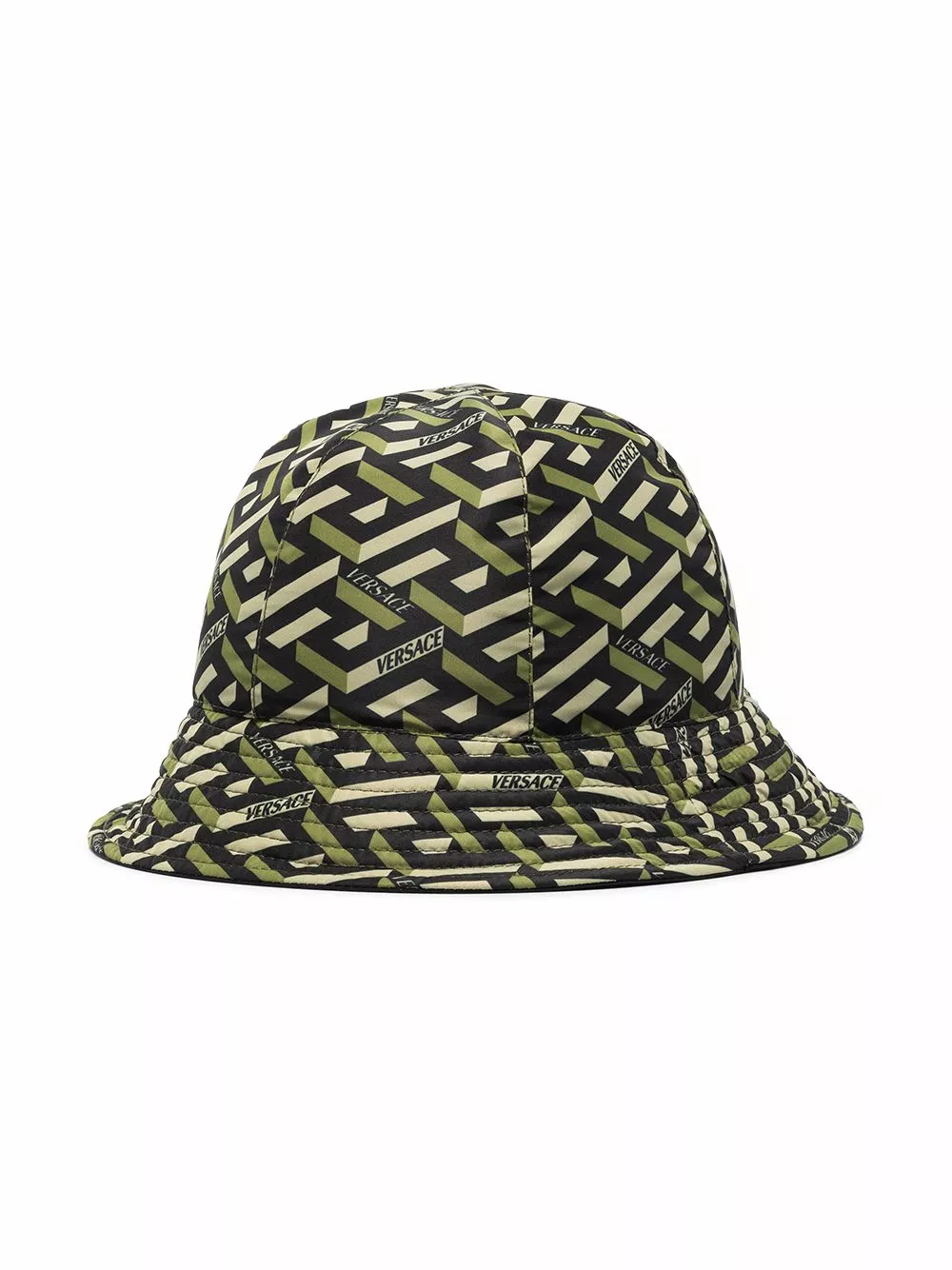 Versace presents a modern 3D version of its signature Greca pattern for SS22. Here presented in green and beige shades, it is printed all over this bucket hat.