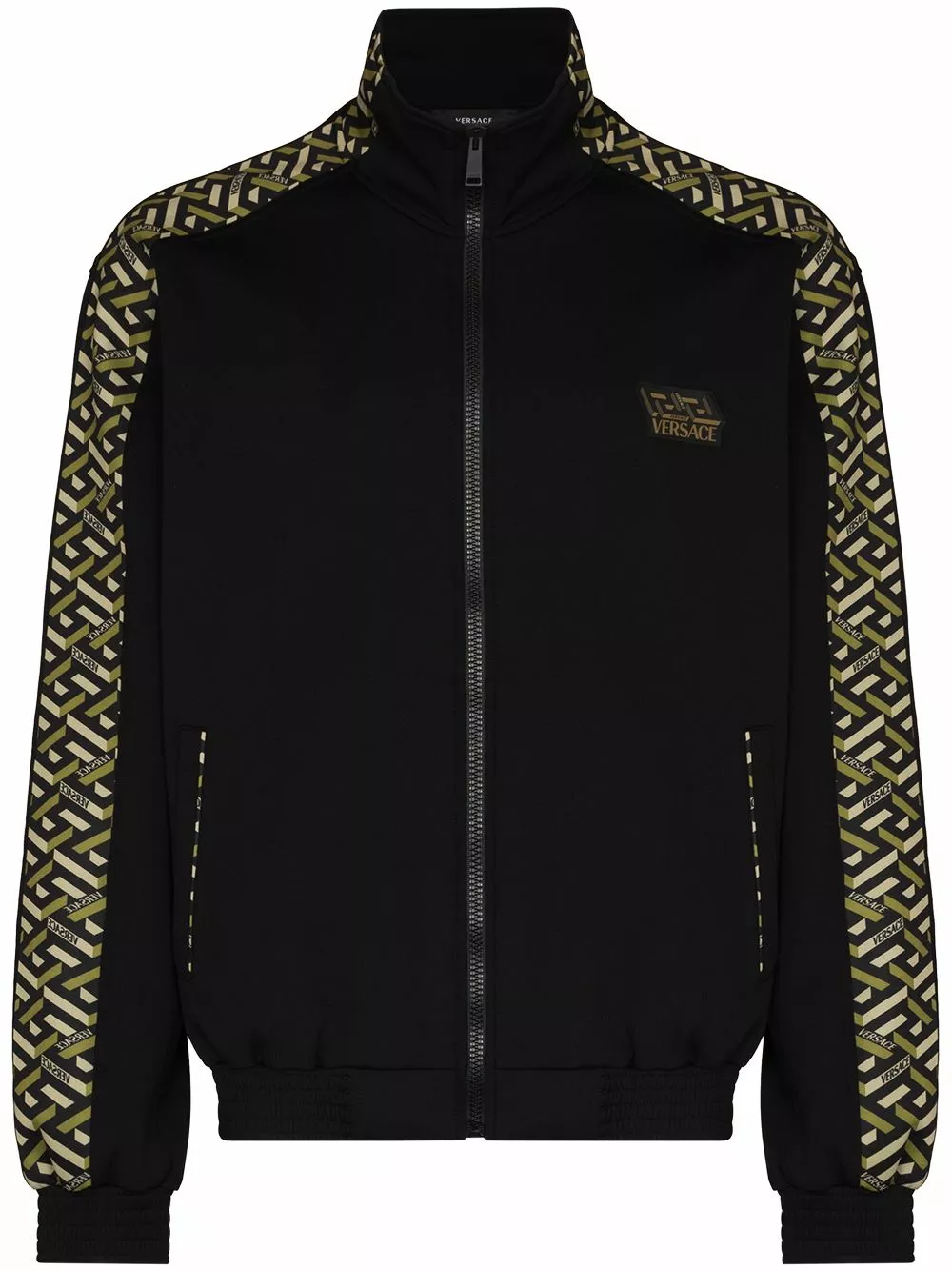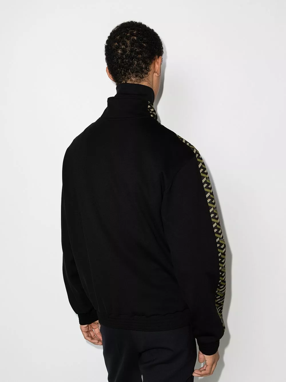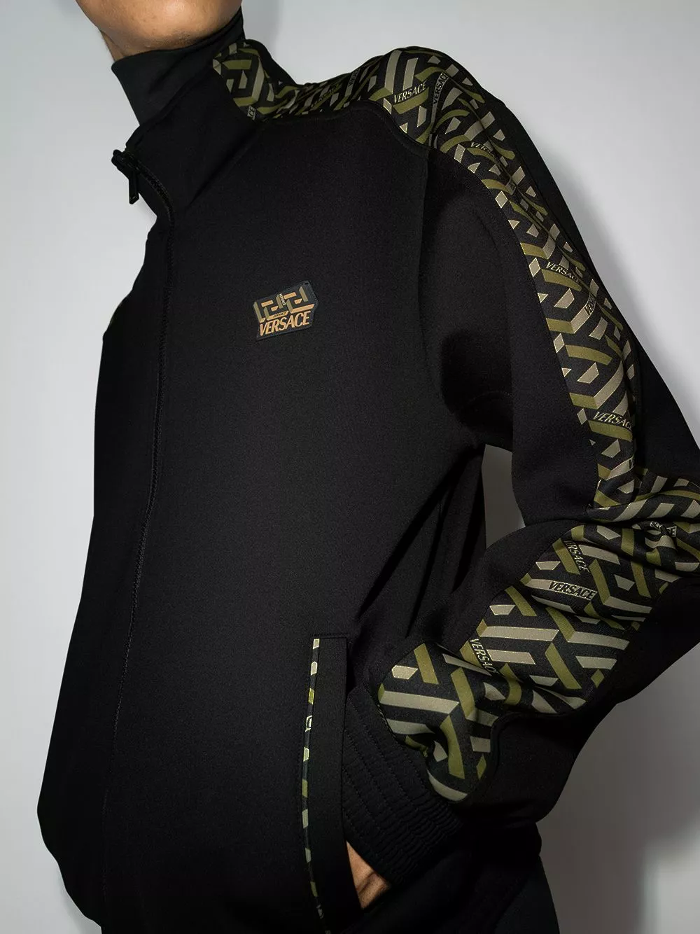 Reimagined for AW21, Versace’s iconic Greca motif is reworked into a 3D-effect print, as seen in this track jacket. Seen at the sleeves, the theme is echoed by a logo to the chest.