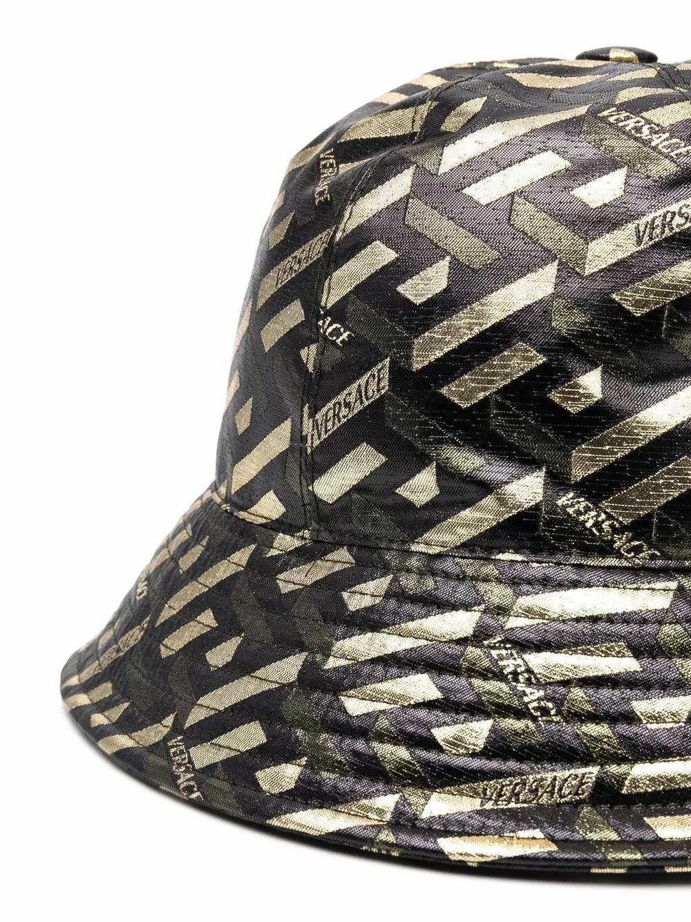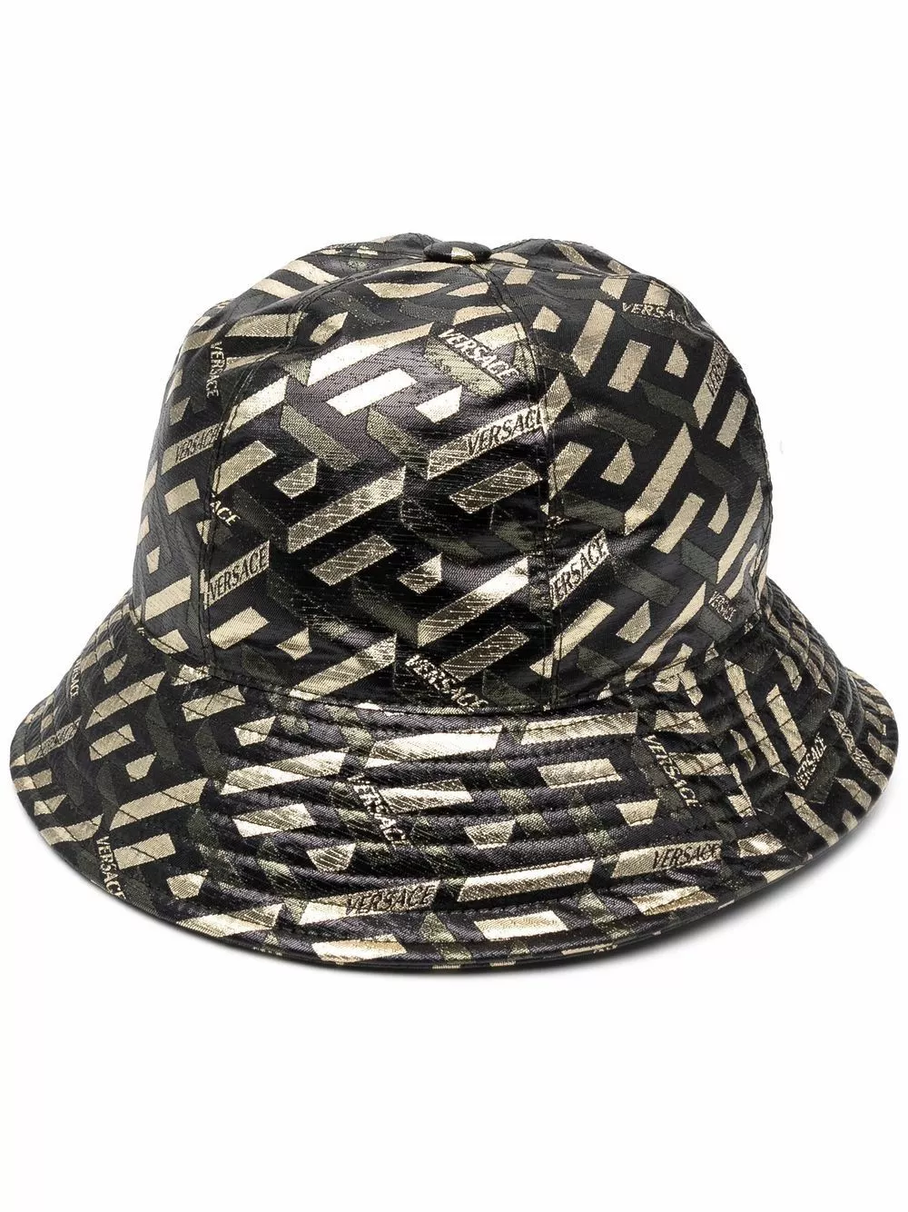 Imagined as an immersive 3D maze, Versace’s new Signature Greca print graces this black bucket hat. The design features the signature Greek Key along with a contemporary version of the label’s logo.