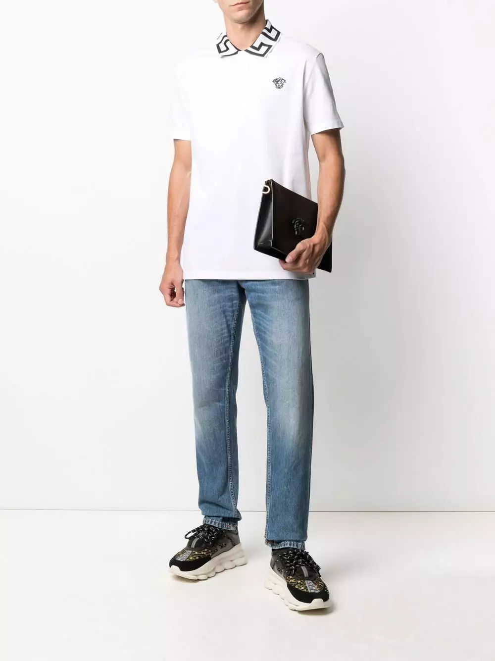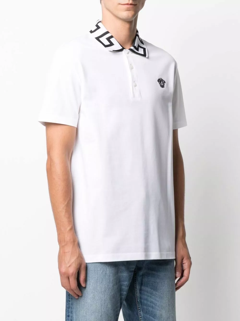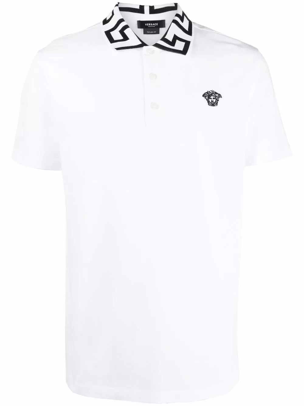 Versace’s signature Greca trim decorates the collar of this cotton short-sleeve polo shirt. Fabricated in Italy, the Medusa is detailed in a contrasting embroidered motif.