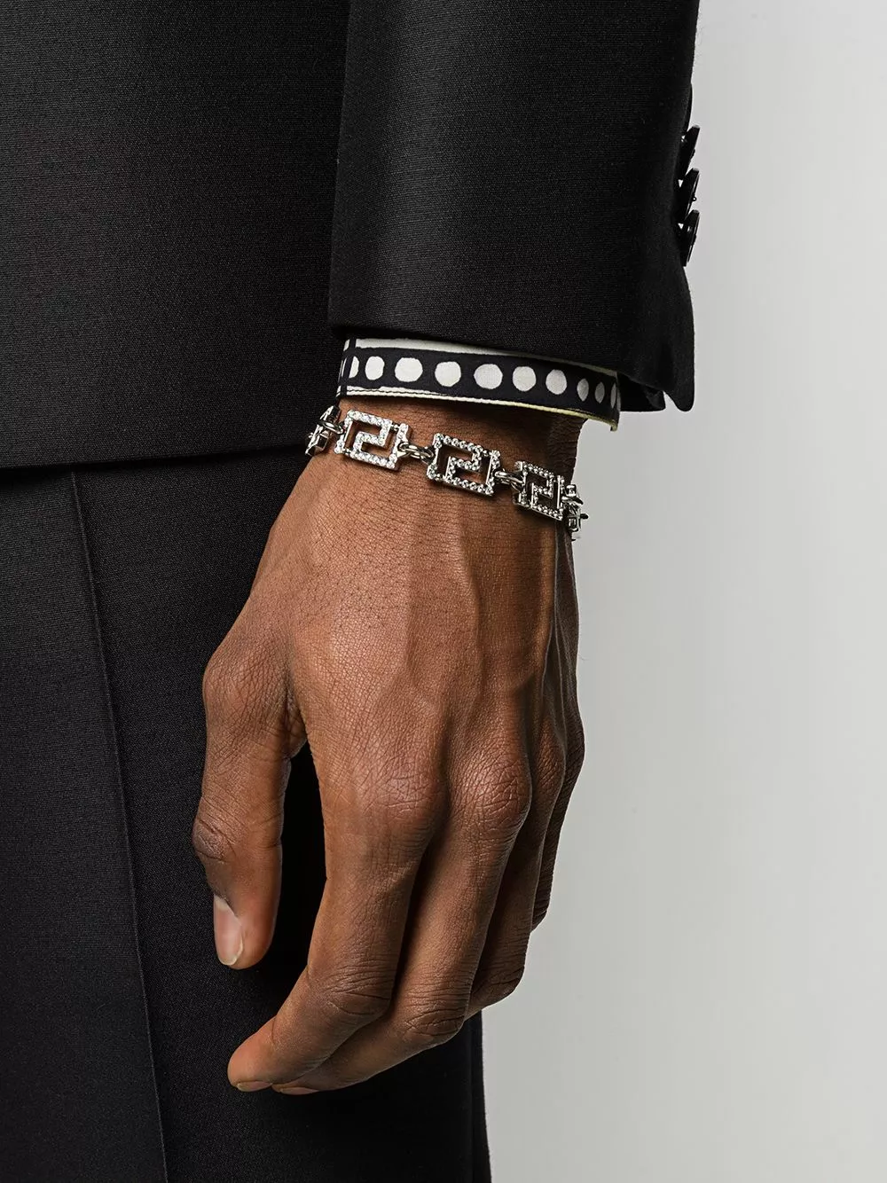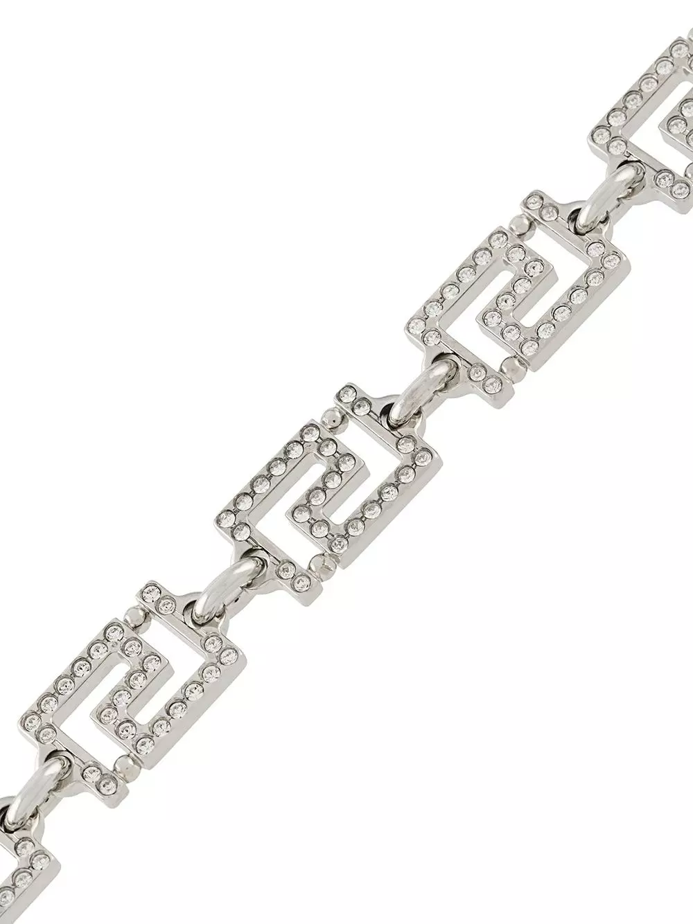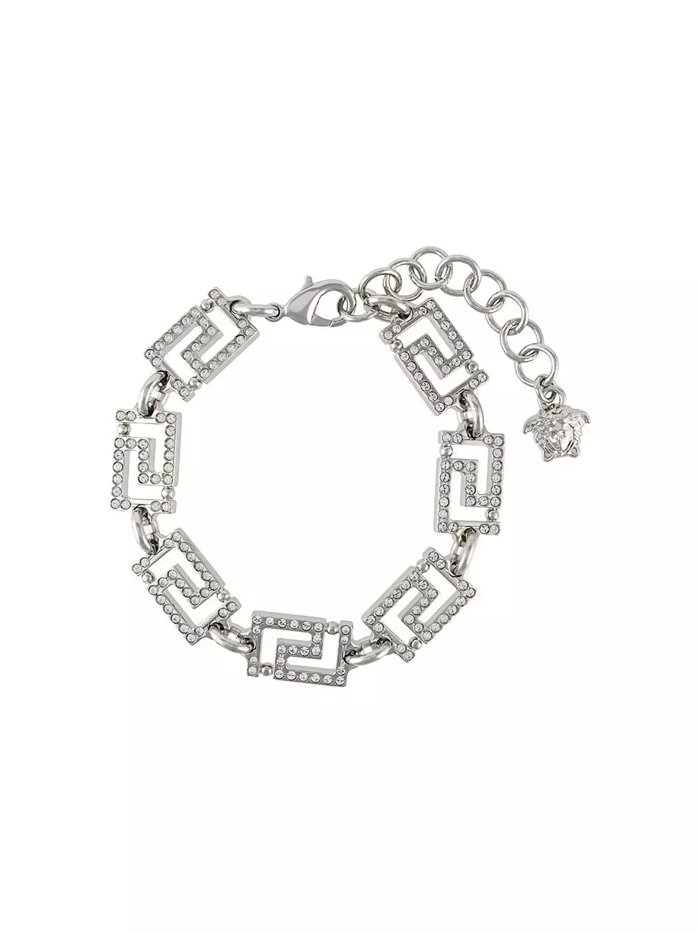 Looking for a new signature piece? This crystal embellished, Greek Key bracelet from Versace is offering to fill that role. And it does tick all of the boxes… Featuring crystal embellishments, a clasp fastening, an adjustable fastening, a silver-tone finish and a Greek Key strap.