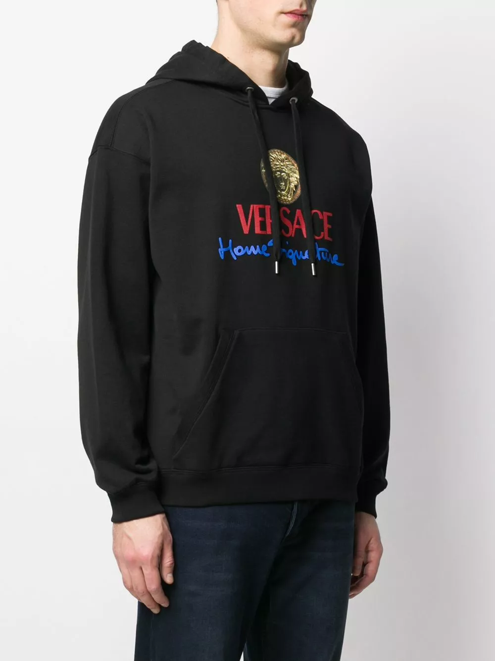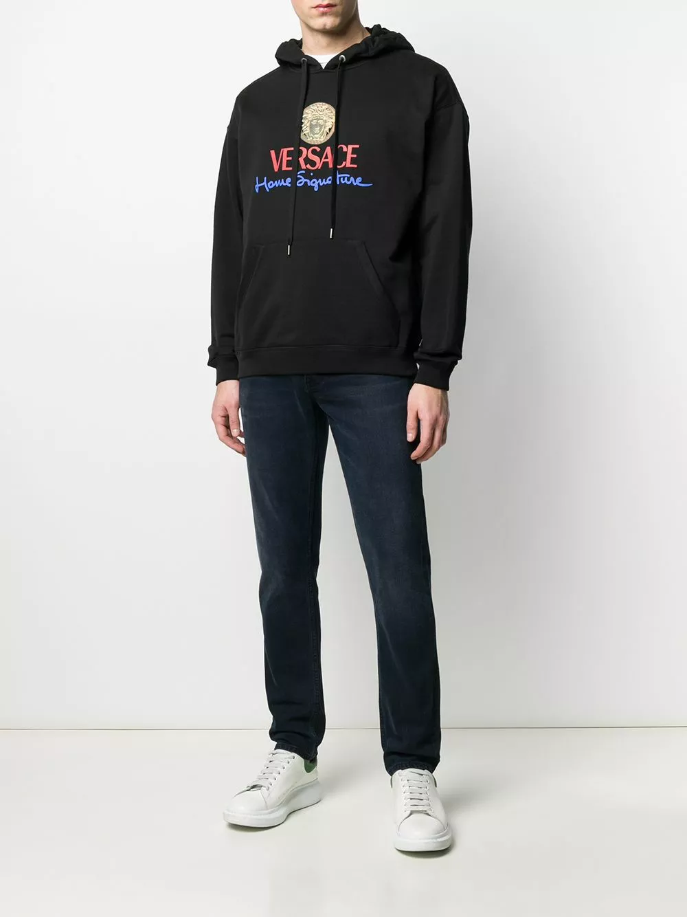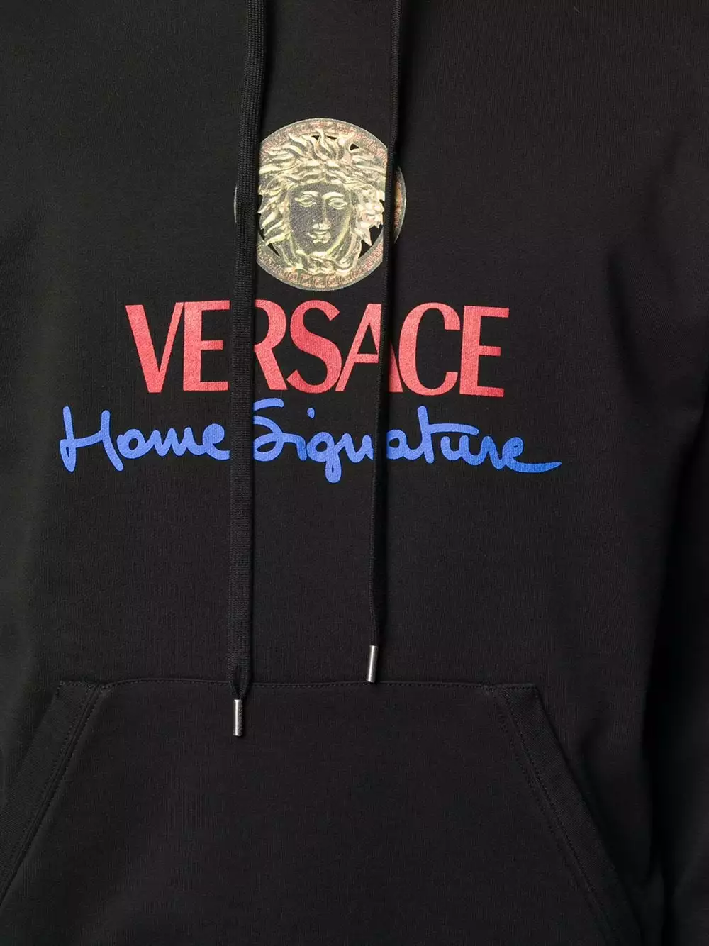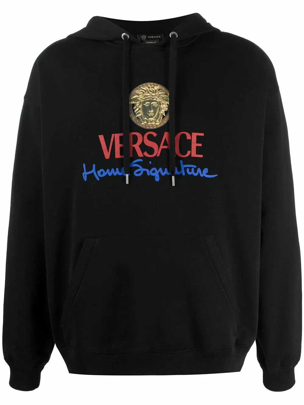 Warning: do not wear this hoodie solely at home. Crafted in Italy from soft black cotton, this Home Signature logo hoodie from Versace deserves to be seen by the whole world. Take it to the streets. Featuring a relaxed fit, a drawstring hood, dropped shoulders, long sleeves, a printed logo to the front and a kangaroo pocket.