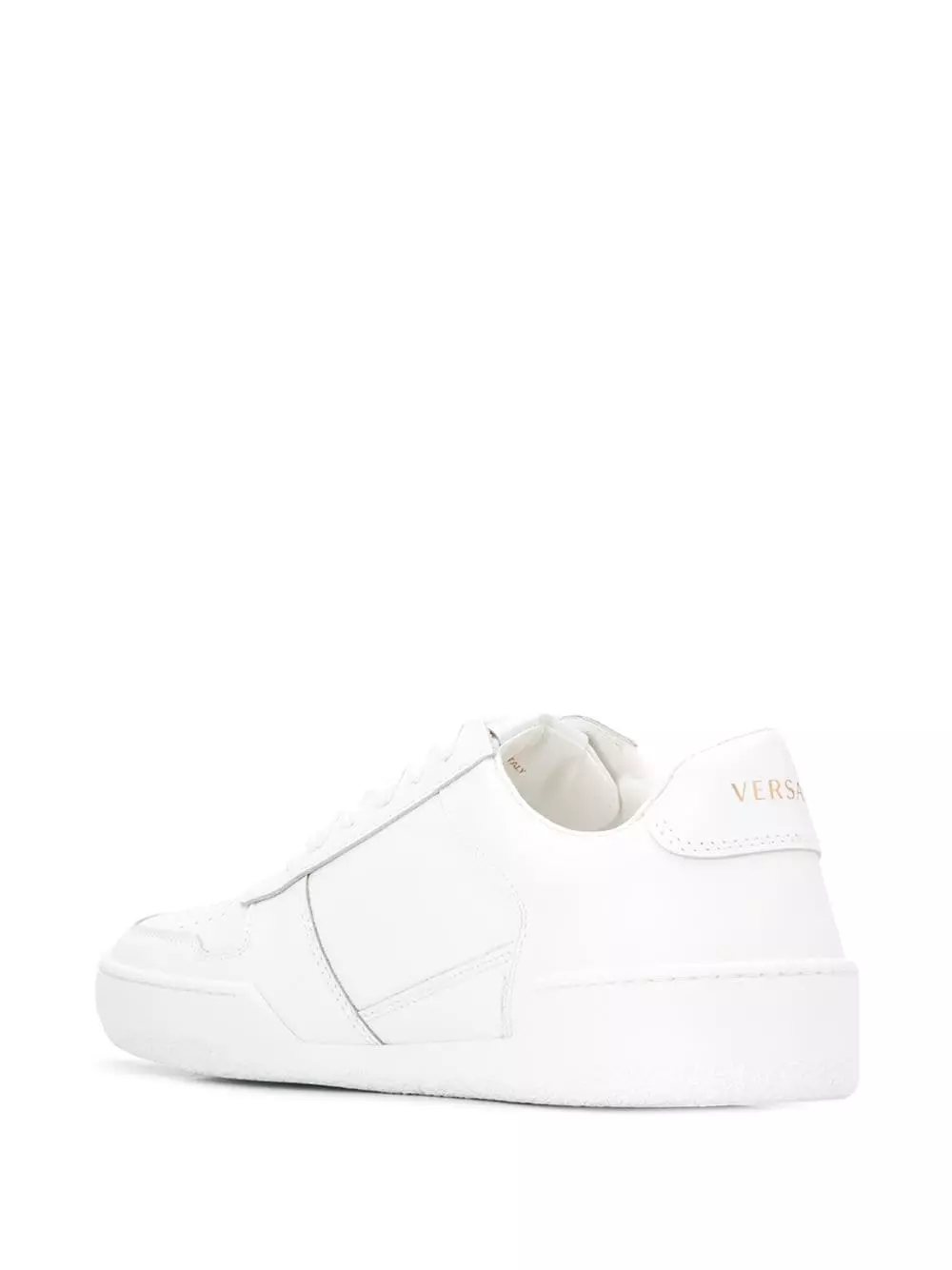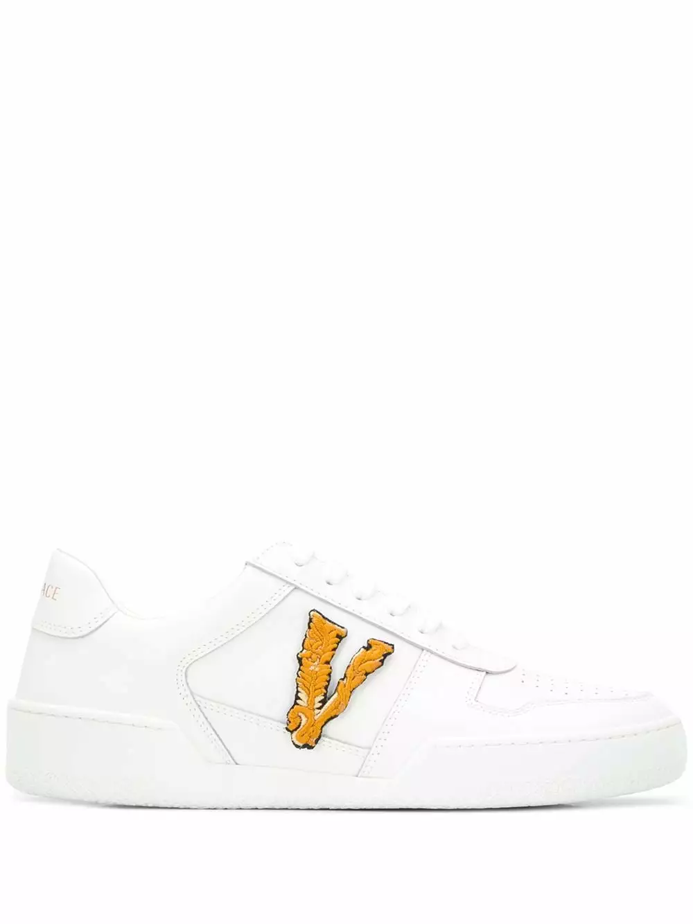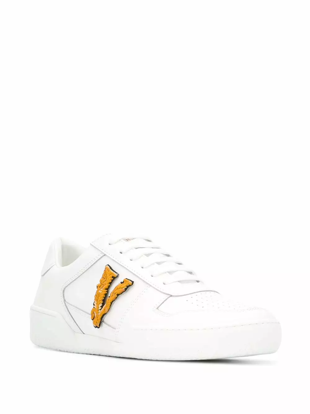 Update your footwear with these latest Ilus Virtus sneakers from Versace. Crafted in leather, these white sneakers are characterised by their gold-tone Barocco acanthus leaf V logo patch. Sporty yet smart. Featuring a round toe, a lace-up front fastening, a perforated detail, branded heel counter, a rubber sole and a gold-tone Barocco acanthus leaf V logo patch.