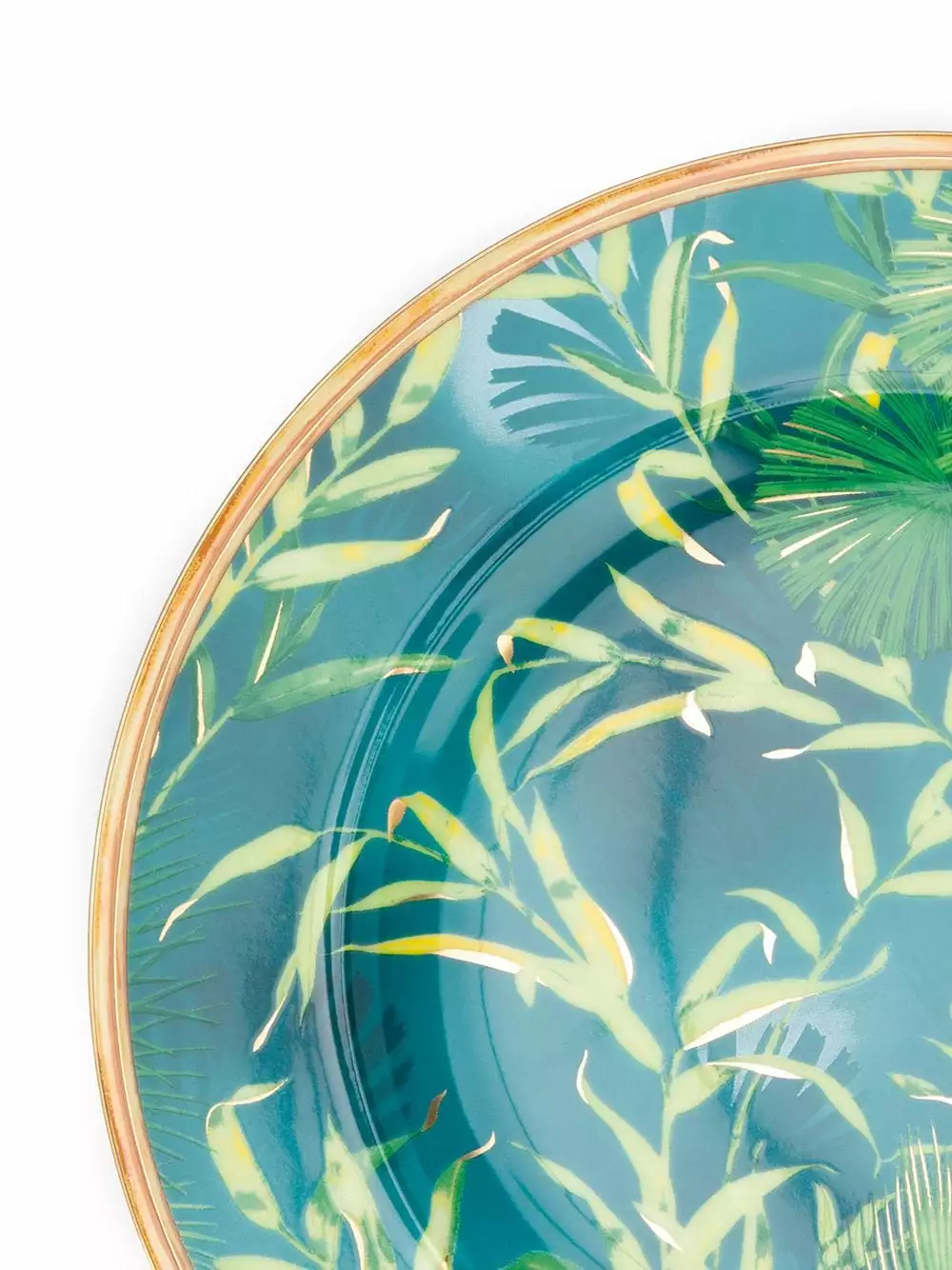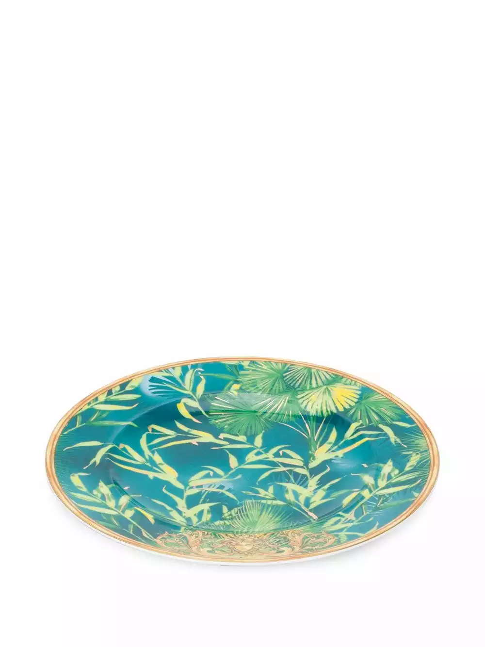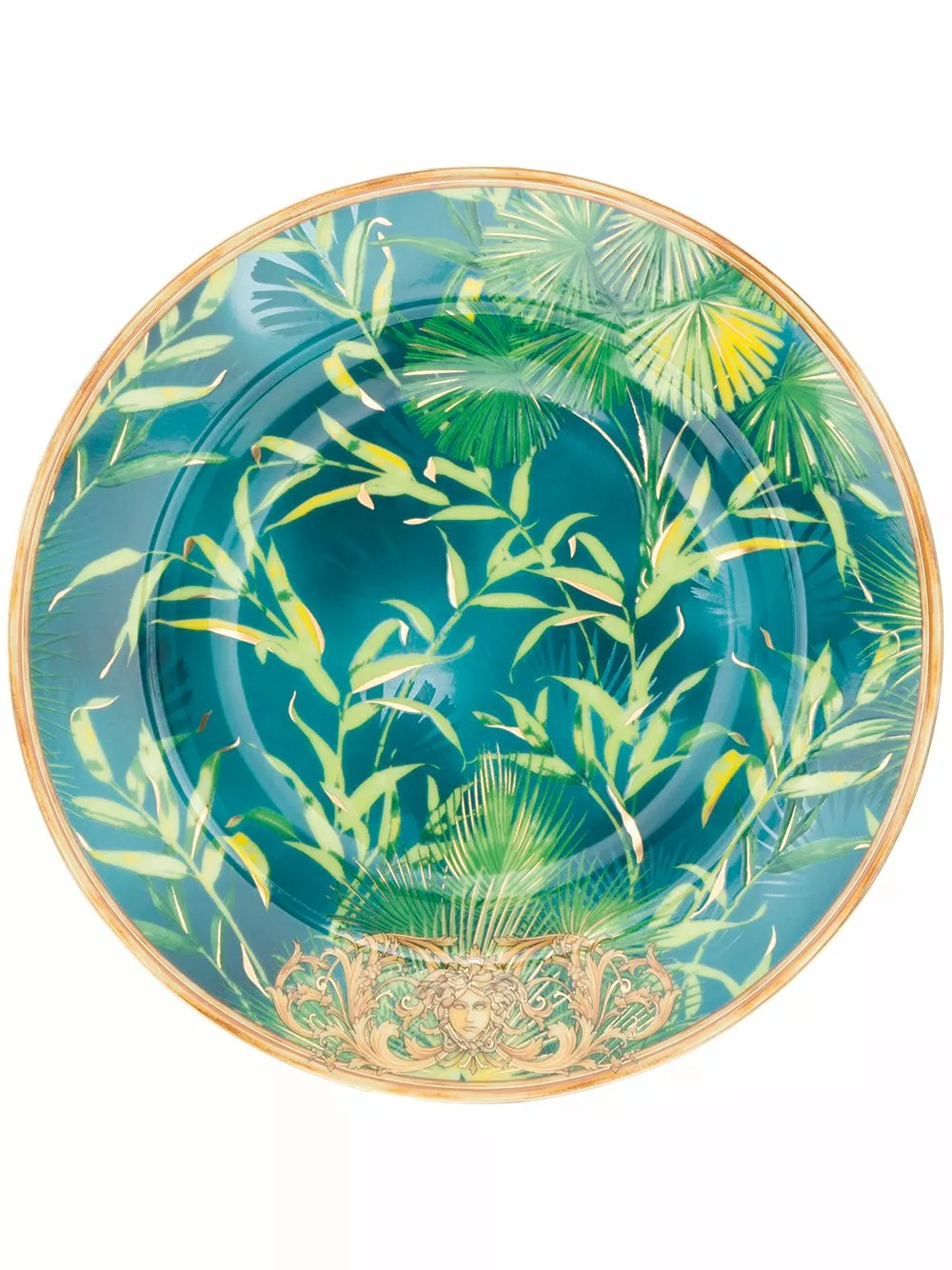 Green porcelain jungle-print round plate (18cm) from Versace Home featuring a jungle print, a Medusa detail and a curved structure.