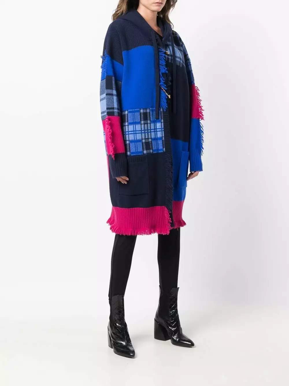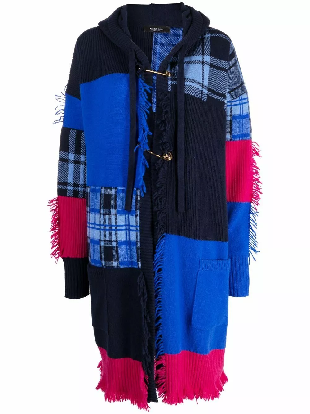 Unconventional in design, this knitted coat from Versace is constructed from a mix of contrasting panels. Its asymmetric silhouette is accented with frayed edges and fastened with the label’s iconic Medusa Head safety pins to the front.