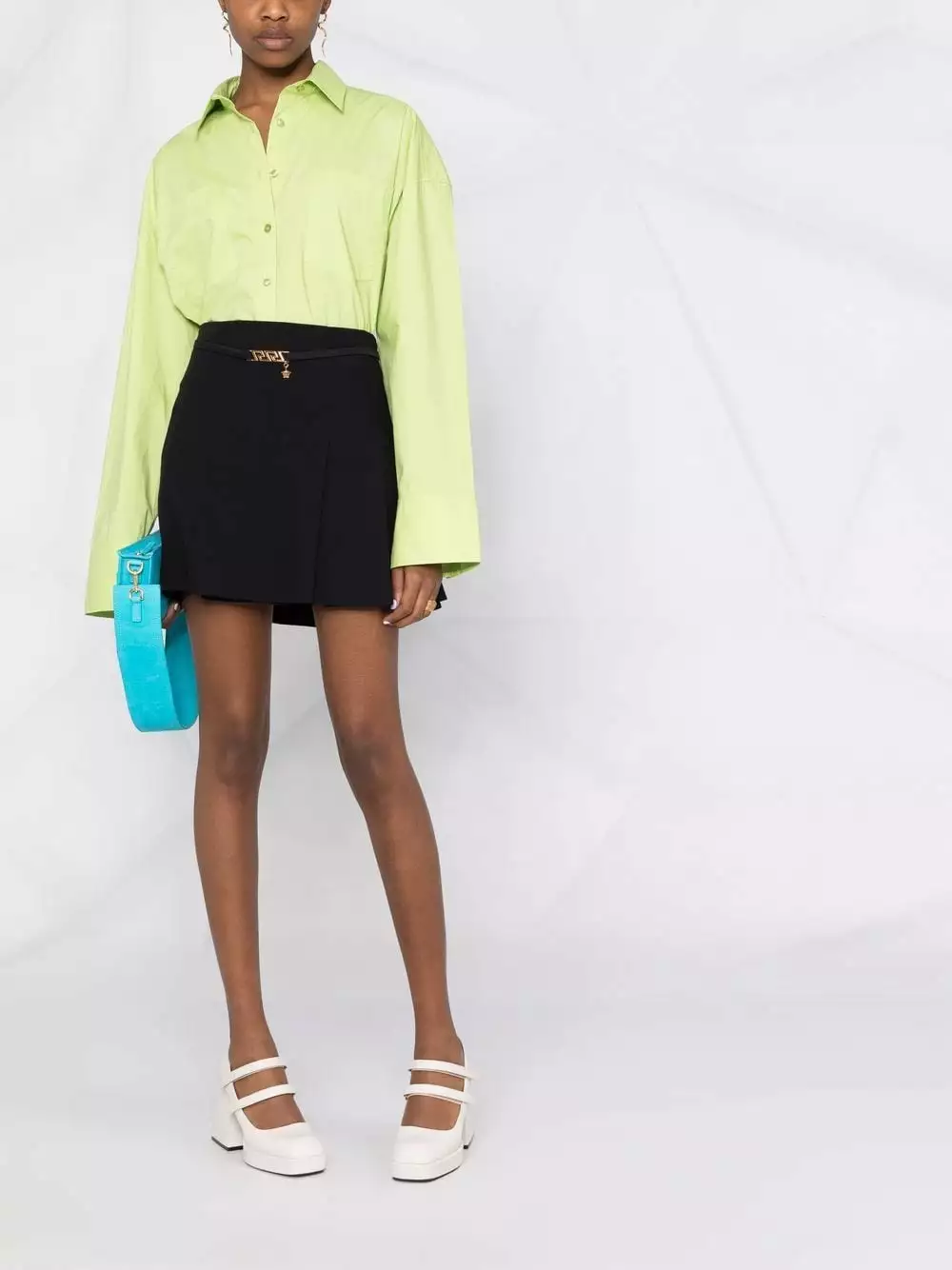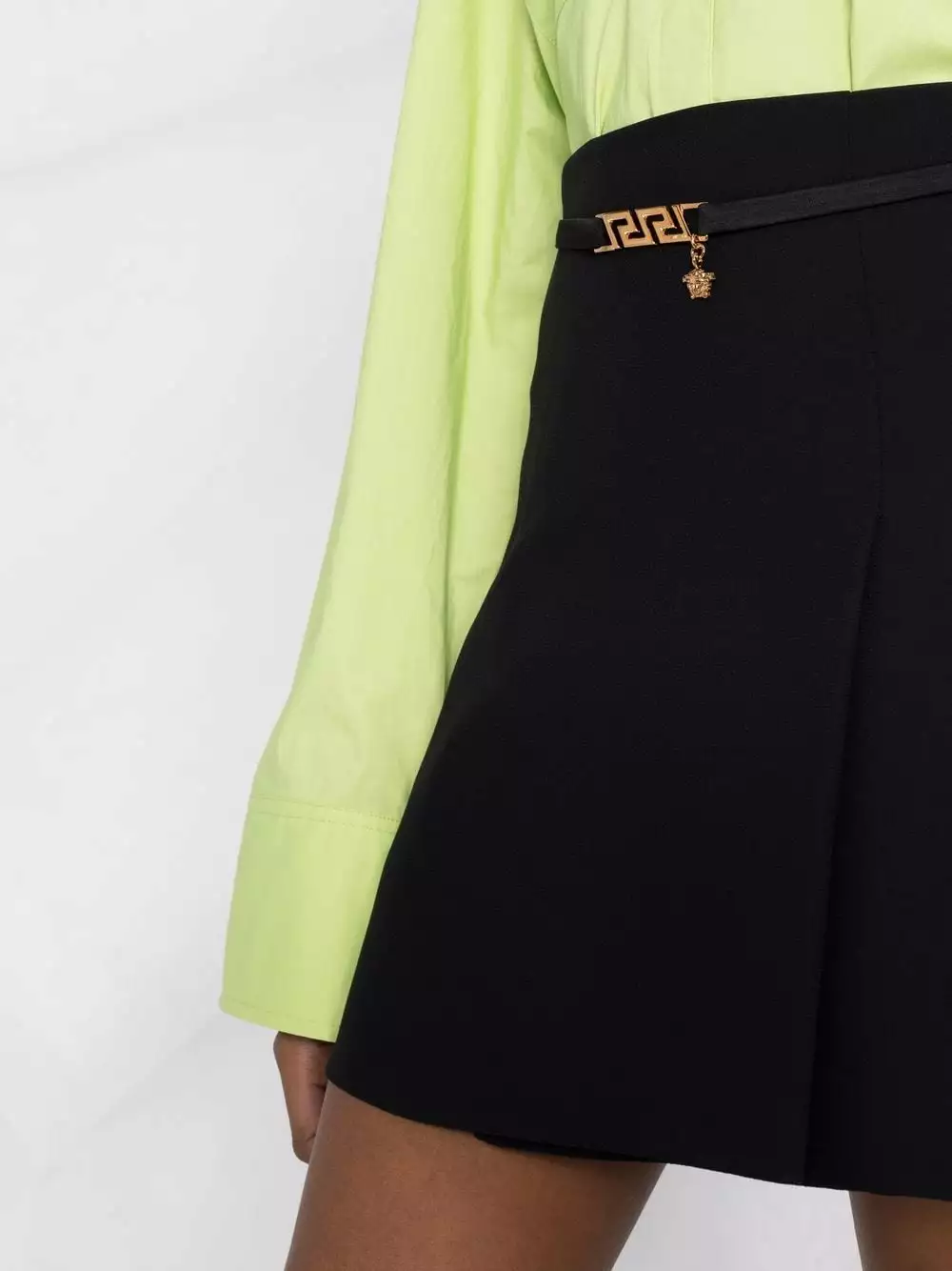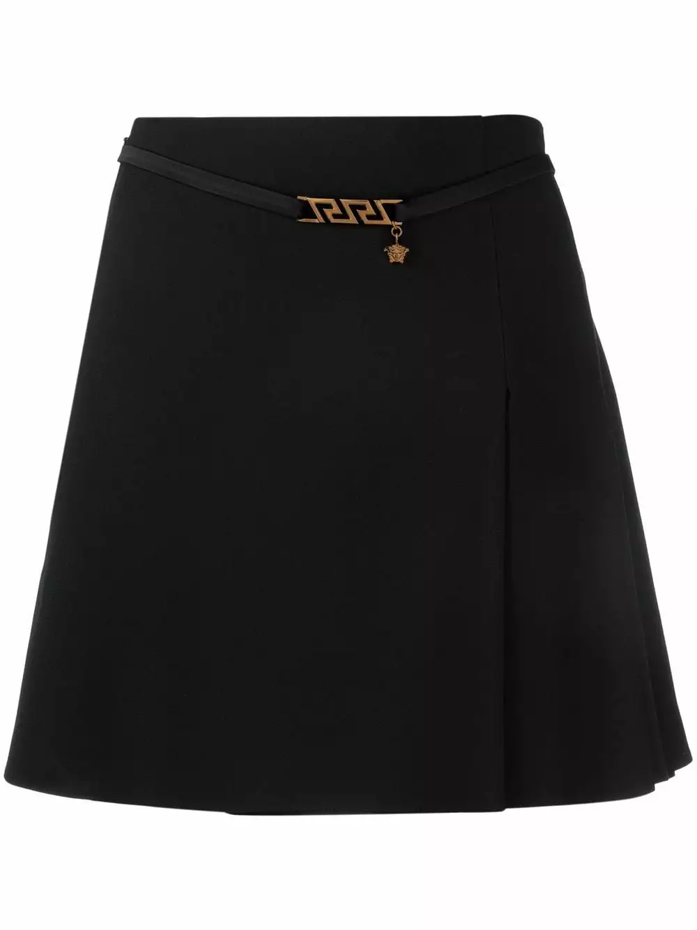 Versace’s Italian-made mini skirt is detailed with the brands La Greca chain motif to the front. Fabricated in a silk-blend, it features an A-line silhouette with subtle pleating.