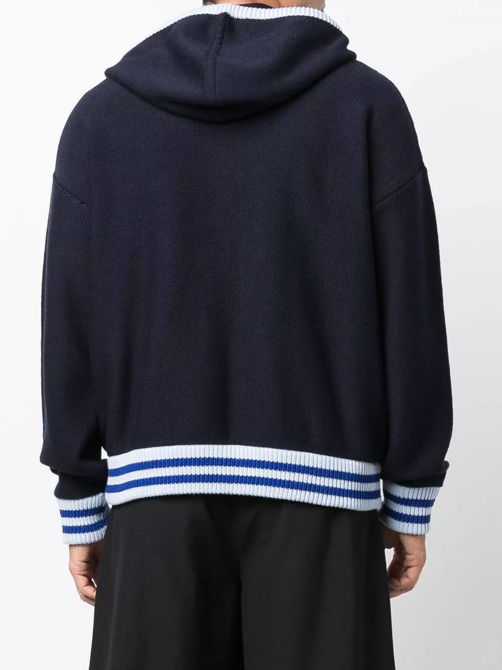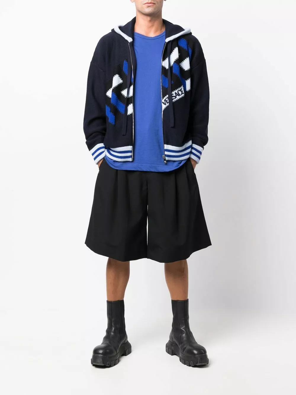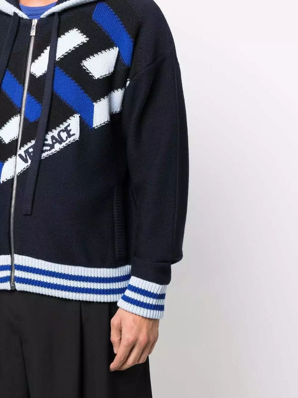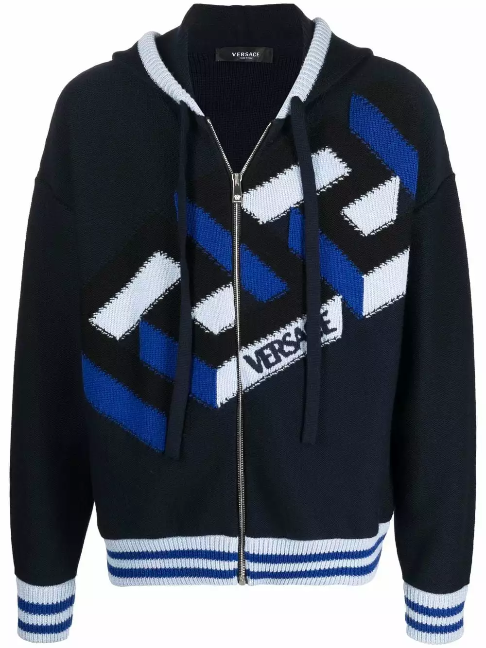 Spun from virgin wool in navy blue, light blue and black hues, this intarsia-knit zip-up hoodie from Versace is decorated with the brand’s signature La Greca motif and a logo to the front for an instantly recognisable look.