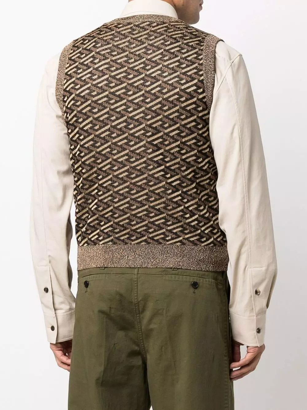 Versace exudes refined modern elegance with this La Greca pattern knitted vest. Knitted with gold-tone metallic threading, this garment shimmers gently and fits comfortably with a snug fit.