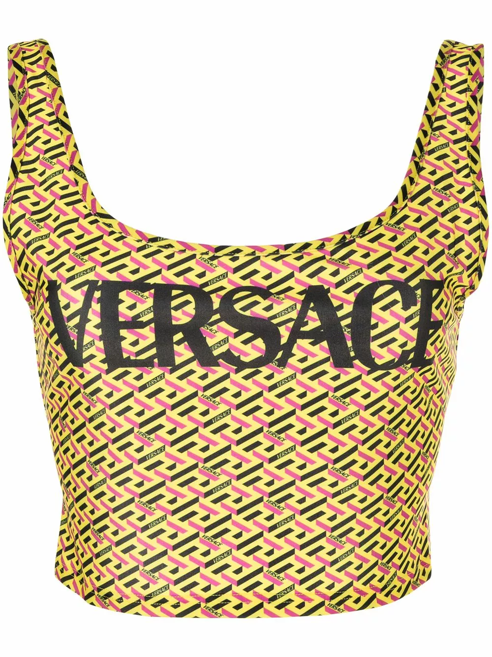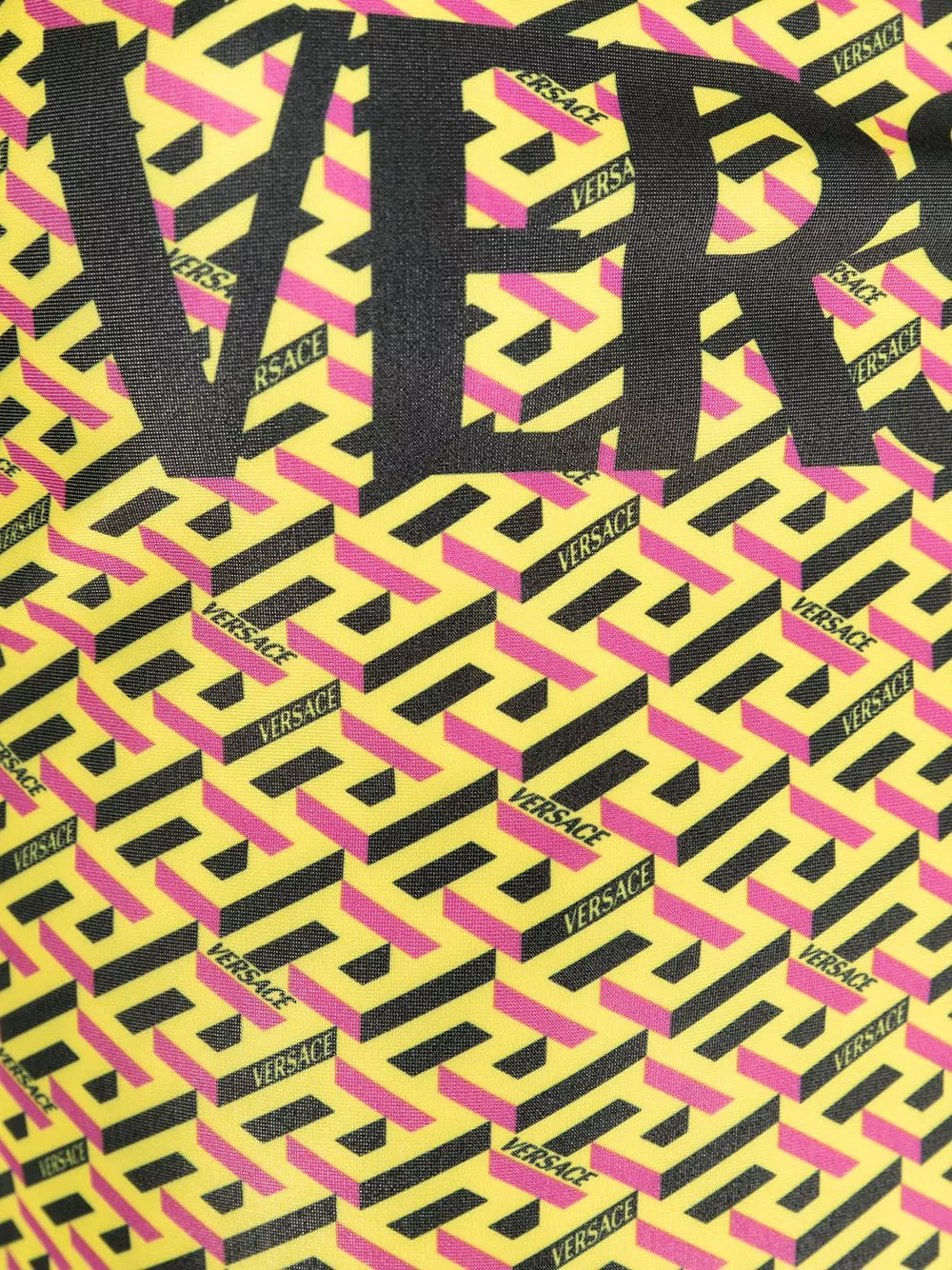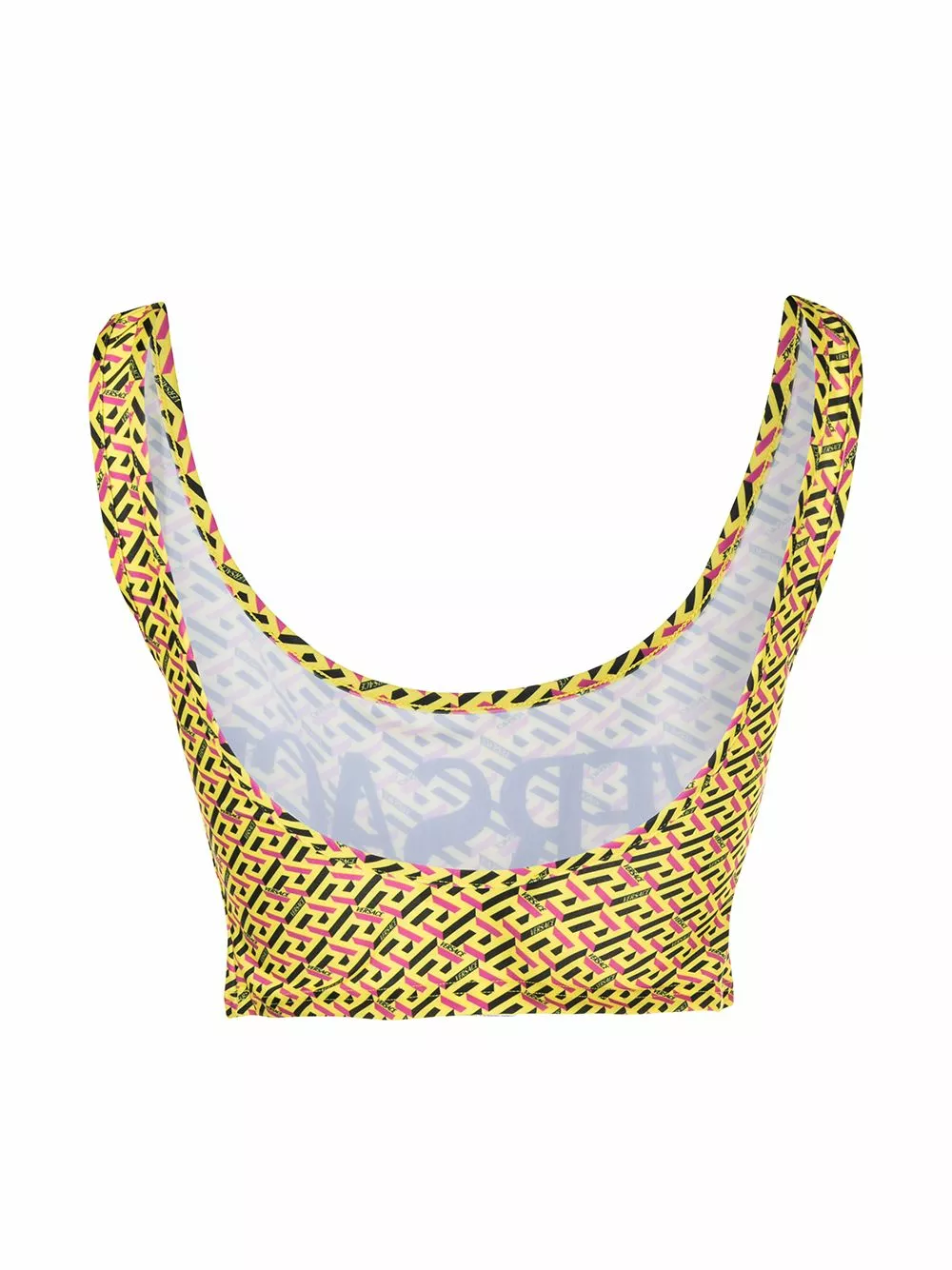 Versace’s La Greca pattern can be seen adorning many offerings from the Autumn-Winter 2021 collection, including this bikini top. Featuring the bold graphic pattern realised in yellow and pink, a contrasting black logo is printed at the front.