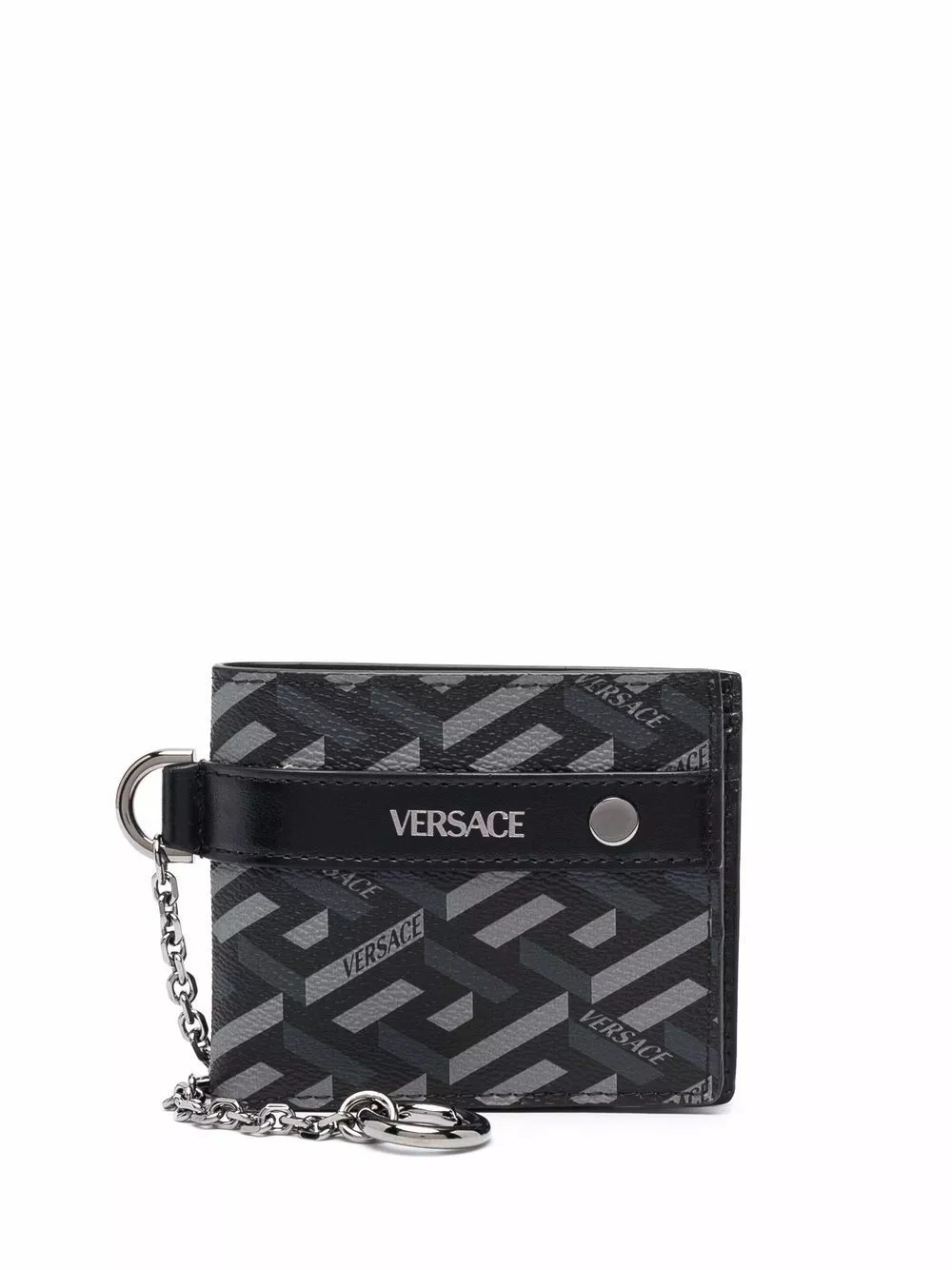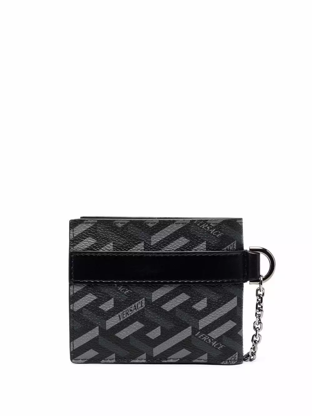 Versace goes graphic with their latest small leather goods for the Autumn-Winter 2021 collection. This La Greca print cardholder has a 3-D-reminiscent design and is branded to the front with a logo stamp and finished with silver-tone stud detailing. Note the clip hook attached which allows the accessory to fasten to keyrings.