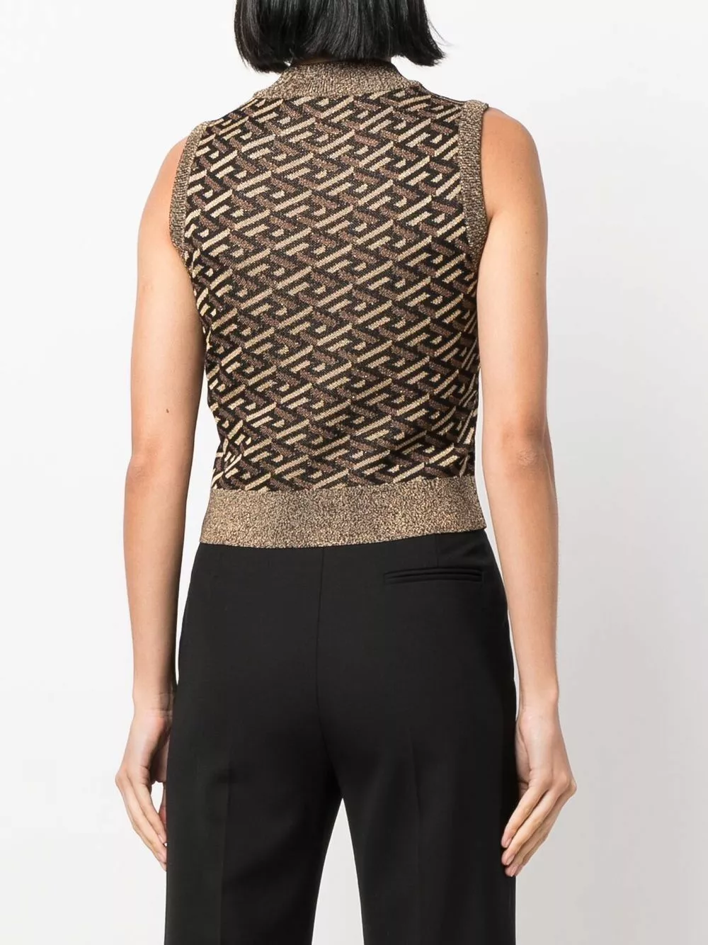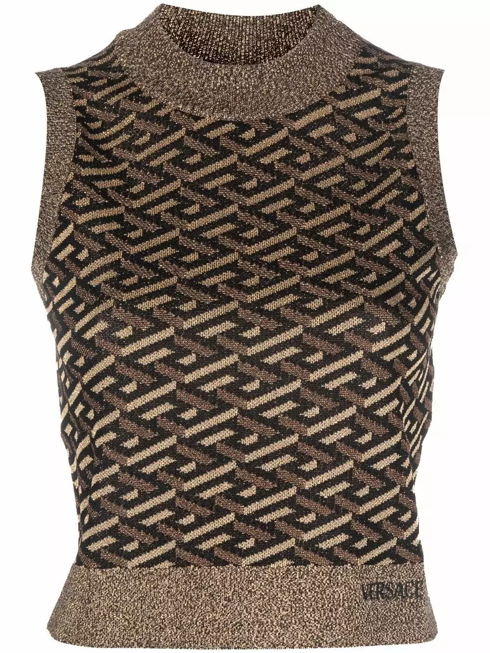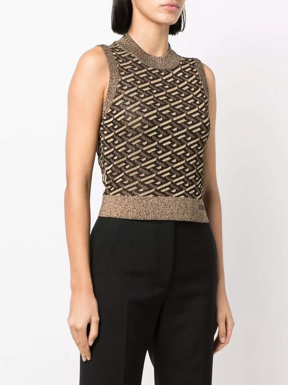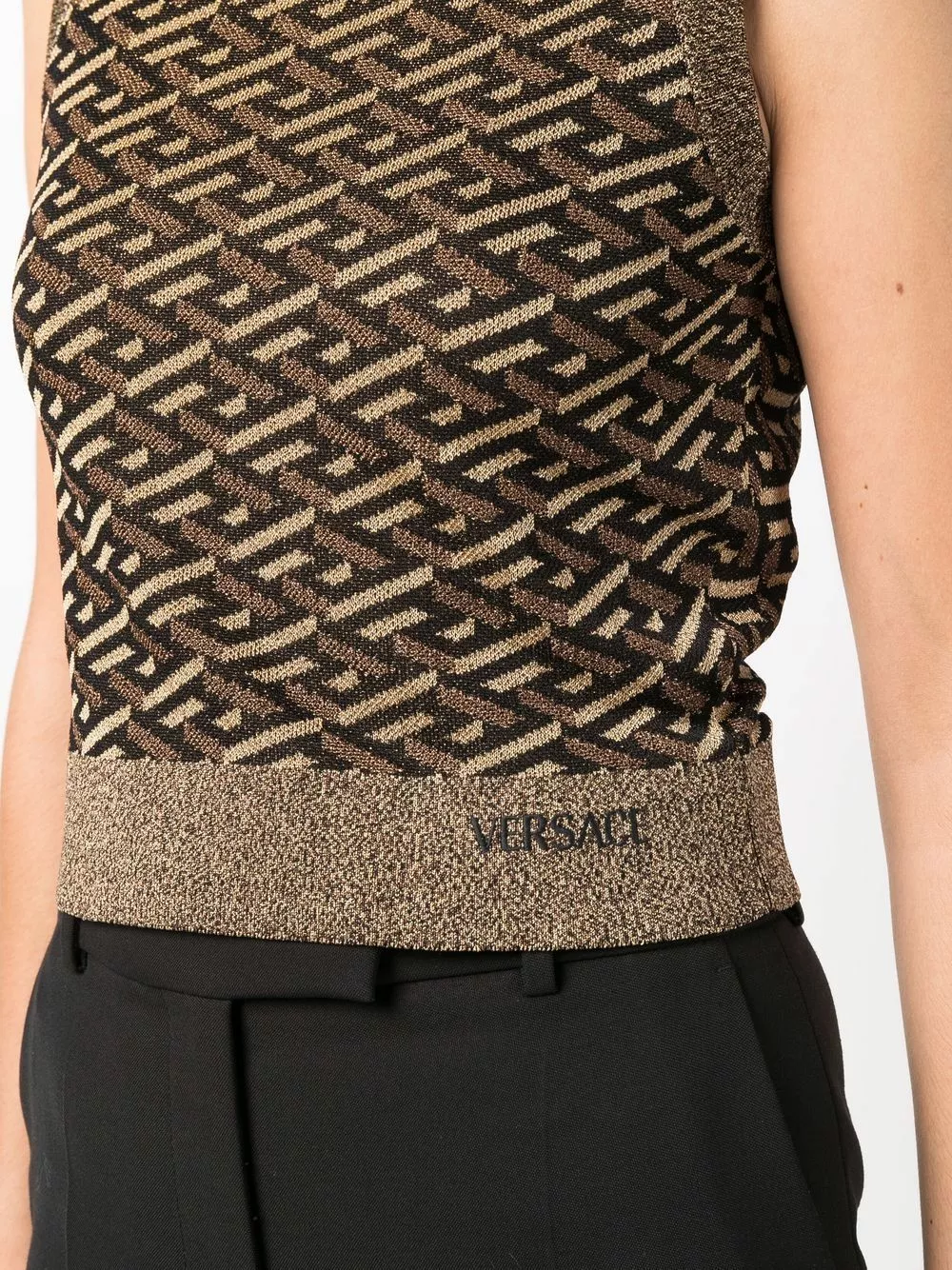 Inspired by Ancient Greek pottery, Versace’s Greca Key pattern is a key indicator for the brand, reimagined for AW21 with a 3D effect. Woven with metallic thread, the historical print decorates this vest.
