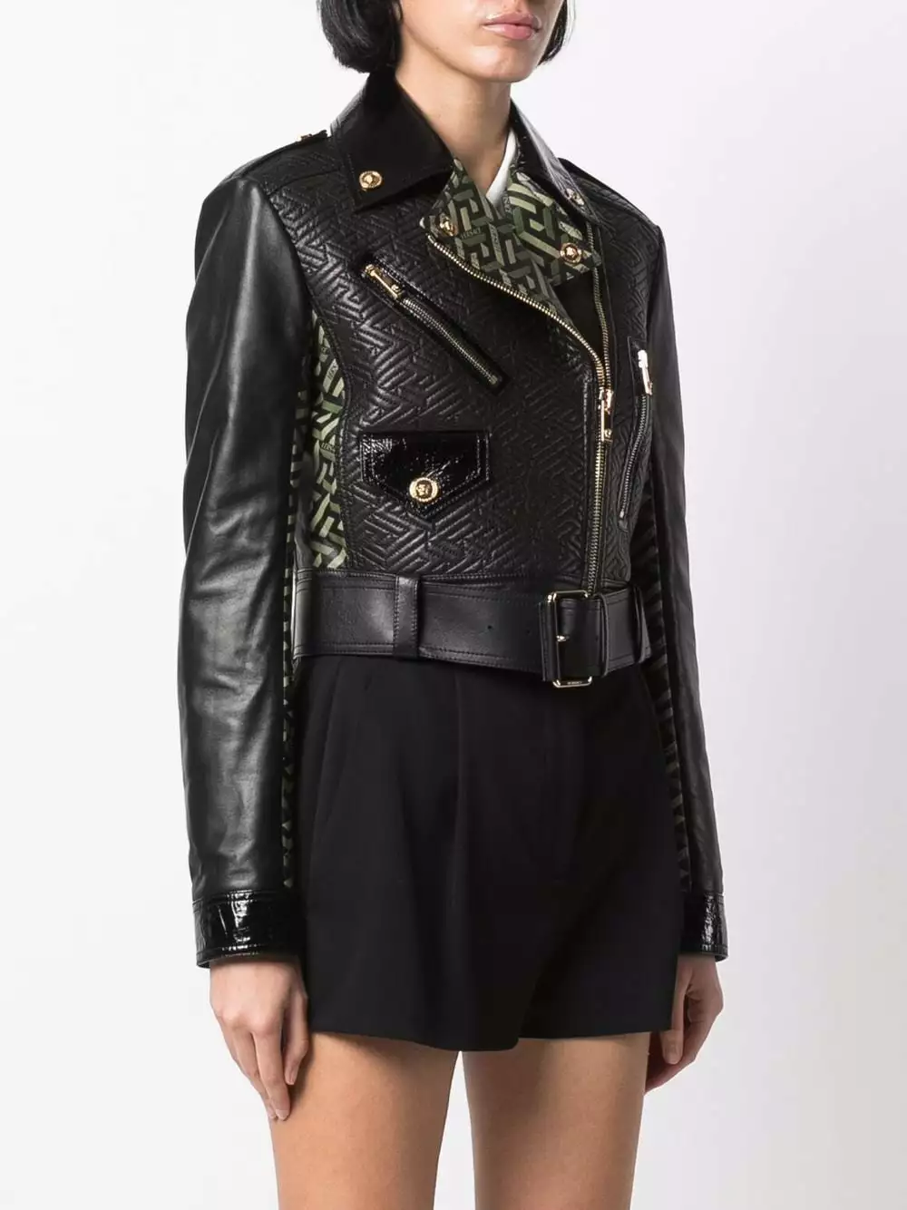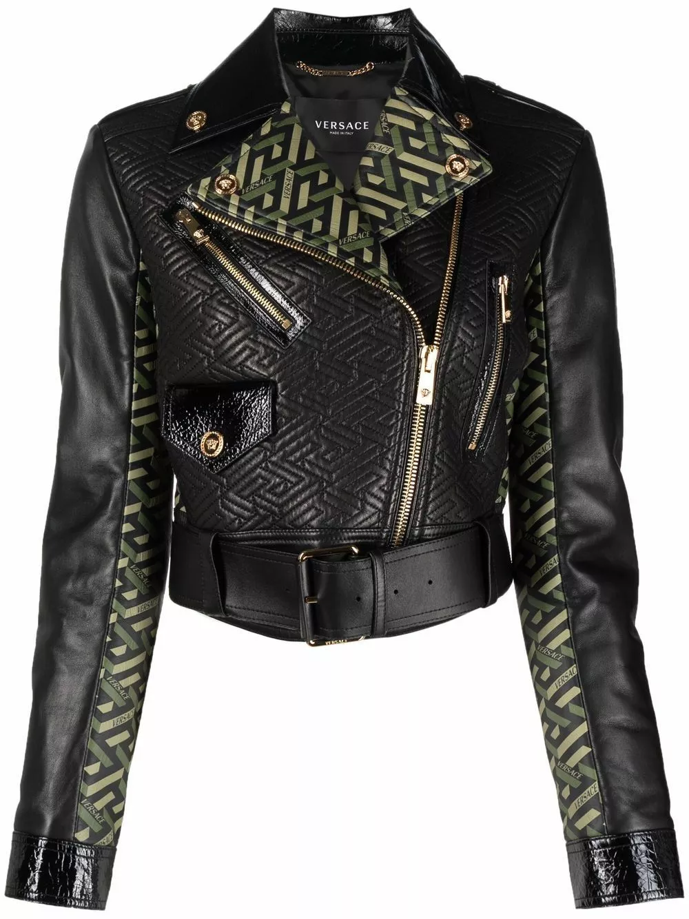The classic biker jacket gets the Versace treatment for AW21. This lambskin staple boasts the label’s signature La Greca pattern in printed panels and tonal stitching.