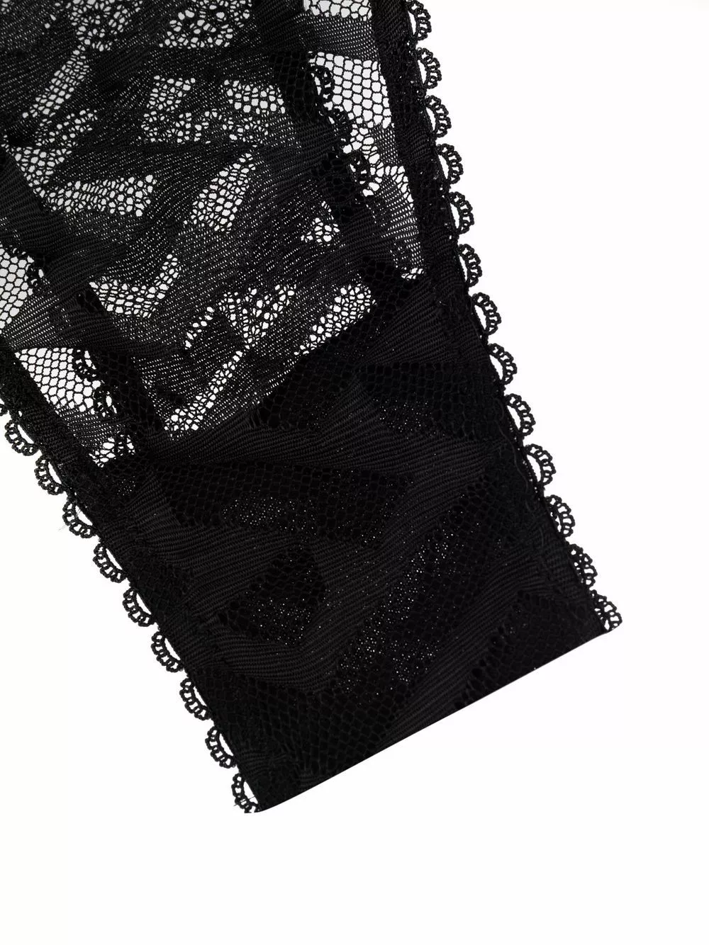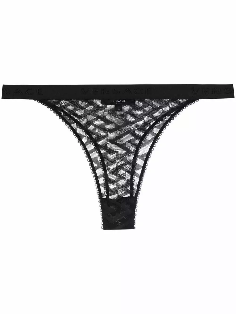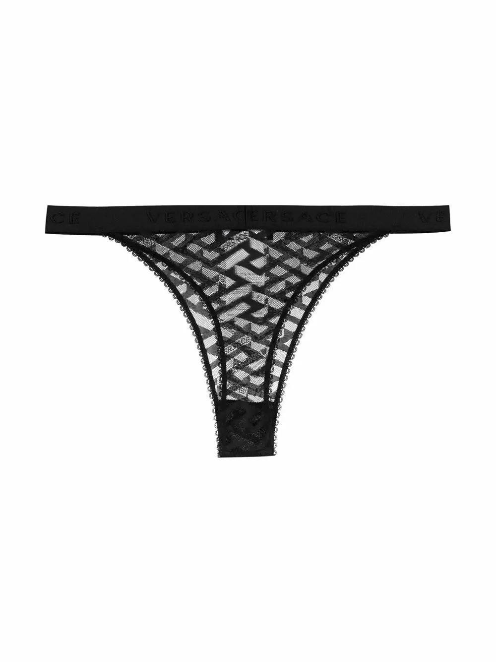 Versace steps away from its signature motifs to present this semi-sheer thong. Designed in a black hue, this piece is punctuated by mesh detailing and lace trim.