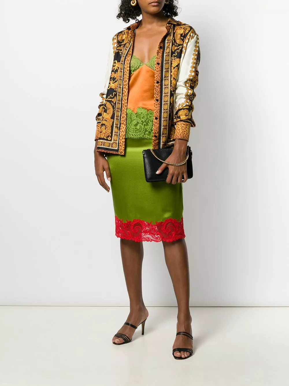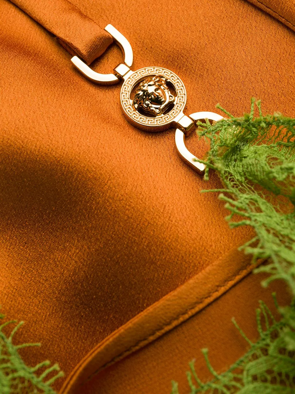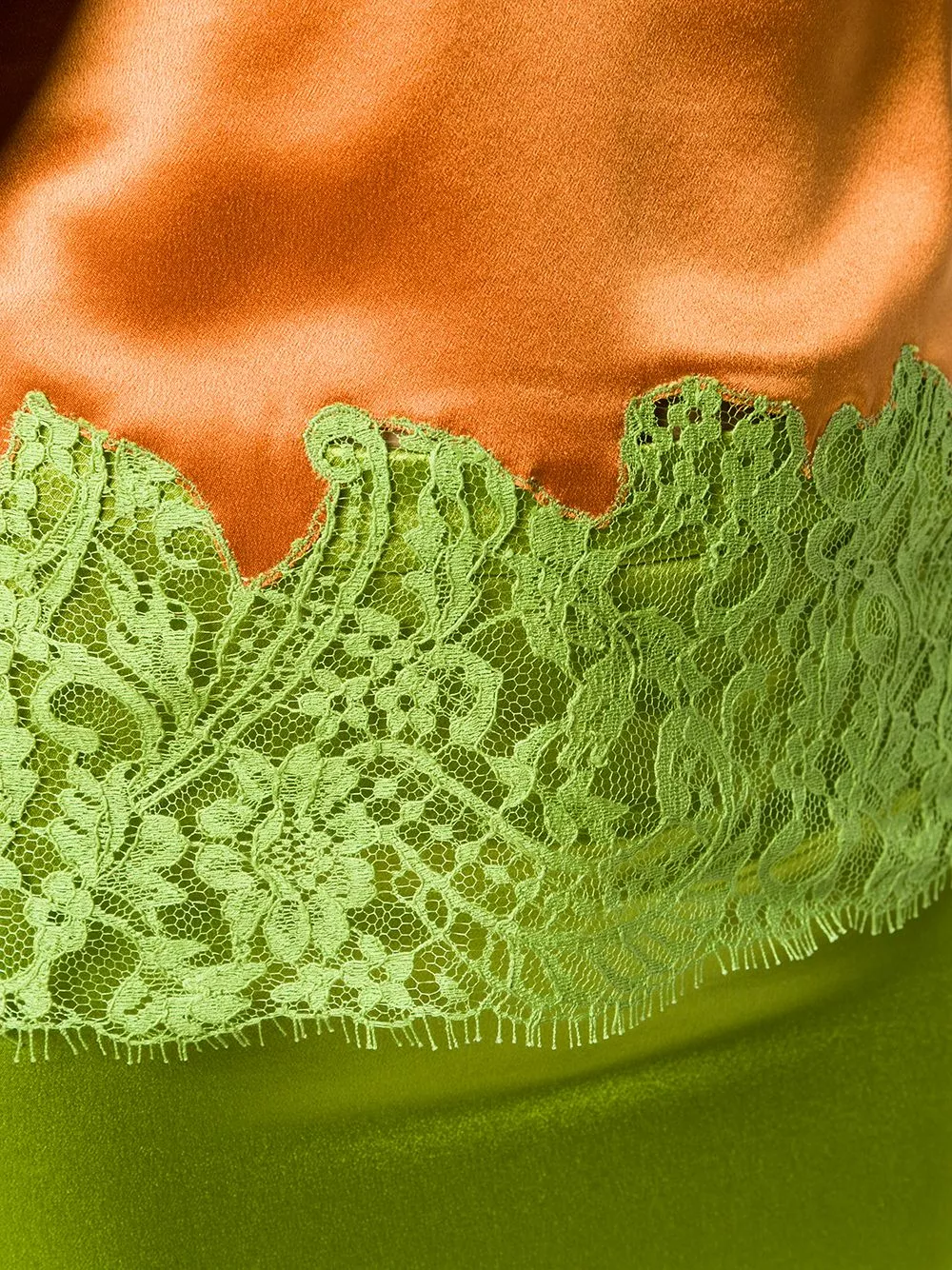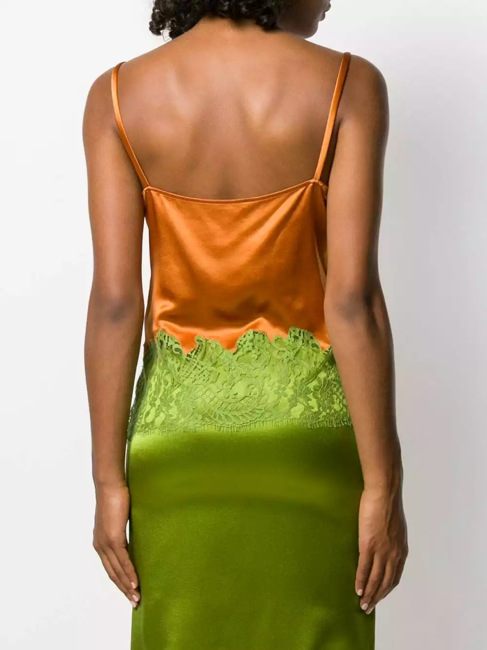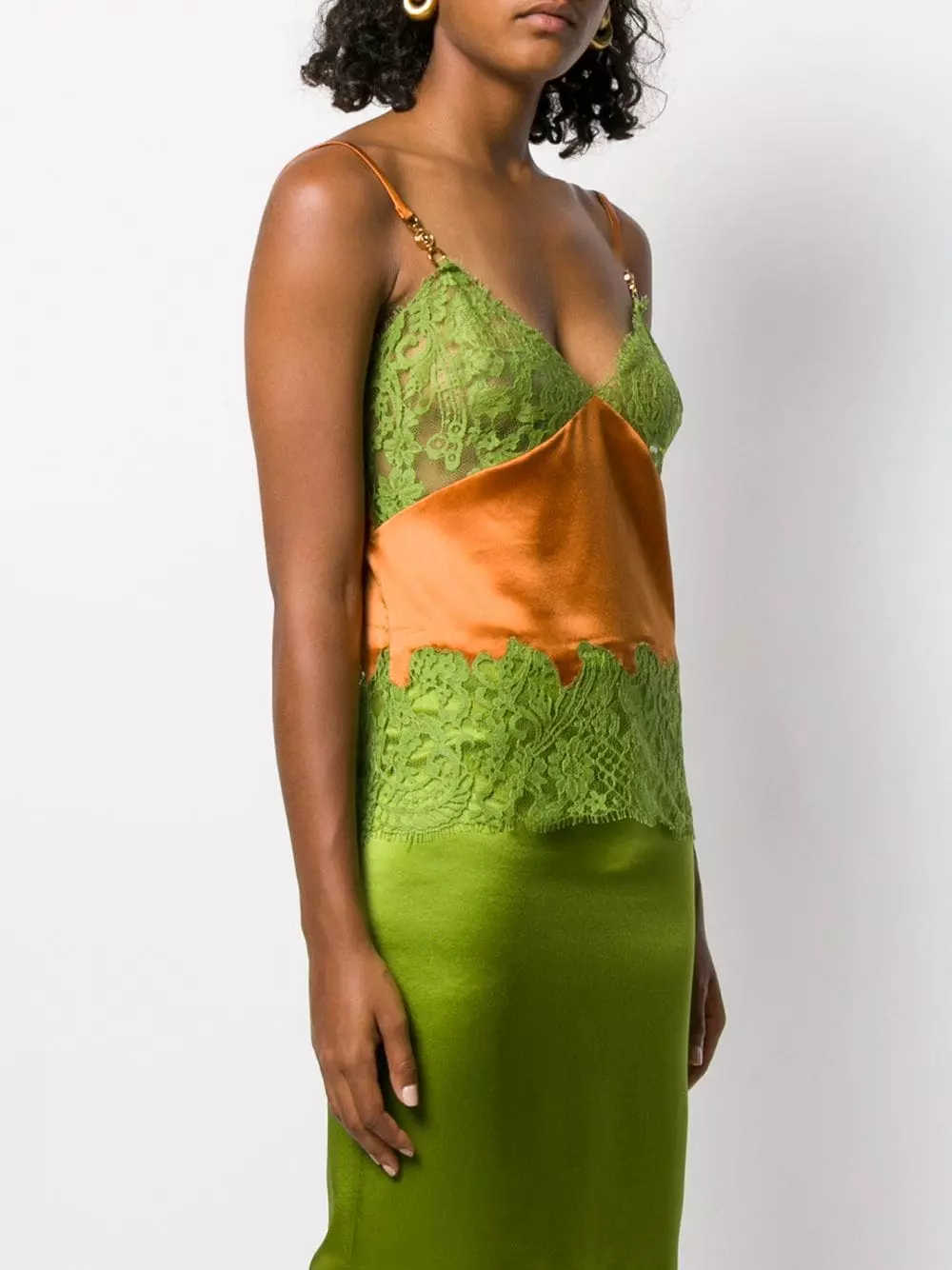 Thinking about going to a sunset party? Make sure you’ll be at your best with this orange and green lace-trimmed cami top from Versace. Designed with lace details, this piece will guarantee a sexy vibe anytime. Let’s go.