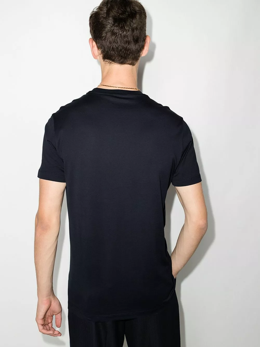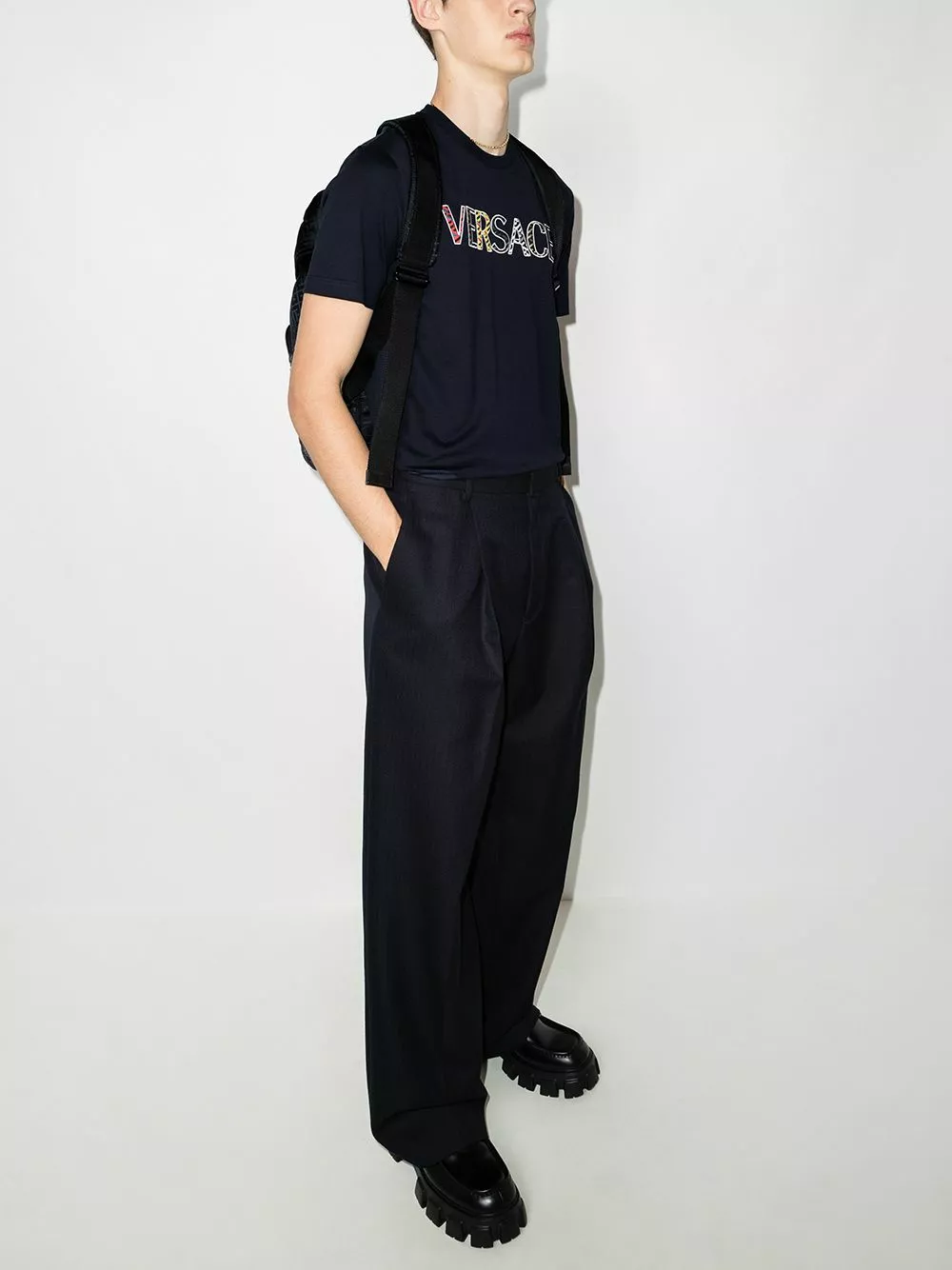 Versace adds its signature twist to a wardrobe staple with this navy blue T-shirt. Made from cotton-jersey, this short-sleeved tee is defined by multicoloured logo appliqué to the front.